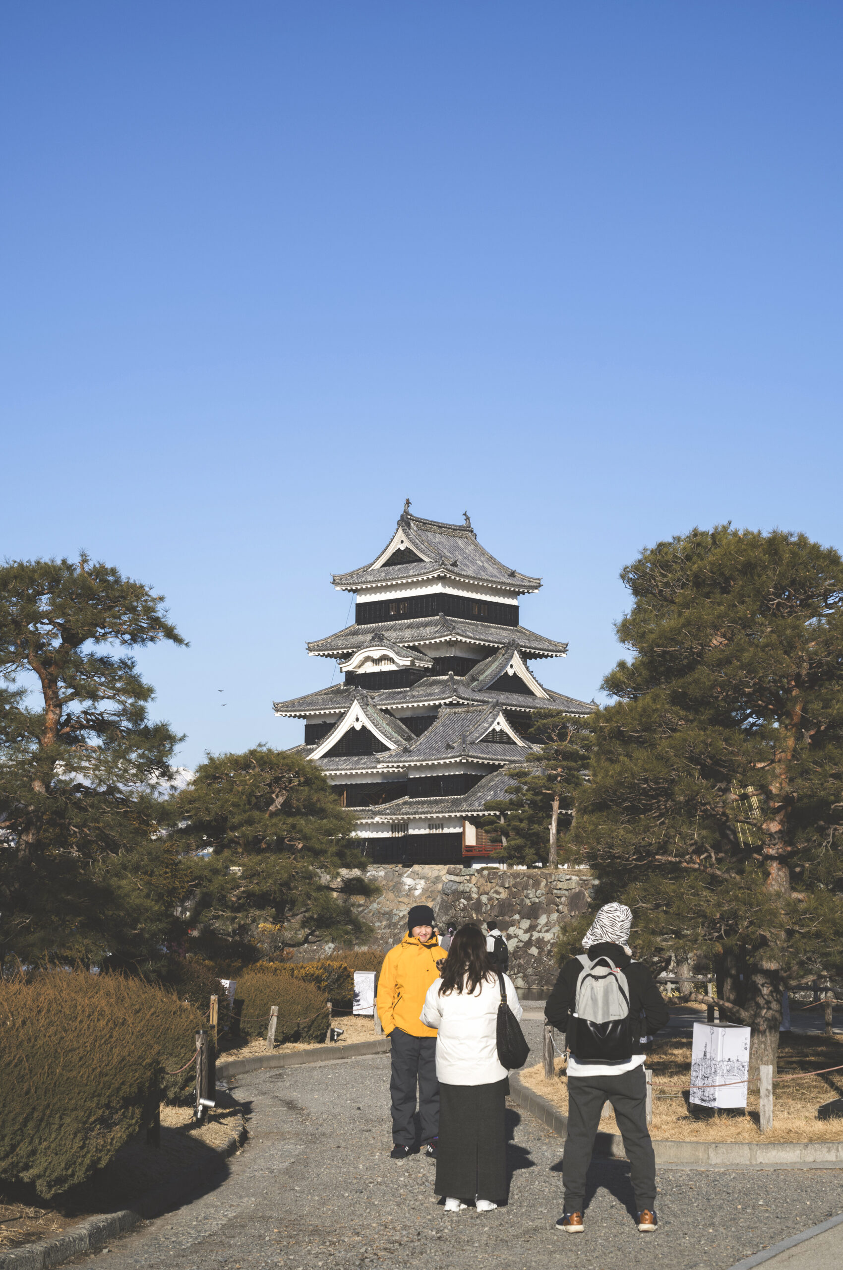 美しき城 2025.12.28 矢口です。 美しき城。 冷え切った空気、広がる青空、雪纏う常念(槍の穂先もちょこんと)と雪囲いされた松。 その冬景色に日差しを受けて凛と立つ黒と白に輝く松本城、今朝のお城は一際美しかった。 年末の休みに入ったお城は朝から来城者も多く、「Beautiful〜」なんて国内外ツーリストの声も聴かれ賑わっていました。 高麗門と太鼓門に据えられた門松も相待って正月の風情を感じられる場所、お城が存在する街の魅力を改め感じます。 皆さま、本日も良い一日に!