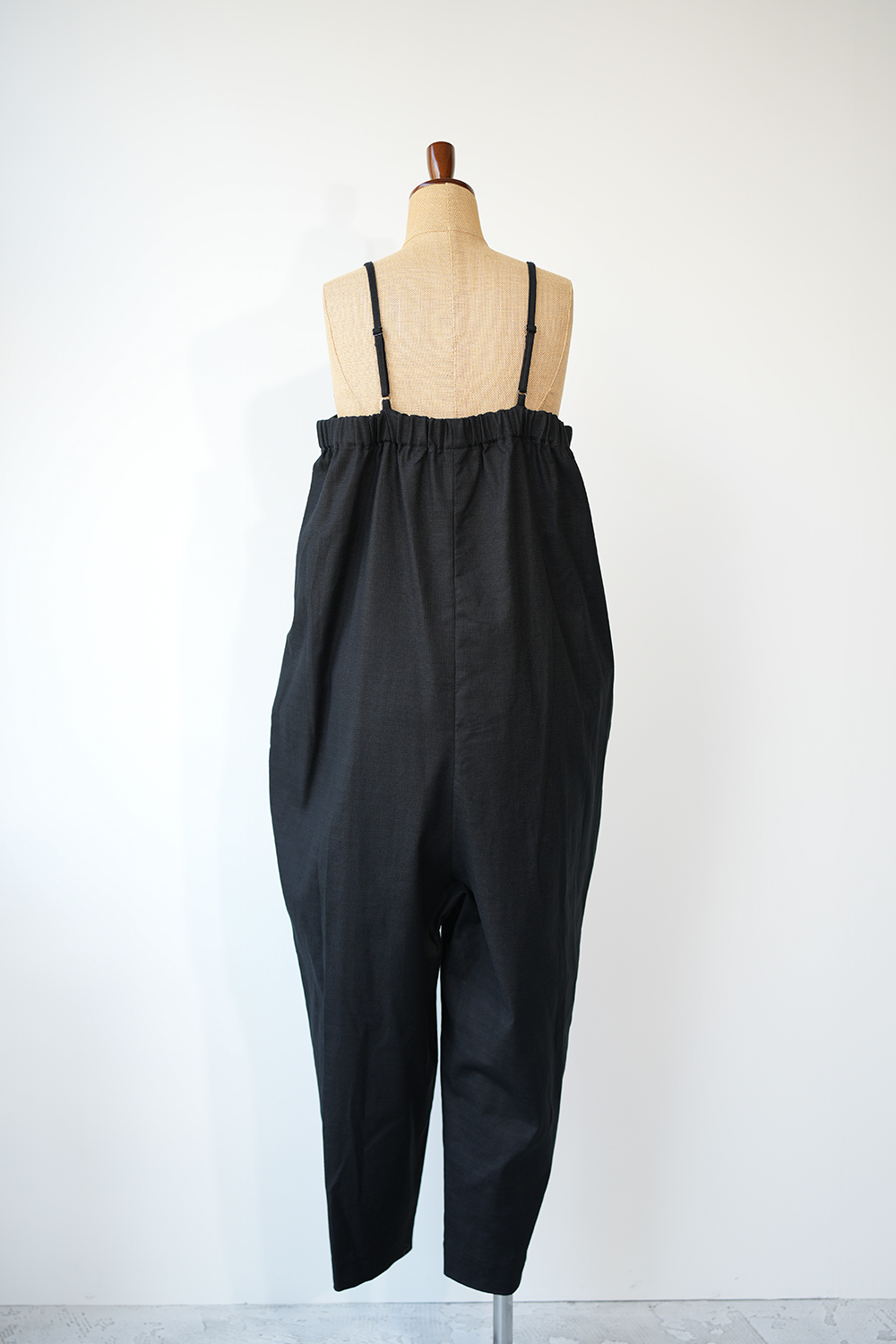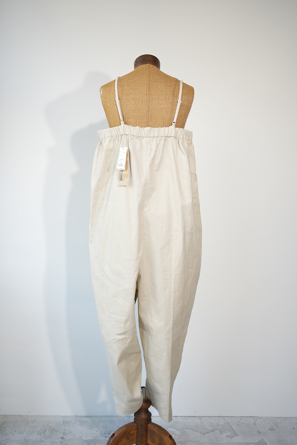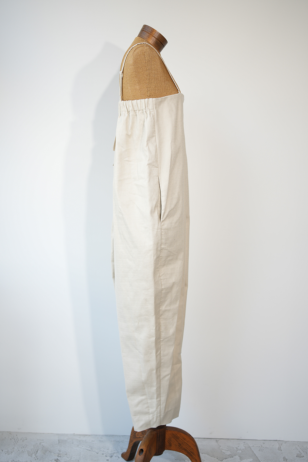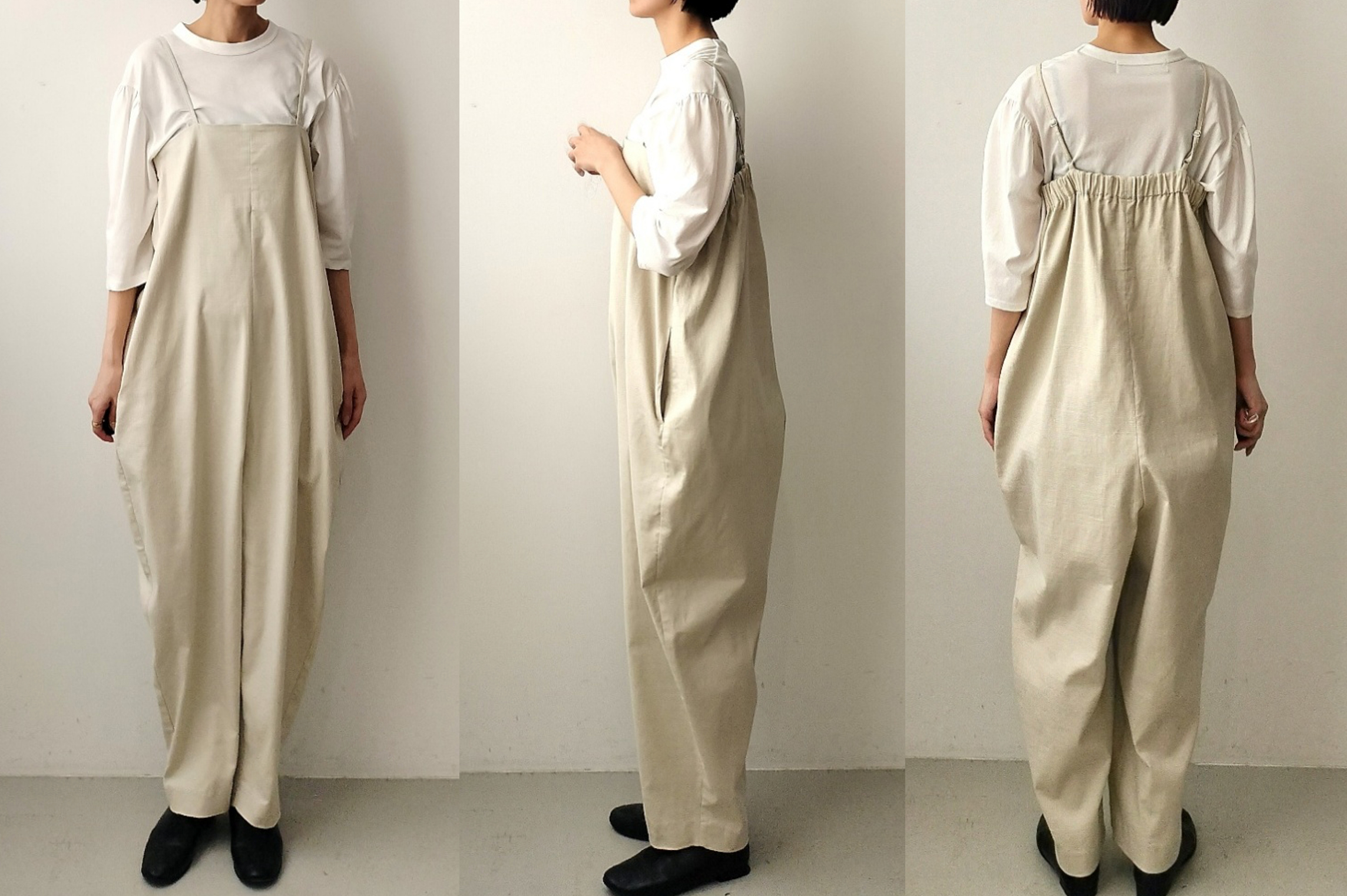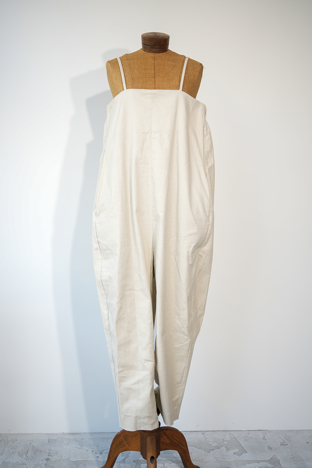麻のような凹凸感があるコットンブッチャー素材をセミフォーマルな雰囲気に落とし込んだ丸みあるシルエットのサロペット、肩ひもで丈感の調節が可能です。