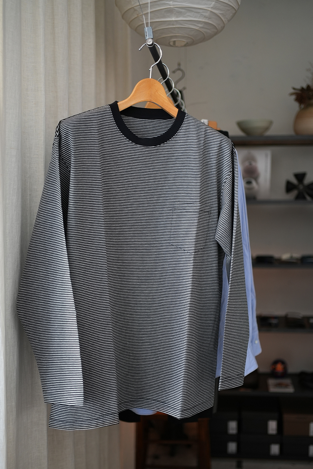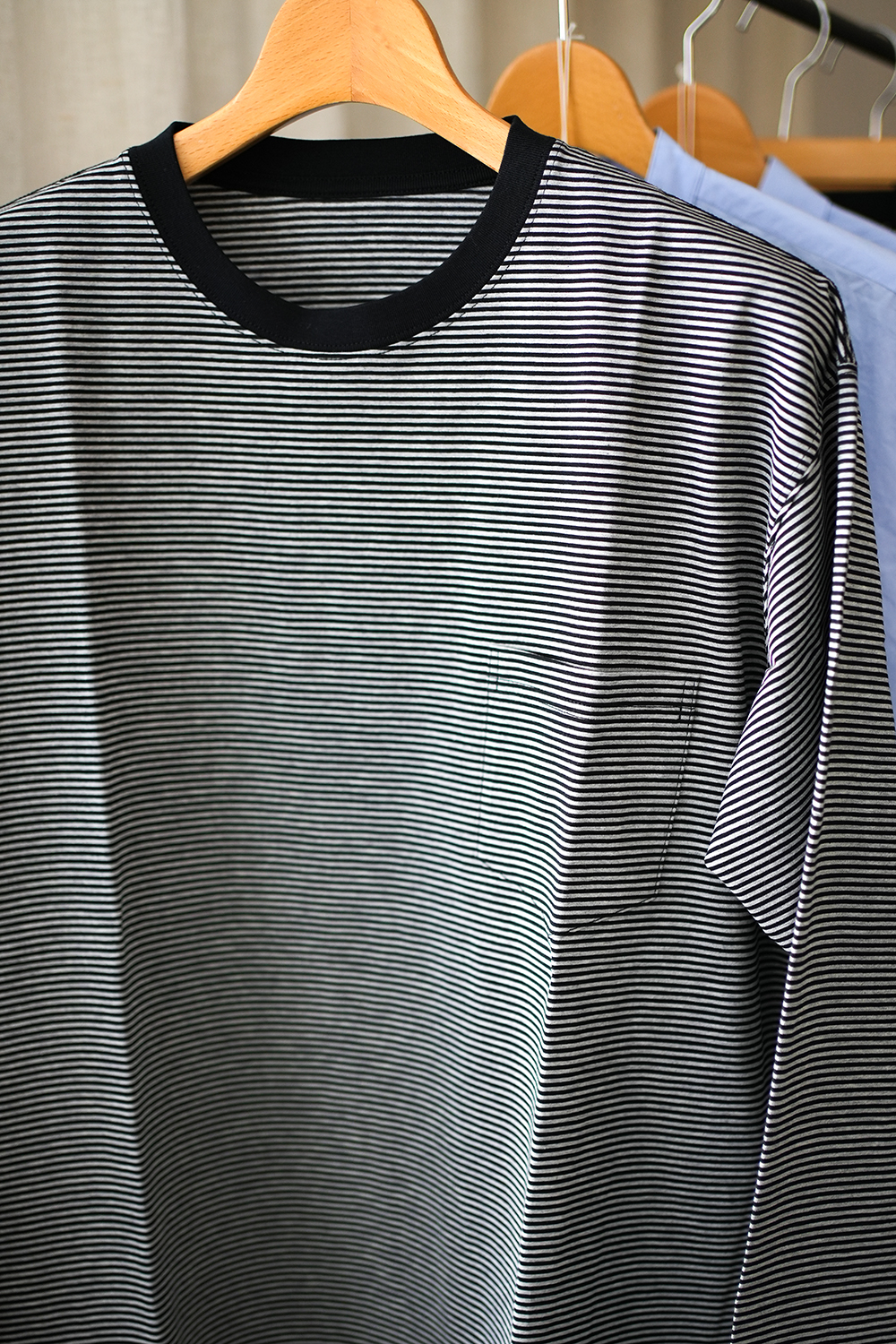 「EEL Products」HI QUALITEE L/S 2026.01.17 <MEN’S ITEM> 「EEL Products」HI QUALITEE L/S、入荷。 超長綿をしなやかに編み立て表面の毛羽をボイル加工することでより肌触りの良く仕上げてた生地、ボーダーロンT。 「EEL Products」 HI QUALITEE L/S ¥15,400- カラー/black×F/grayボーダー サイズ/S・M 素材/コットン100% E-26507