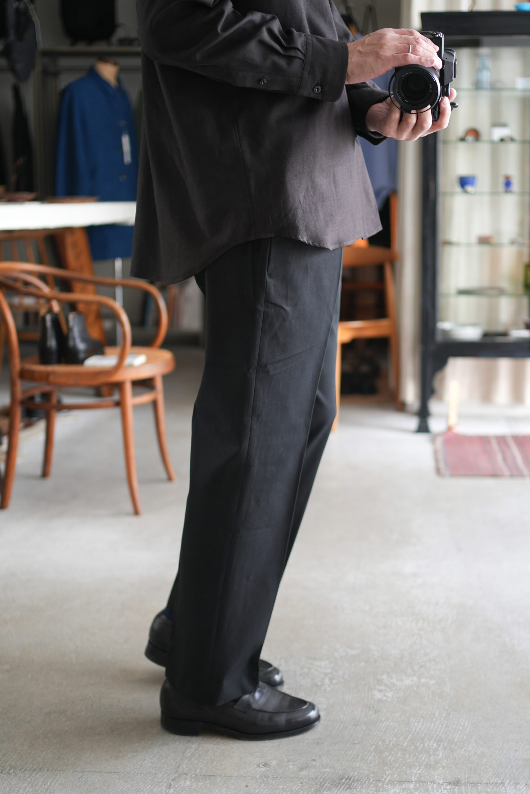 遠州地方の機屋にて 製織したオリジナル素材。経糸にレーヨン、緯糸にコットンを使用したビエラ素材。優れた吸湿性と、上品な 光沢のあるドレープ感が特徴。特殊な 染色方法と仕上げ加工を施す事で 、更に品やかさと光沢感が加わり、独特な 上品さと洗いざらしの風合いを持つ生地に仕上がりました。