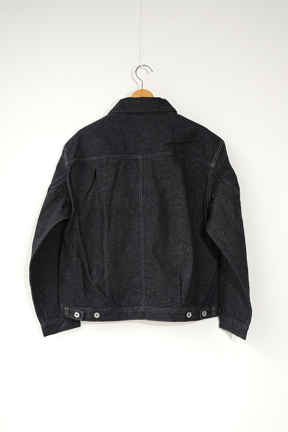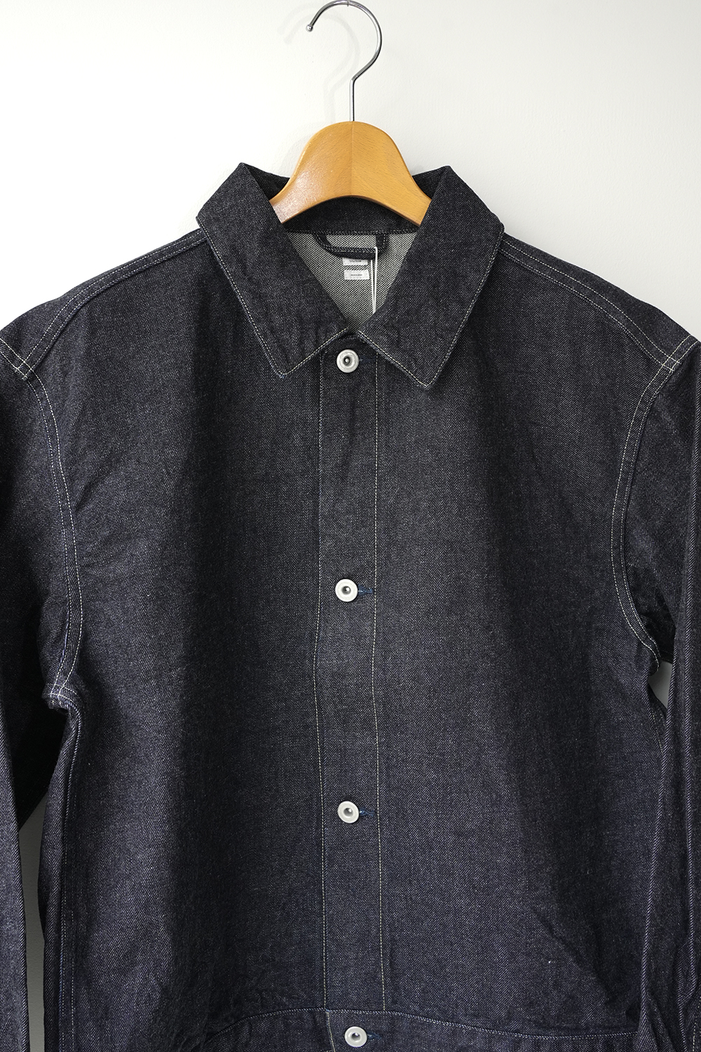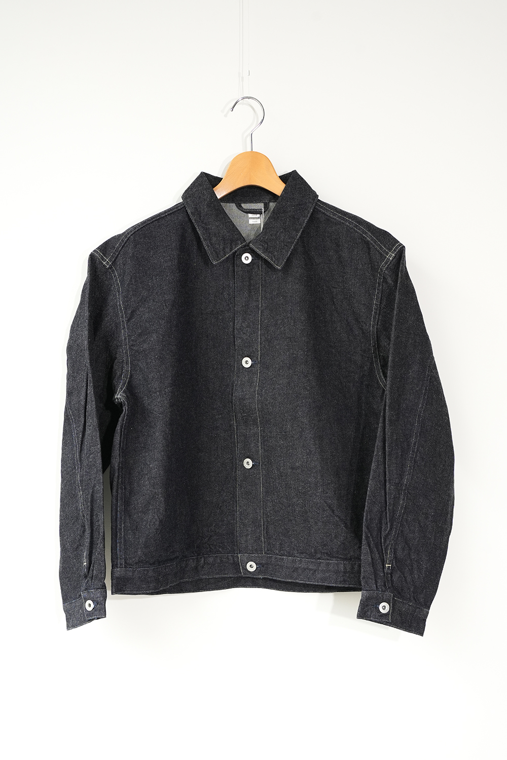 前にヨークや切り替えを無くしたデニムジャケット 少しムラのある糸と落ち綿を使用し表面に強めの毛羽立ちや独特の柔らかさが特徴のオリジナルデニム生地を使用しています。※ワンウォッシュされた商品の為、色やサイズに個体差がでます。