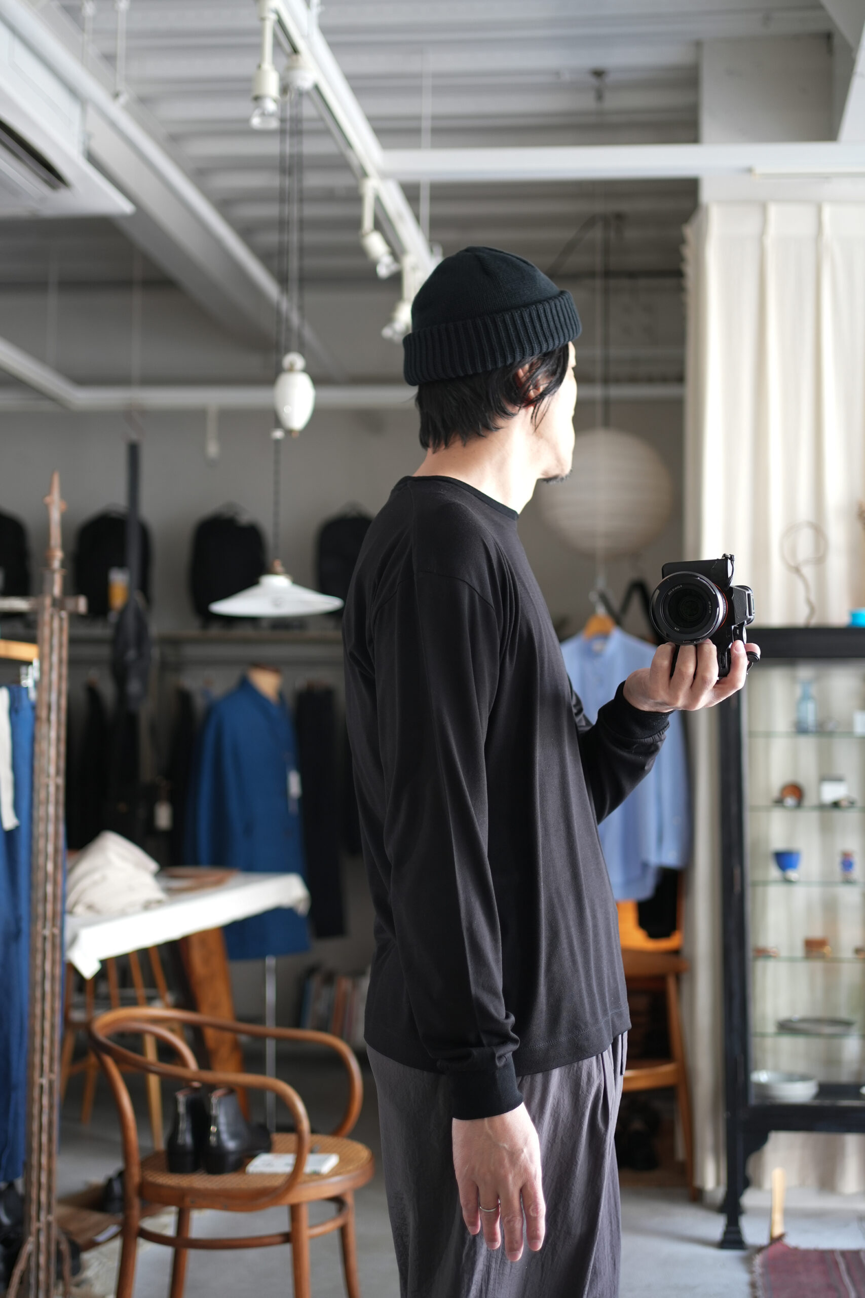 「MARKAWARE」SUPER 160s WOOL WASHABLE KNIT LONG SLEEVE TEE & 「Blanc YM」Salt Shrink Cupro Browsing Pants