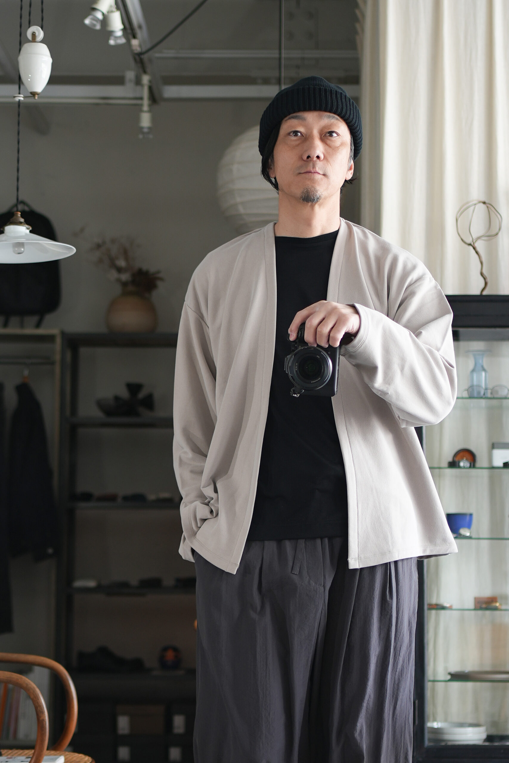 新しい価値観のある裏毛素材。定番となった独自の光沢感と風合いのキュプラ裏毛。28G高密度裏毛機で度詰めに編立てた新裏毛素材。表糸に105D高収縮キュプラ糸を使用。生地加工で、フィブリル加工(繊維の中の小さな繊維、を摩擦させ、表面を毛羽立たせる加工)することで 独特な光沢感と、ヌメリ感がございます。肌面には、スビンコットン双糸を使用してさらっとした着心地がございます。他にはないとろみが特徴です。スウェットと天竺の間の肉感にて、オールシーズン着用頂けます。新型のボタンレスカーディガン。さらっと羽織りやすいシルエットが特徴。なるべく素材の良さがでるように、仕様を工夫しております。