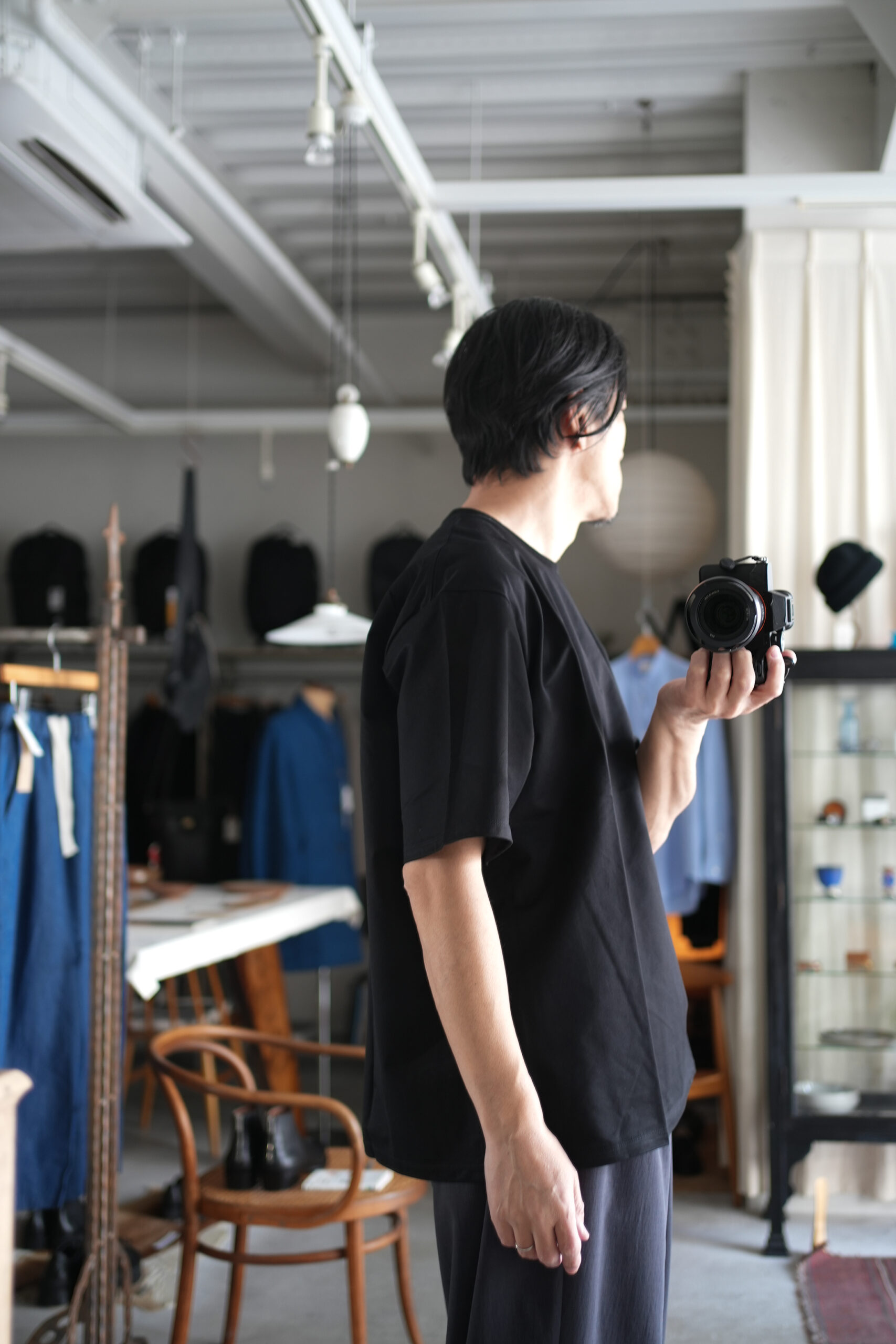 和歌山のニッターさんに編み上げて頂いた36Gス ーパーハイゲージ ニットのオリジナル素材。日本に数台しかな い大変稀少な編み機を使用して36Gと言う極めてハイゲージに編み上げたもはや布帛の様な 天竺素材。キュプラの強撚糸と綿の強撚糸を36ゲージの超ハイゲージで 編み上げ。表面にキュプラ、肌に当たる裏面にコットンが来る様に設計されて おります。一般的な天竺で は味わえ な い上品な光沢感とドレープ感があり、優れた吸湿性と抜群の肌触りが特徴で す。
