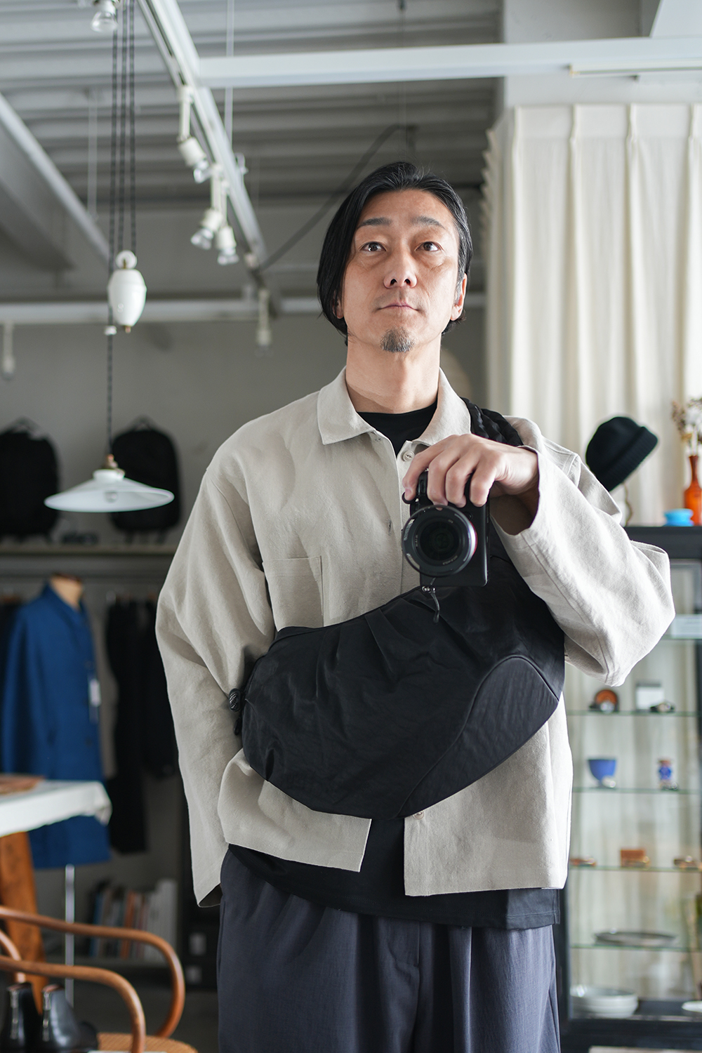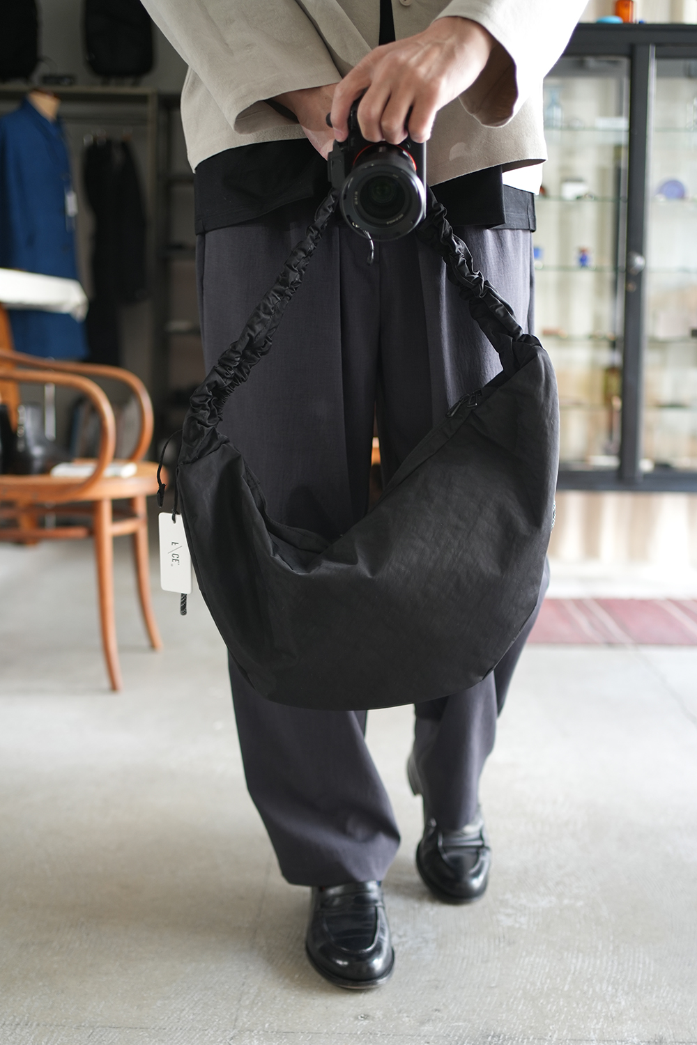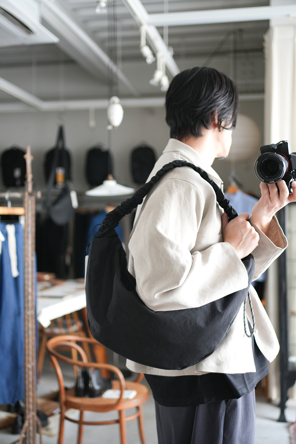ショルダー部をコードで長く短くの長さ調整が出来る、底のパッドで自立するボディバック。アシンメトリーなパネリングと計算された無数のタックが独特な立体感を生み出す。底マチ部分の一部には芯材を入れバッグ全体に厚みと彫刻的な構造を持たせることで、既存のボディバッグとは一線を画すデザインに仕上げています。ショルダーにはロープを採用し、自在な長さ調整が可能。コンパクトなサイズ感ながら、機能性と造形美を兼ね備えた新たなプロポーションです。本体素材には、水洗い加工を施したTEXTURED TWILL NYLONを使用。シワ感とカラーの濃淡が製品染のような深みと味わいを生み出しています。