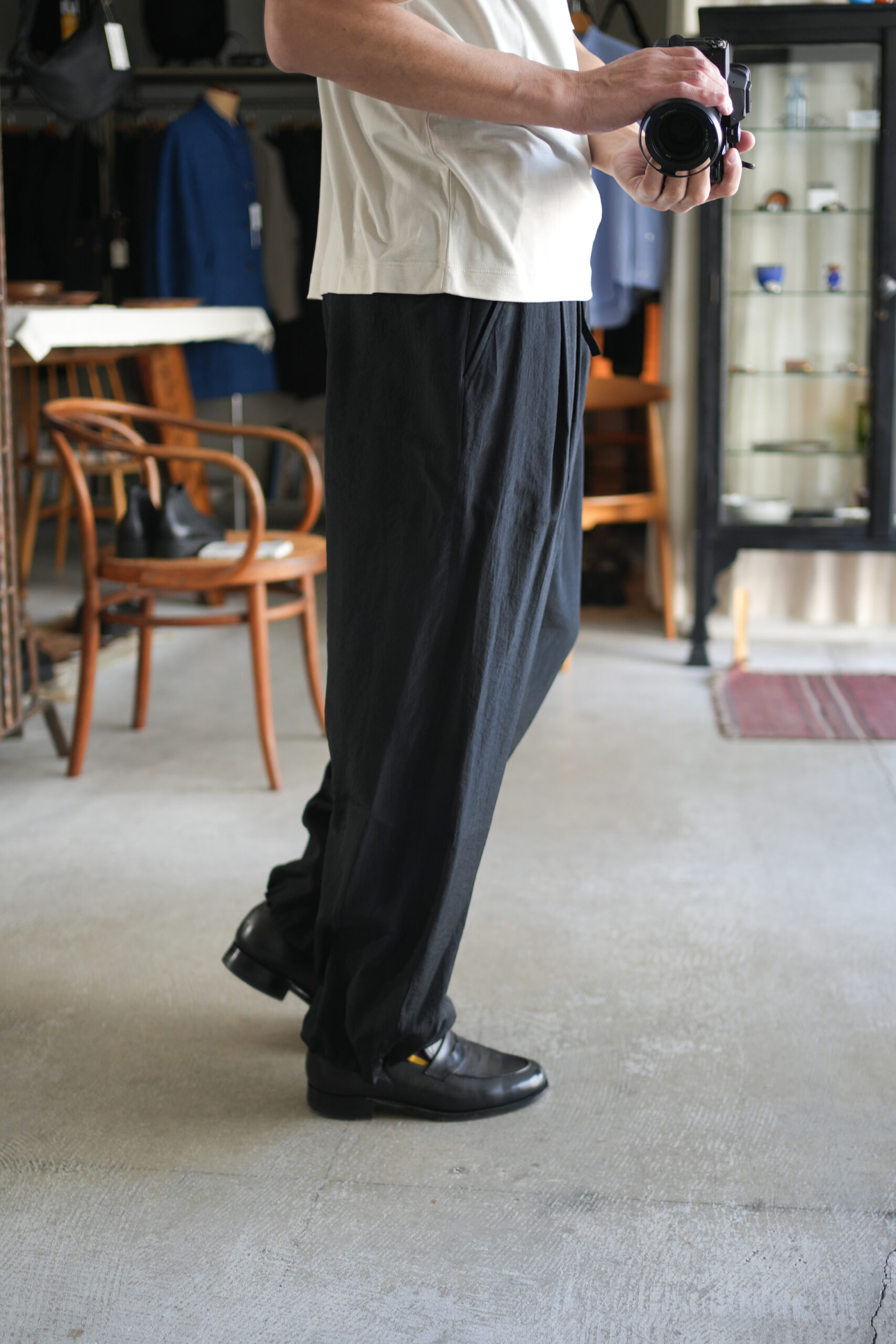 ワイドストレートシルエットのイージーパンツ。考え過ぎずラフに着用が出来て、様々なトップスやシューズとも相性が良く汎用性の高いパンツです。裾にはアジャスト可能なストッパーとスピンドルが付属し、ややテーパード的なフォルムからバルーンまで変容する気の利く仕様です。ウエストにはベルトループ風のキーループも配置。Salt Shrink Cupro生地。北陸地方の老舗の機屋でおられた経糸キュプラ×緯糸リサイクルナイロンのタフタ素材。上品な光沢とドレープ性がありエレガントな印象ながら塩縮加工を施すことでヴィンテージの様なシュリンク感、柔らかな風合いに仕上げています。適度な照感と塩縮加工により、何処か90sのスポーツウェア感とモード感も同居した生地。