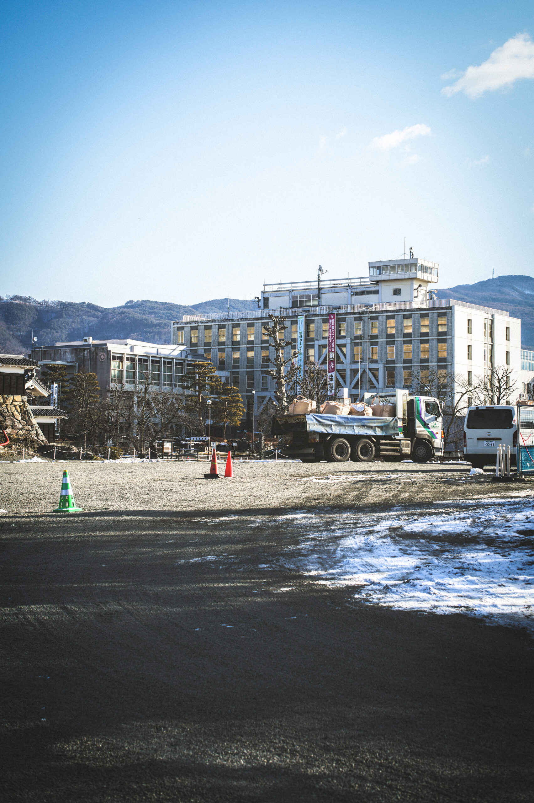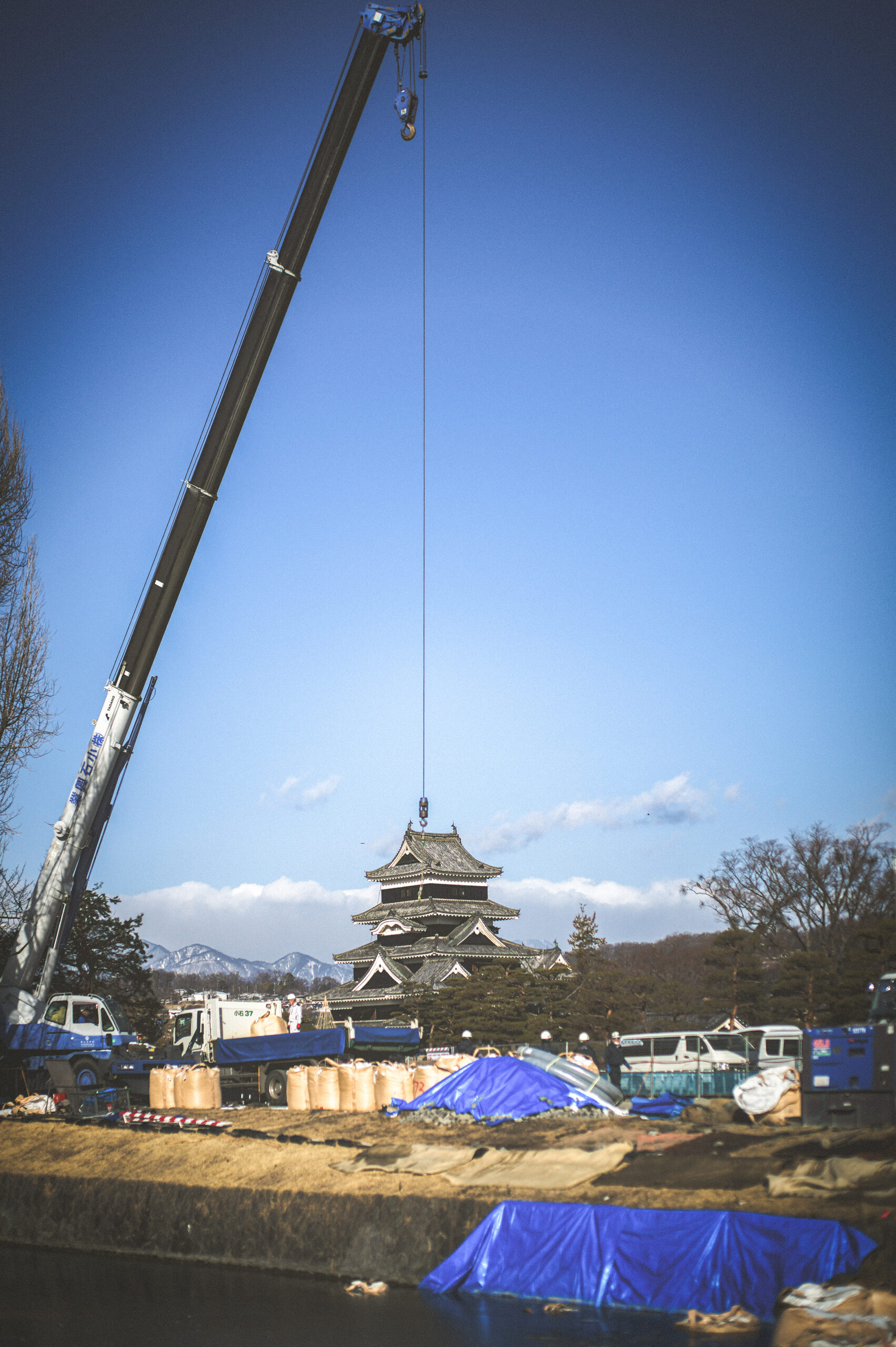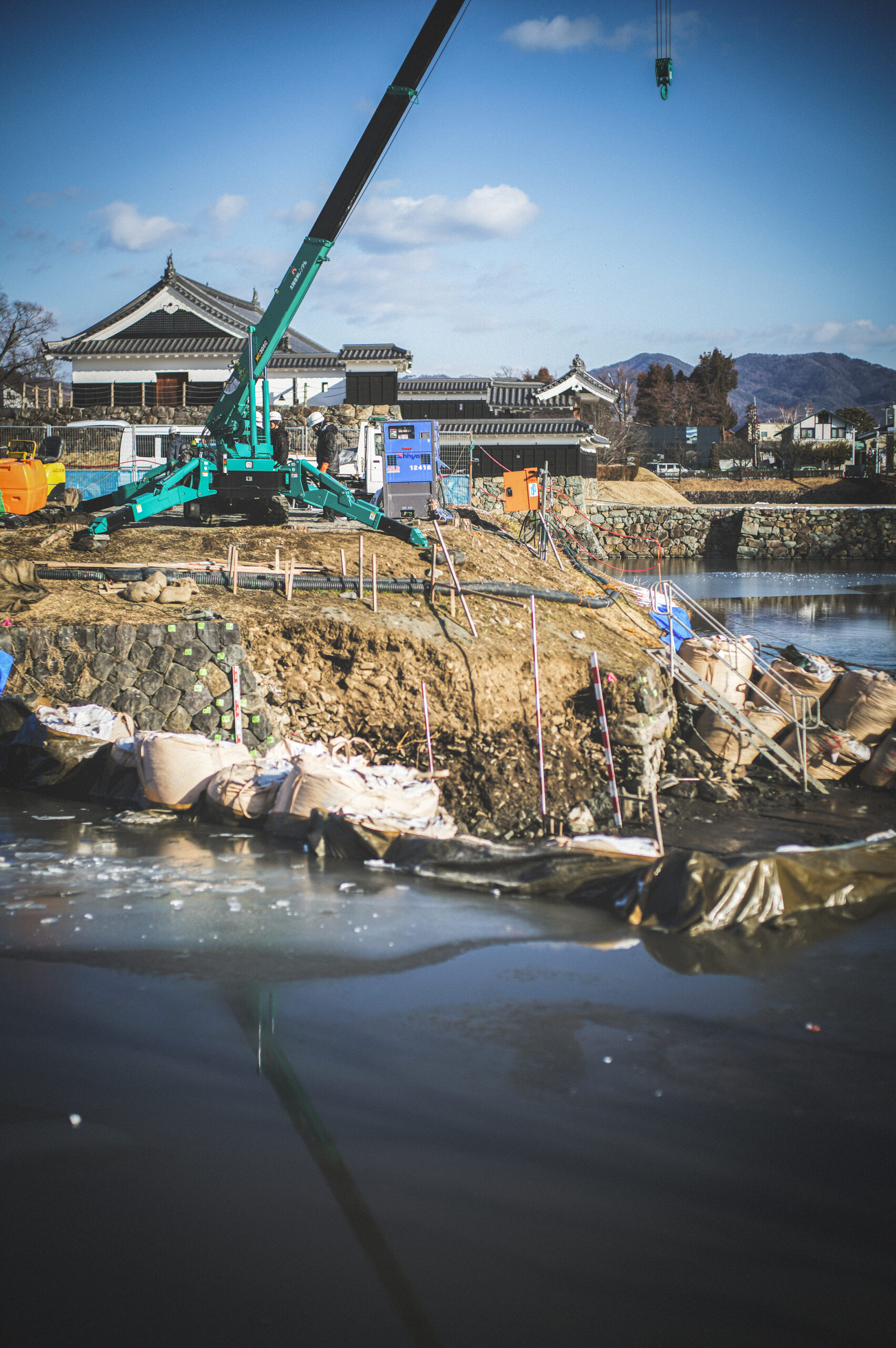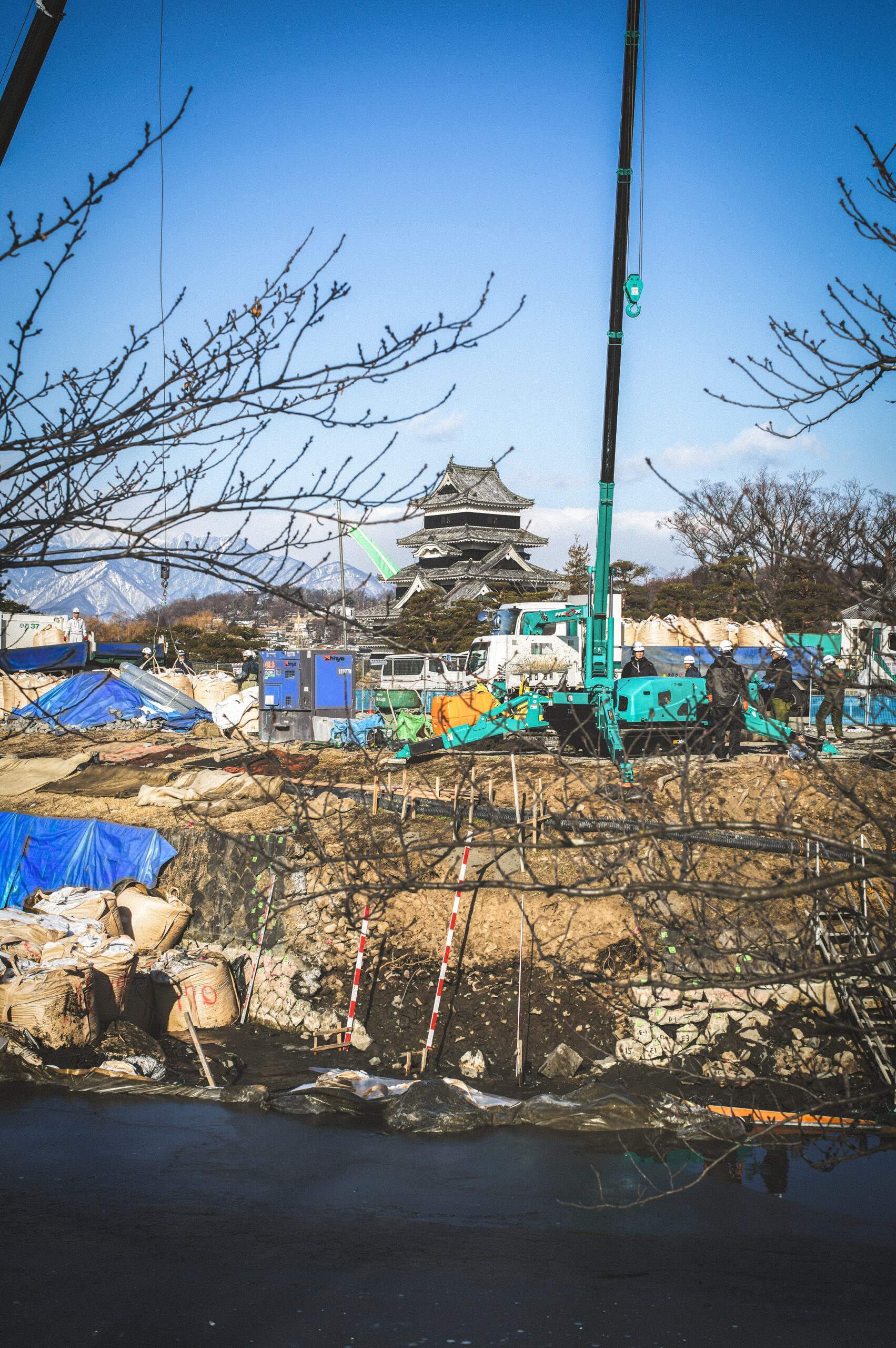 厳しい寒さが続く今日この頃、松本城では南東側のお堀石垣の工事が始まった。