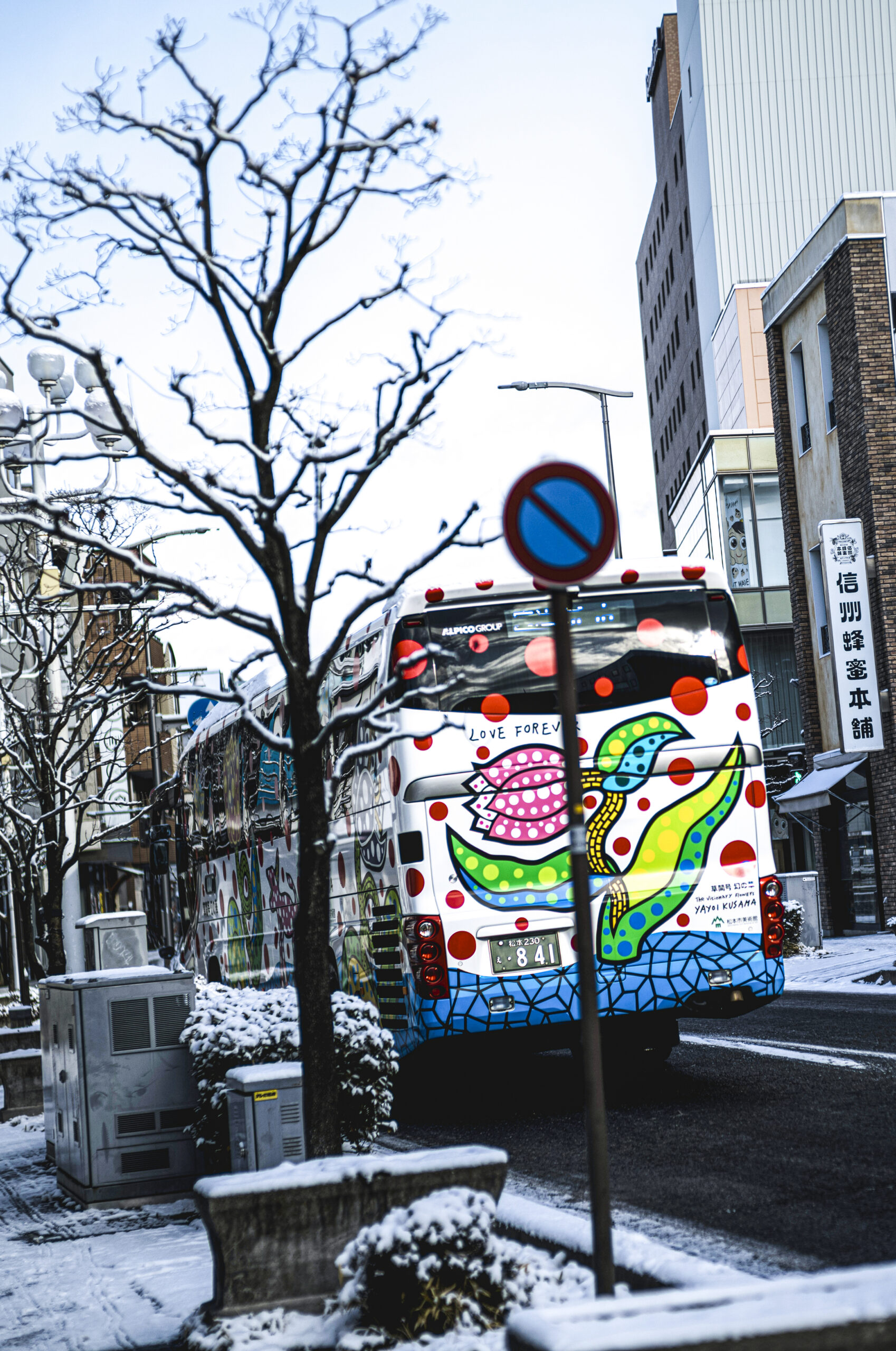 道歩く最中、新宿に向かう草間彌生ラッピング高速バスが通り過ぎた。