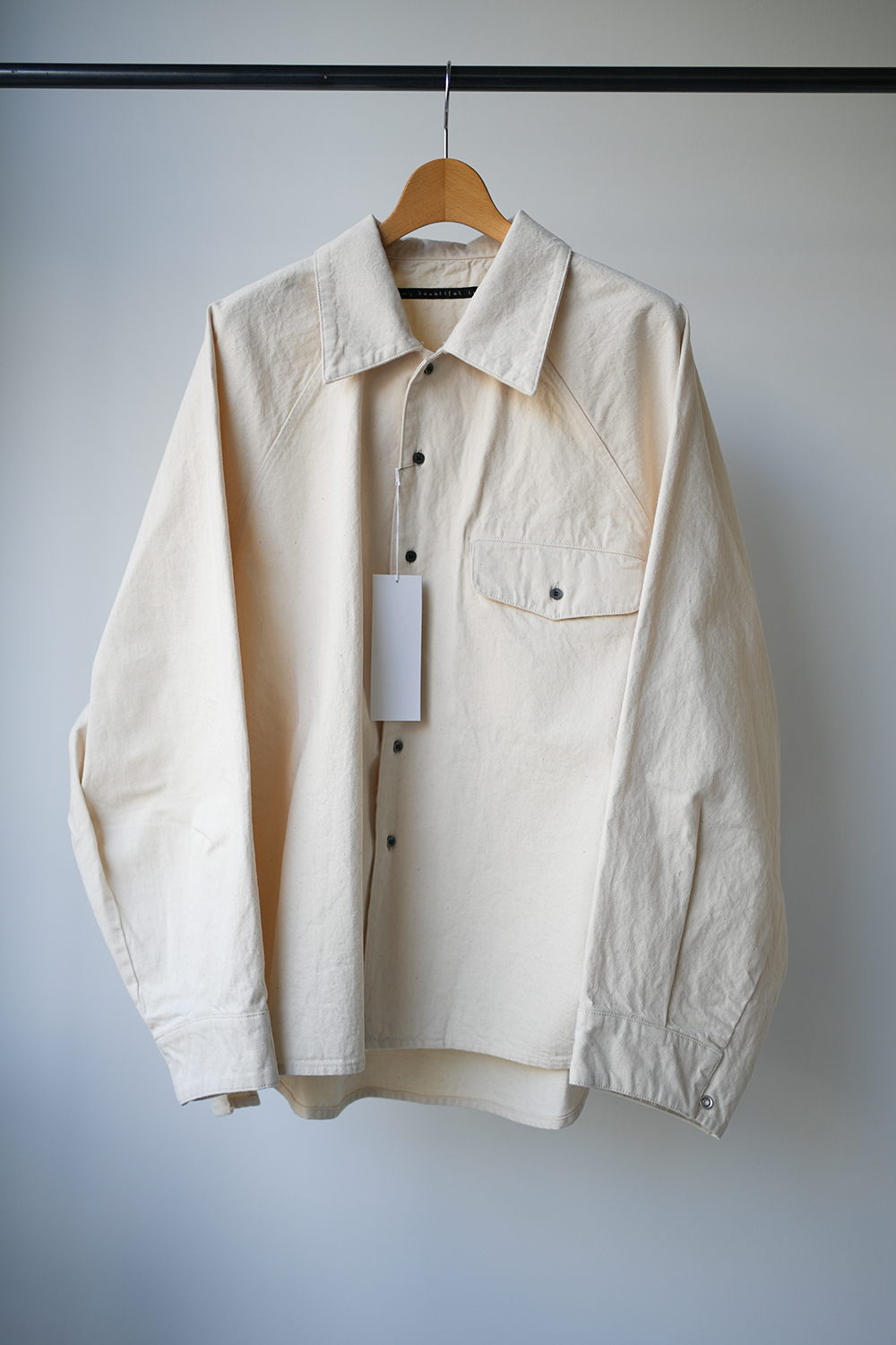 10ozのデ二ム生地を使用したジャケット感覚のシャツとカーゴワイドデニムパンツ。顔料プリントを施し縫製後に洗いをかけることによる独特の風合い。