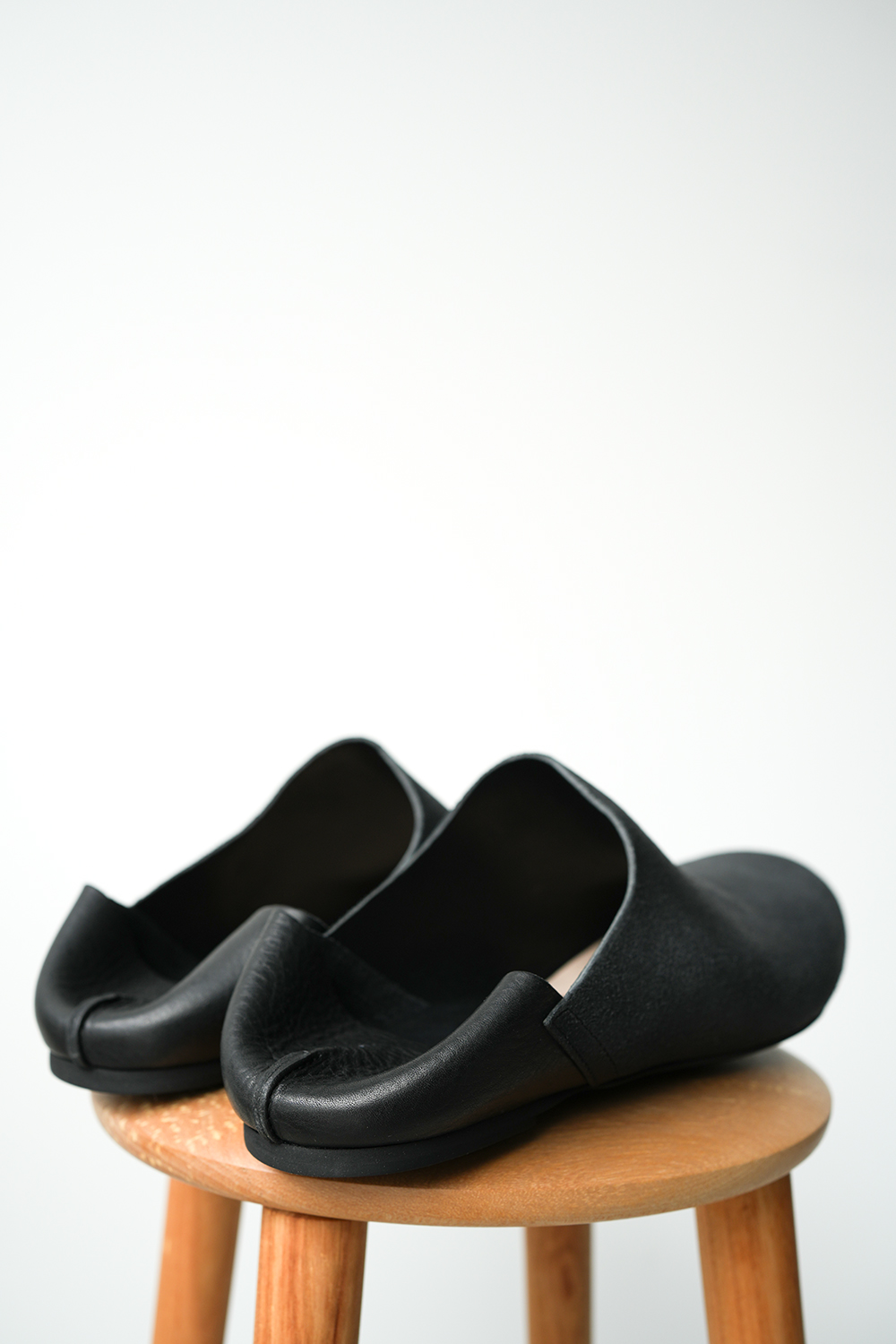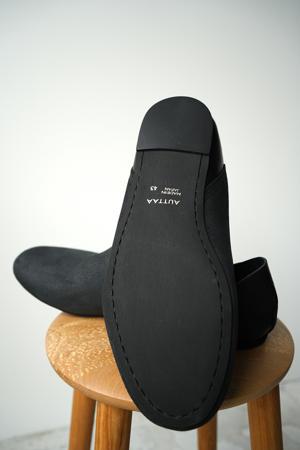 「AUTTAA」は、デザイナー新井 直子さんによるメンズ&レディースのシューズブランド、フィンランド語で「助ける」の意味。新品が完成ではなく、靴を仕上げるのは履く人自身と捉え、美しく経年変化していく様を楽しんで欲しいという想いが込められています。「甘くないハンドワーク」「シックと野暮ったさのギリギリのライン」 「中性的な感覚と品」をデザインコンセプトに上質な素材と伝統的な製法で熟練の職人の手によって一つ一つ作られる革靴のレーベルです。1枚革で仕立てられたバブーシュの様なルームシューズ、ラバーソール+マッケイ製法により外での着用が可能な仕様となっております。かかとはあえて折りたたんでいるデザインとなります。その為上げて履くことを推奨しておりません。革の裏面をわざと加工した、他にはない独特な表情でとても雰囲気が良いです。特性上クラッキング(革の割れやヒビ)がところどころ見受けられます。