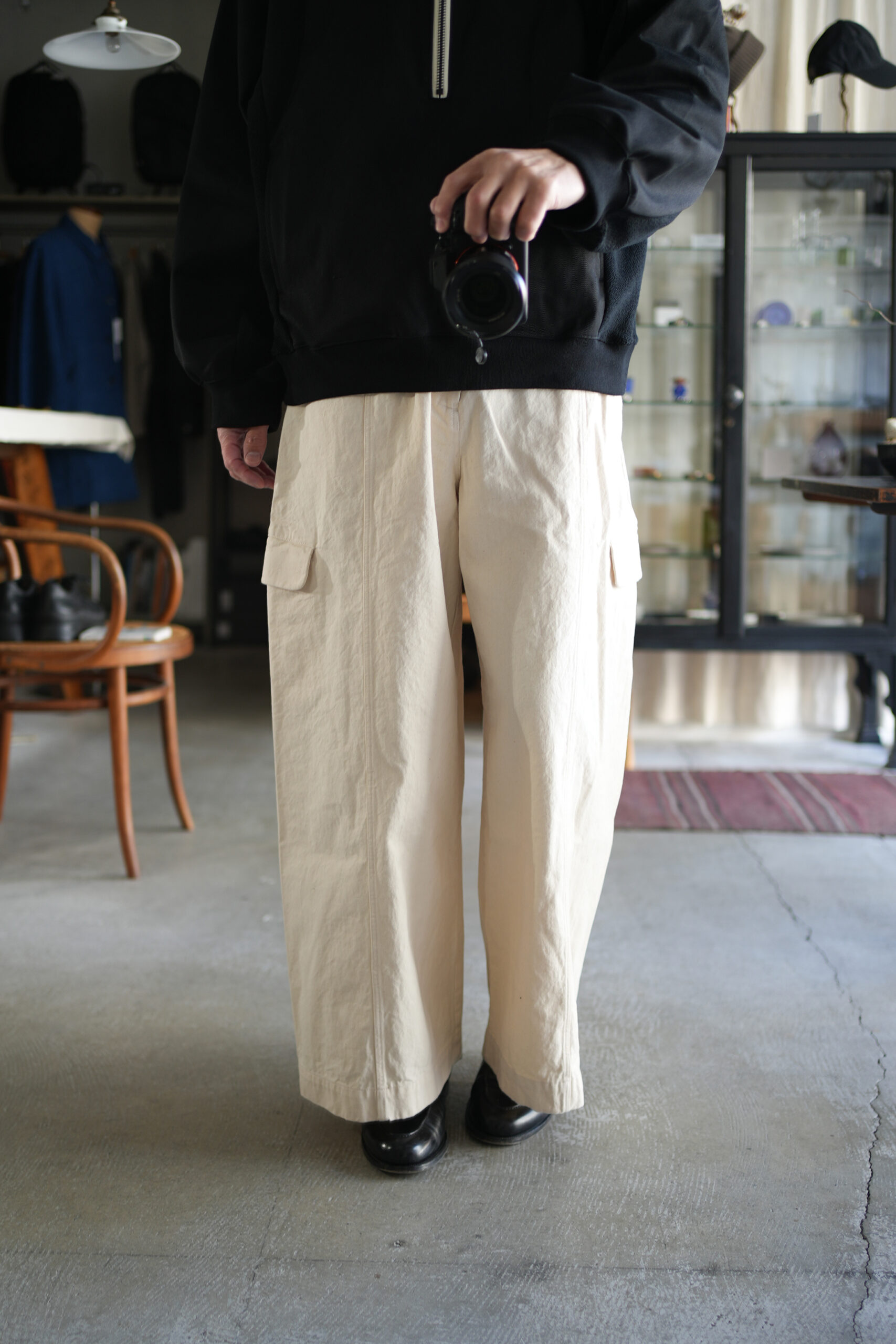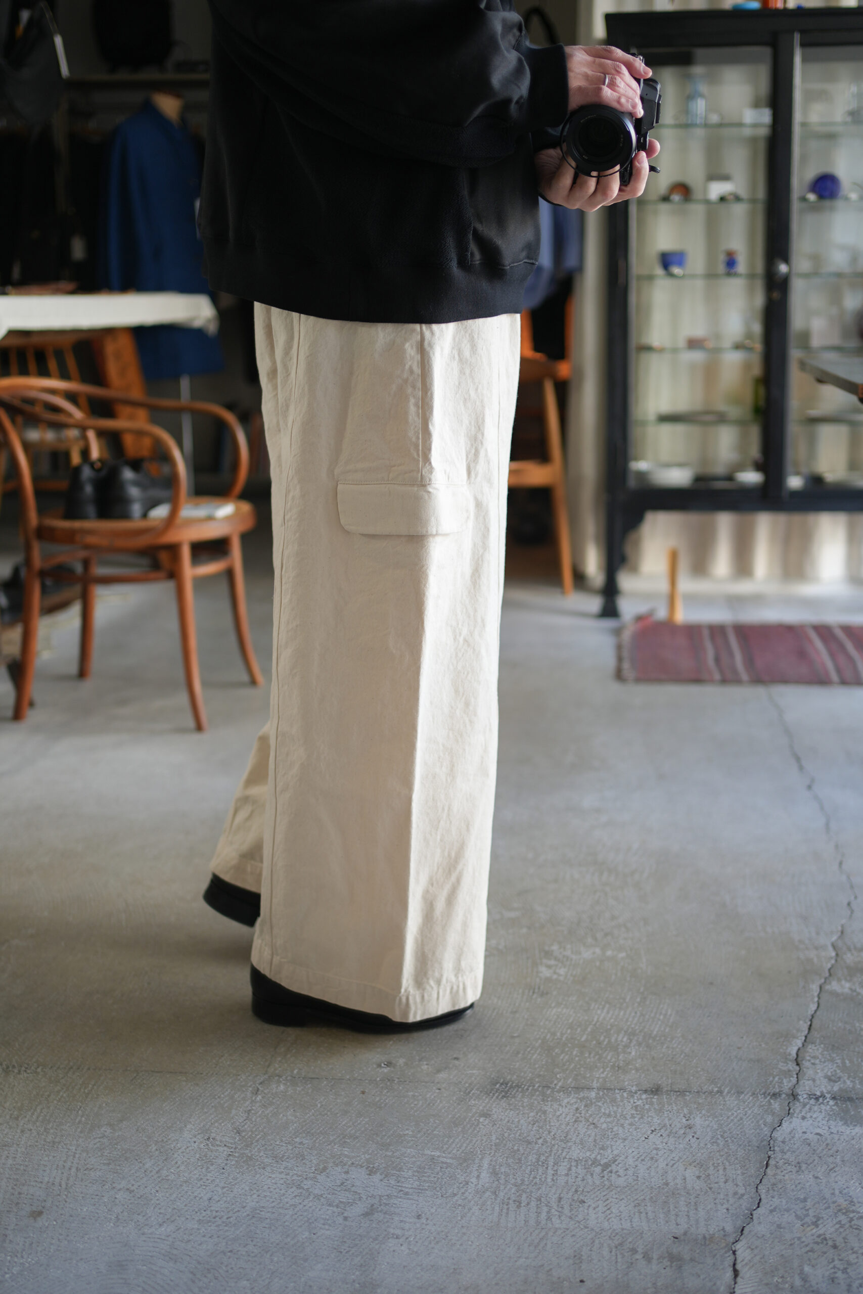 10ozのデ二ム生地を使用したジャケット感覚のカーゴワイドデニムパンツ。顔料プリントを施し縫製後に洗いをかけることによる独特の風合い。