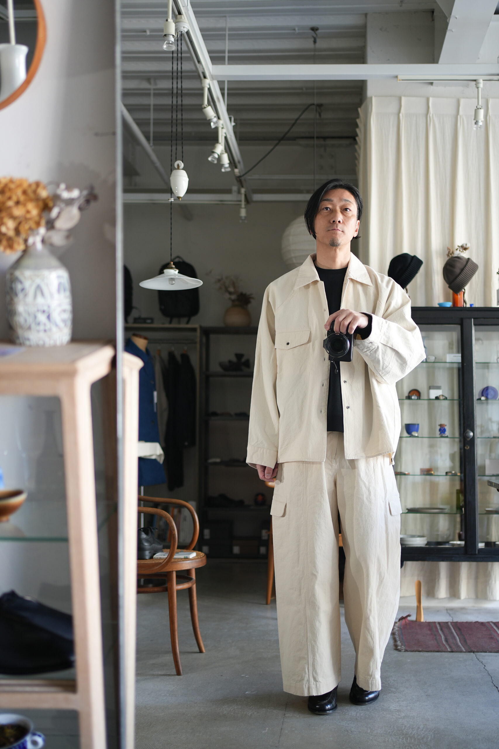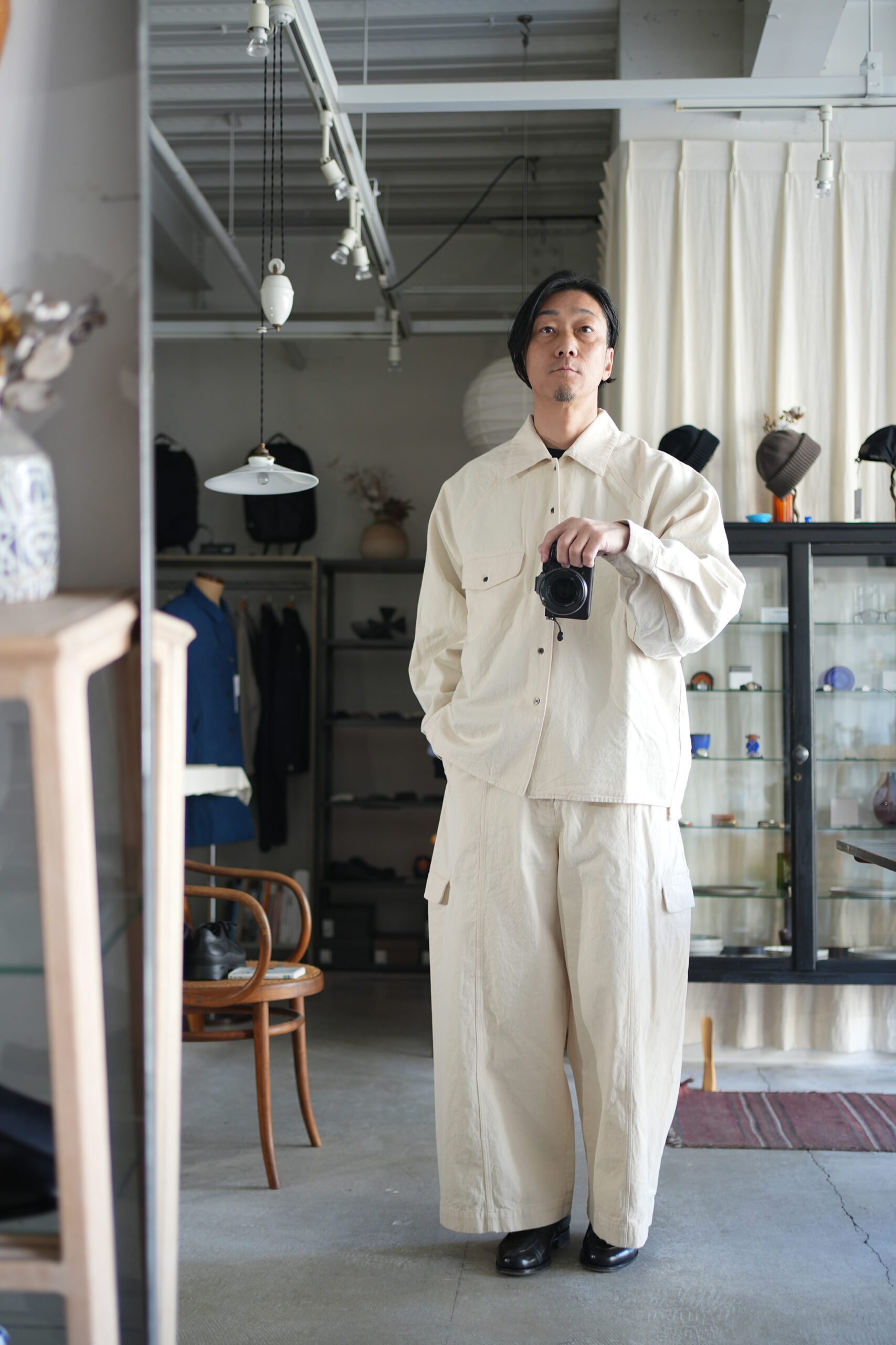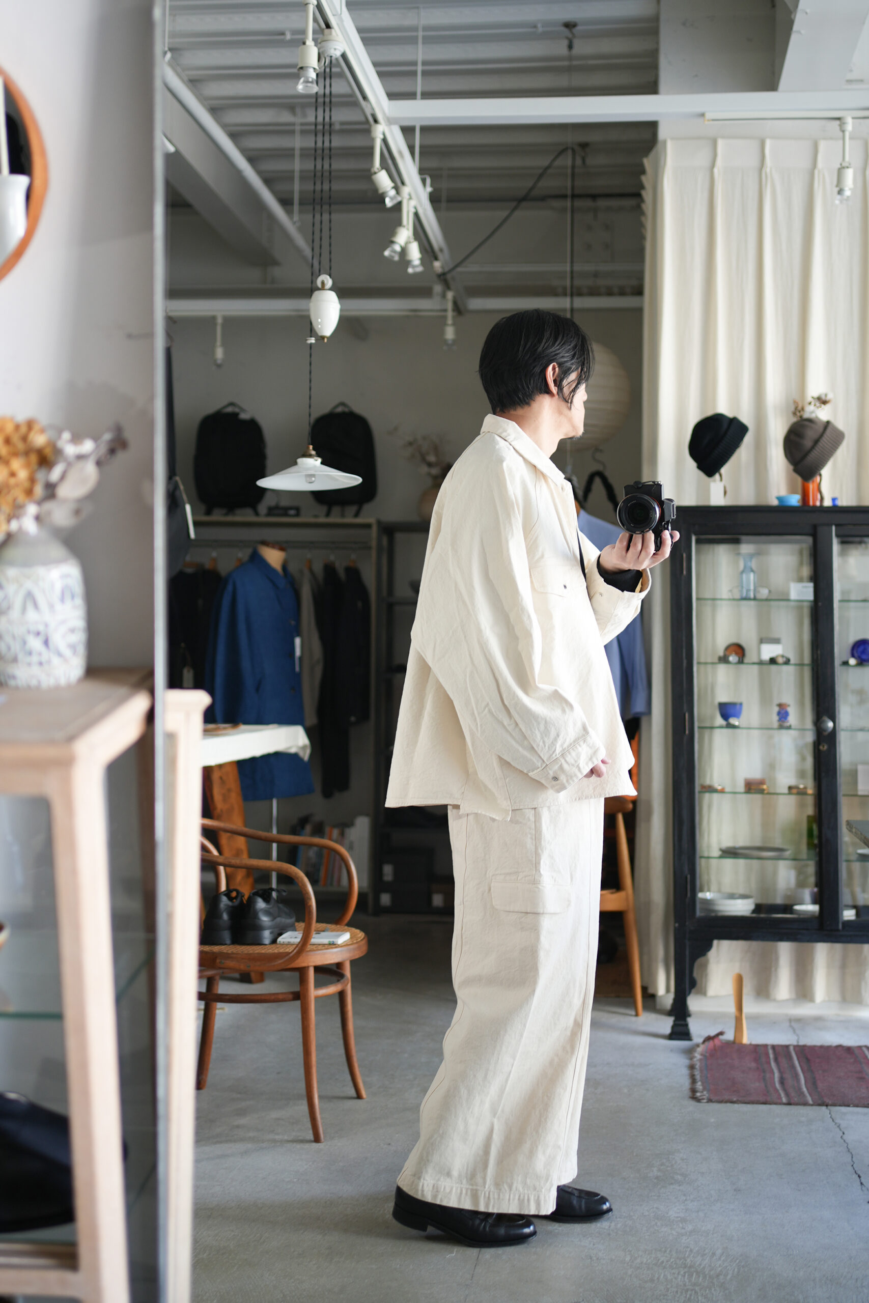 「my beautiful landlet」PIGMENT PRINT WASHED DENIM SHIRT & CARGO PANTS。