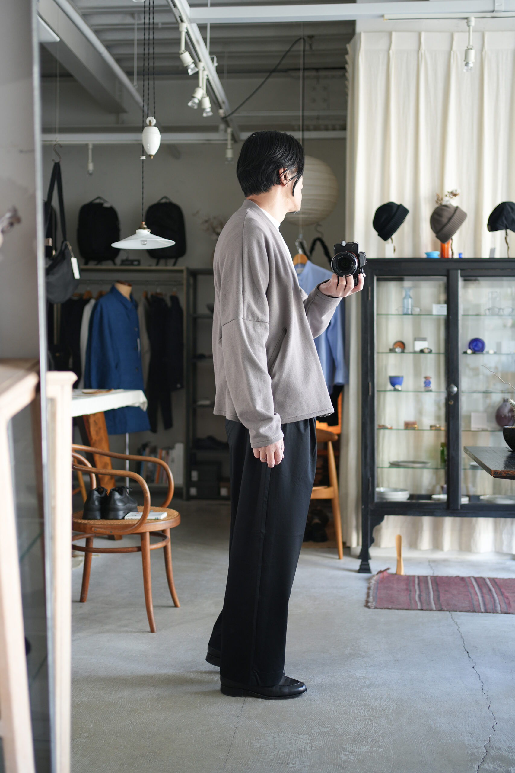 46Gという、スーパーハイゲージで、タイプライターという織物の高密度平織組織を実現。 ストレッチ性が高く一度着ると止められない着心地、そして、着用時のしわなどの形態変化も少なく、イージーケア性も高い。 ハリ感、光沢感、イージーケアを持ち併せた我々にしかできないニュースタンダードシャツ地。 ディティールは、ドレスシャツを採用し全て巻き伏せ本縫い仕様、貝蝶釦使いです。素材のハリ感、光沢感、そして塩梅の良いシルエット、生地が生み出すドレッシー感とパターンを融合させた、唯一無二のシャツ。綿糸の原料は、120/1 という細番手リサイクルスビンコットンを双糸使い。糸もガス焼きしたものを使うことで、より光沢感と洗濯後の毛羽を抑えております。50D高捲縮リサイクルナイロンを使用し、ストレッチ性を出しております。毎シーズン提案しているイージーパンツ。今シーズンは、ピンタック使用でより着用しやすい雰囲気がございます。ウエストは、ゴムで前開きと着脱しやすいディティールで、あえてタックも入れず、すっきりとした印象に仕上げております。程よりわたりから程よいテーパードのシルエットが特徴のパンツです。