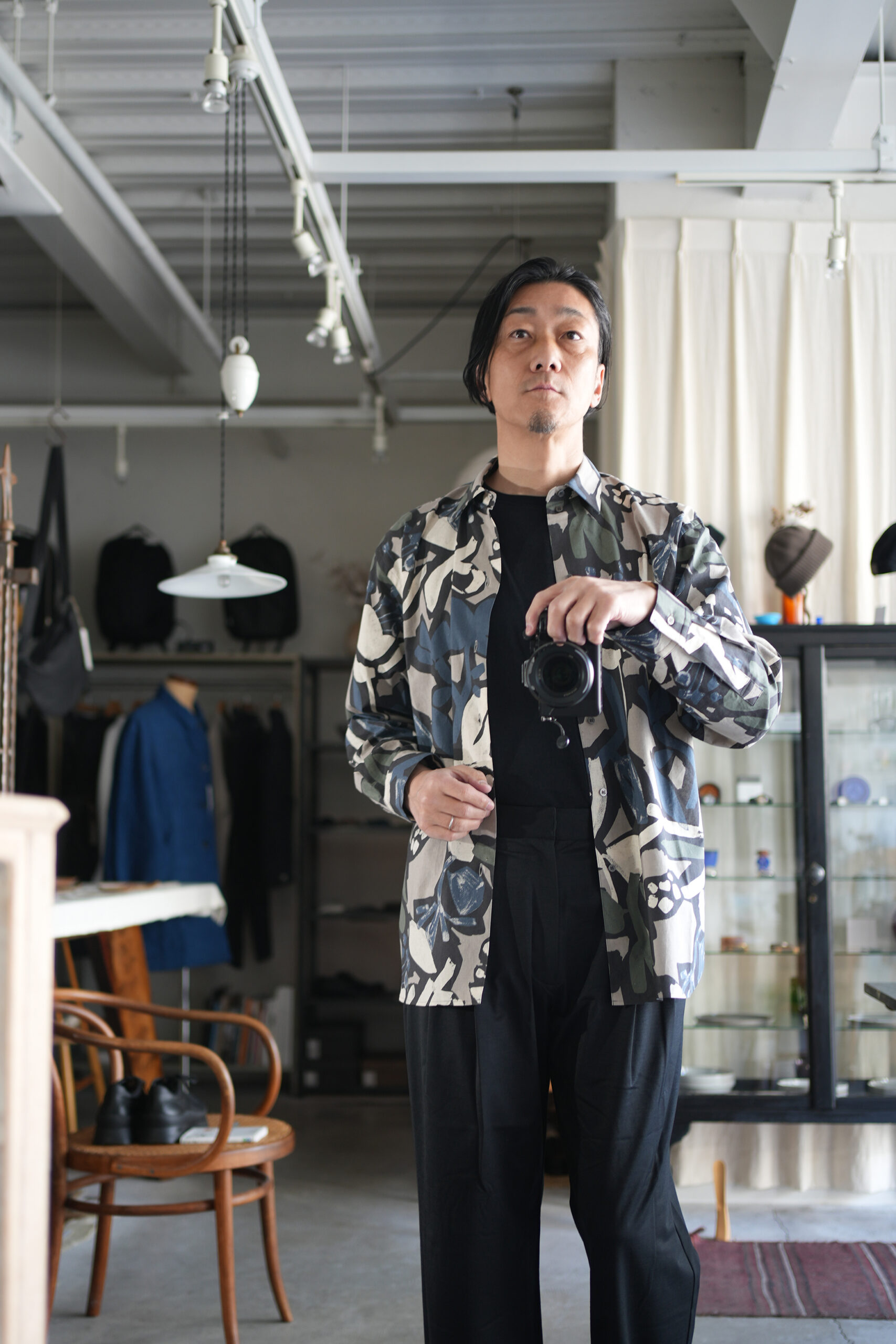 「my beautiful landlet」FLORAL PIGMENT PRINT OVERSIZE SHIRT &「KANEMASA PHIL.」36G Wool Trousers。