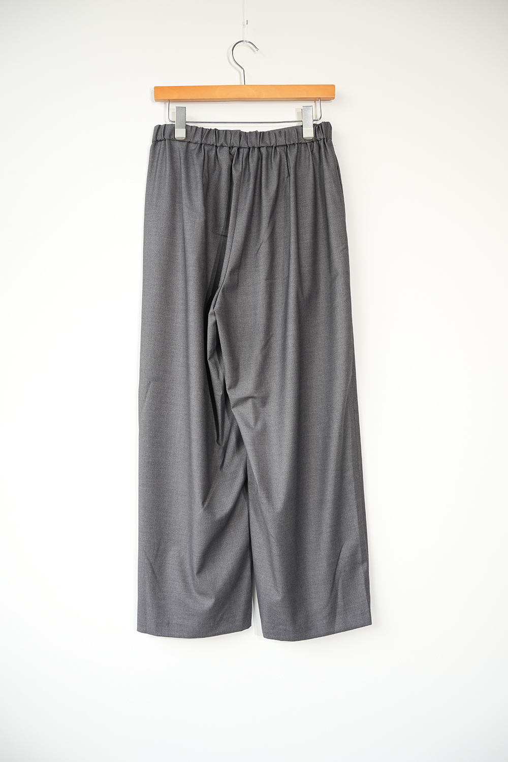 ウエストにタックを入れたストレートシルエットのイージーパンツ、程よい光沢ととろみのある上品な生地。
