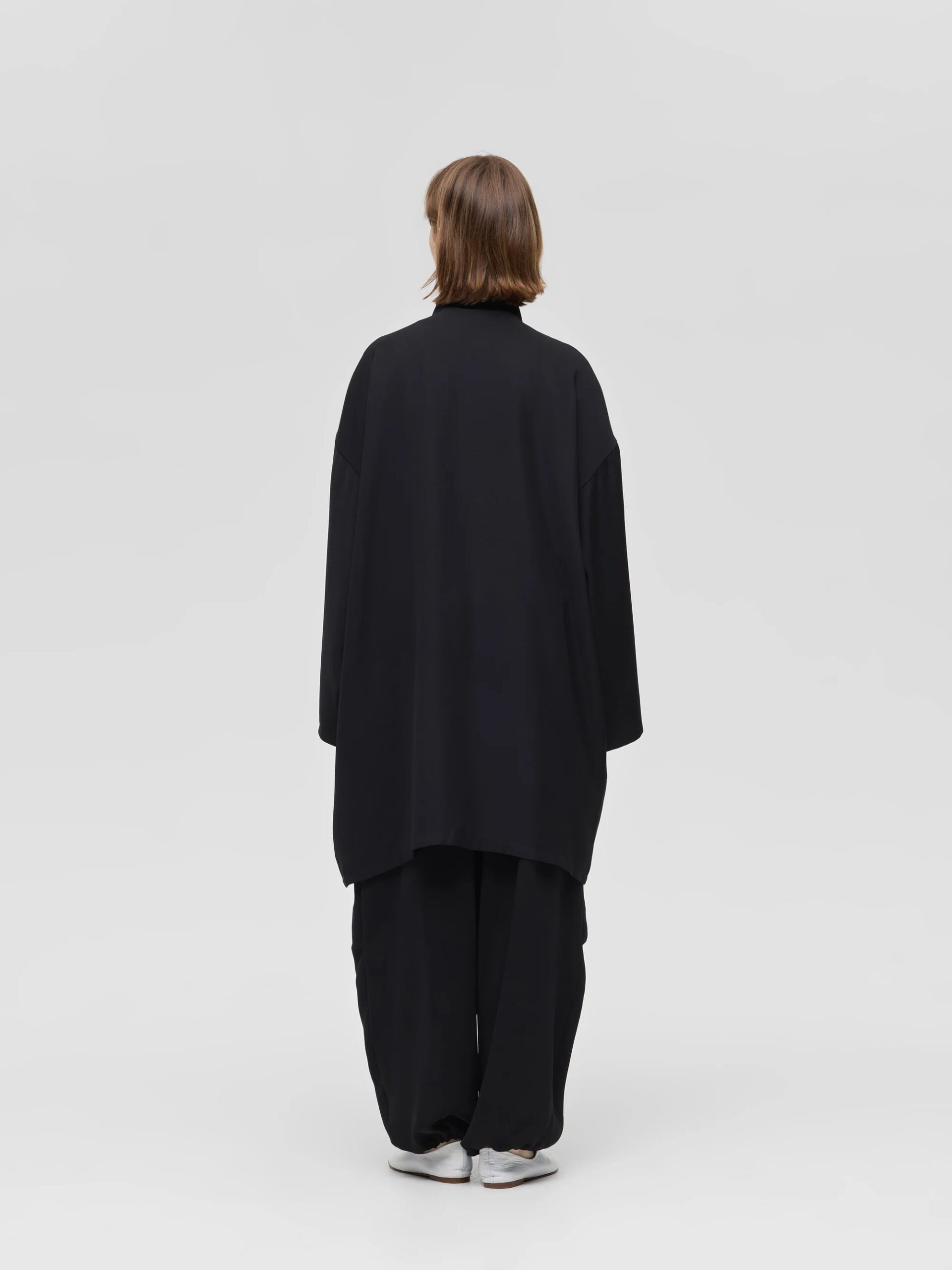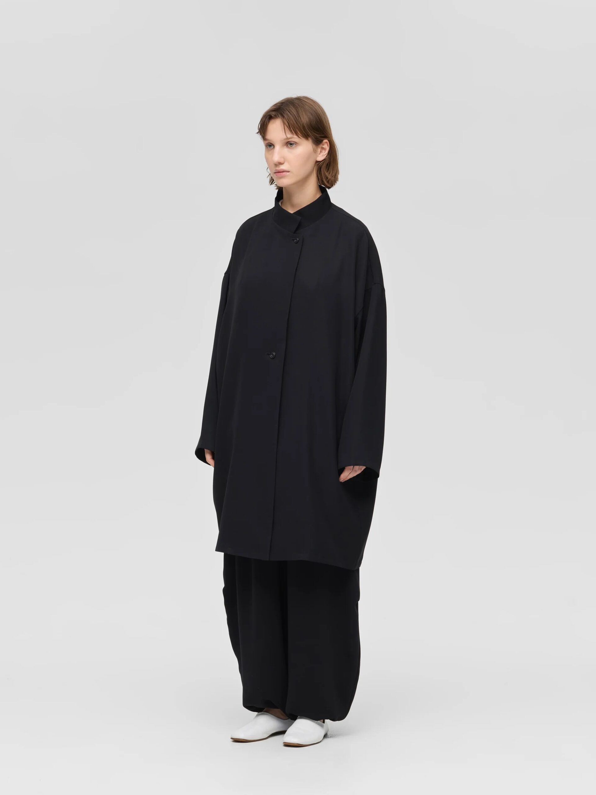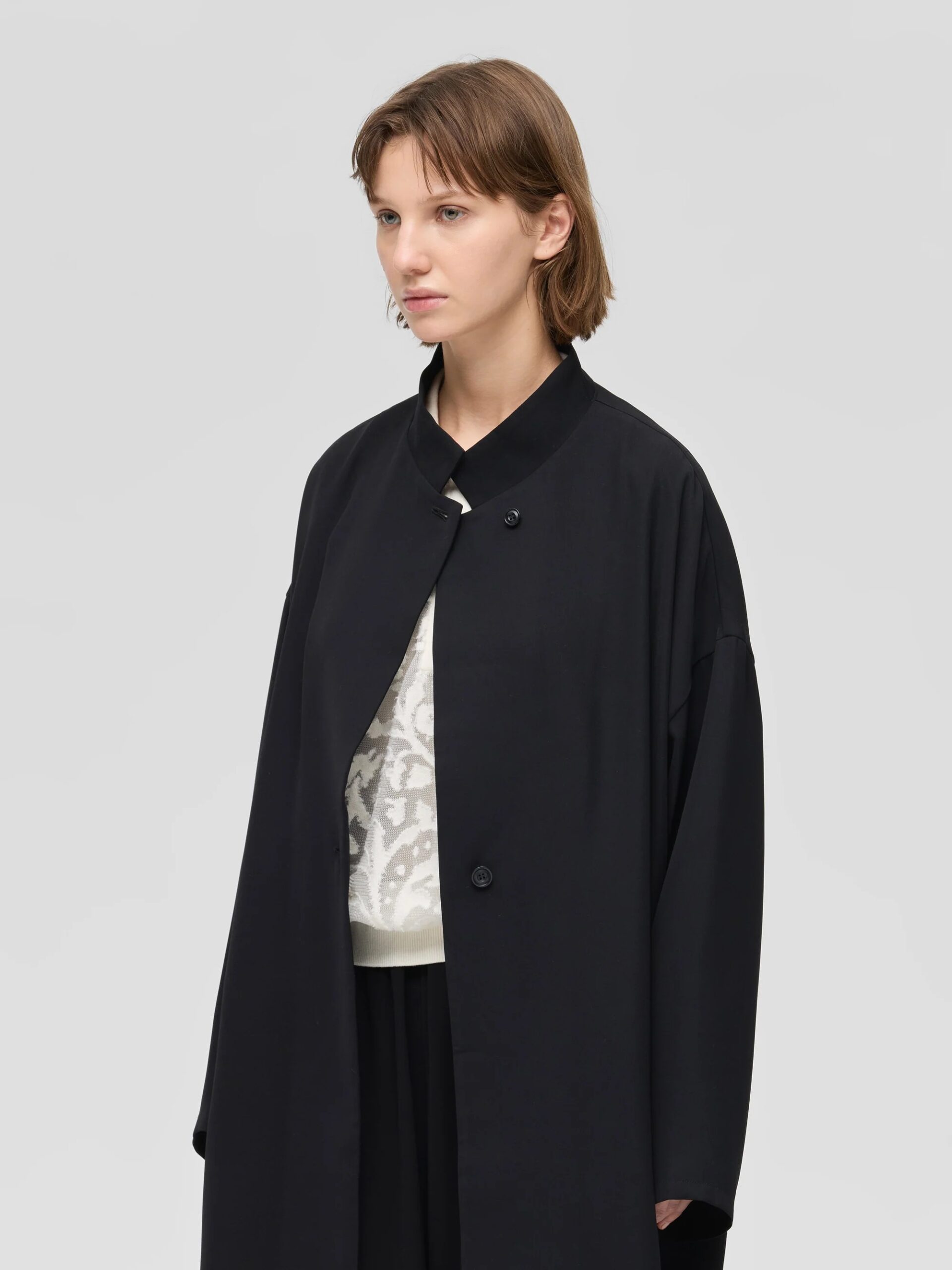 シャープな印象のスタンドカラーが際立つ、モードなワイドジャケット。フロントにはしっかりとした芯地を使用し襟が美しく立ち上がる設計。スタイリッシュな佇まいをキープしながら洗練された雰囲気を演出します。ドロップショルダーとワイドなシルエットが程よい落ち感を生み、抜け感のある着こなしに。ひざ丈ほどのミドル丈でアウターとしてはもちろんワンピースとしても活躍します。特殊な構造によるエアリーなふくらみと上品な光沢が魅力のダブルサテンを使用。しなやかな質感が肌に優しく馴染みます。シワになりにくくラフに羽織るだけで洗練された印象に。オケージョンシーンにも対応できる一着です。裏地なし。サイドポケット付き。