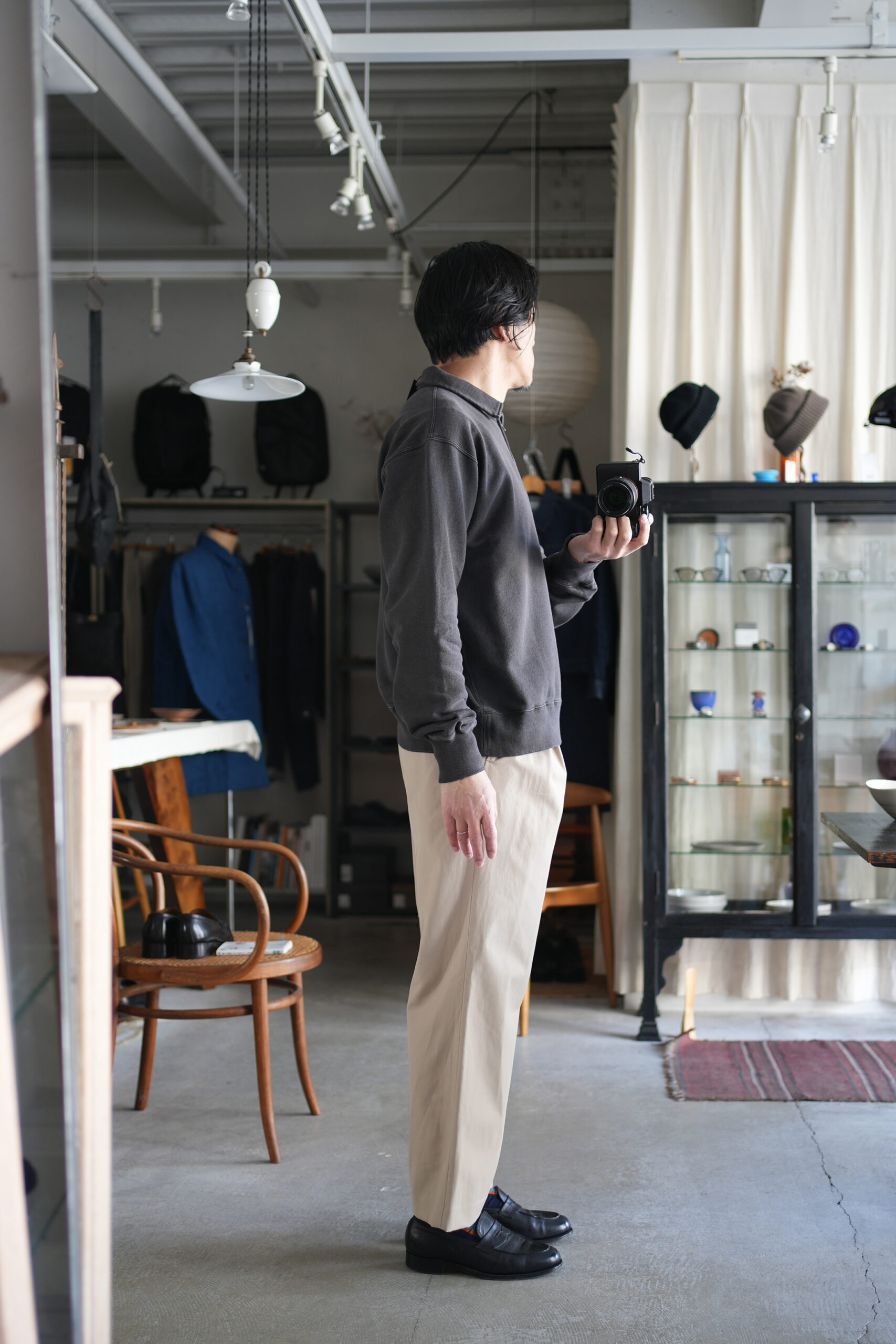 「URU」HALF ZIP SWEAT & COTTON INVERTED PLEATS PANTS。