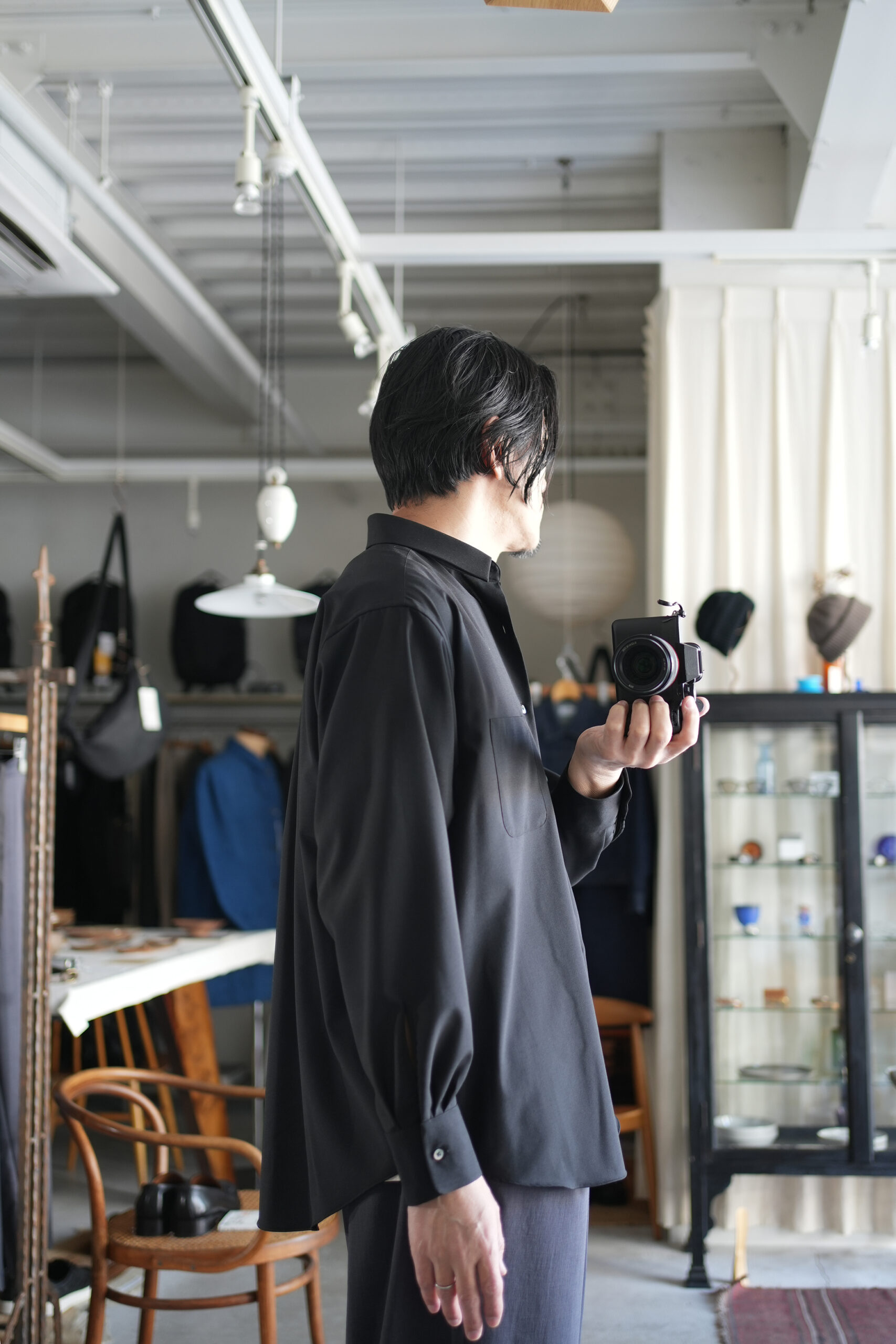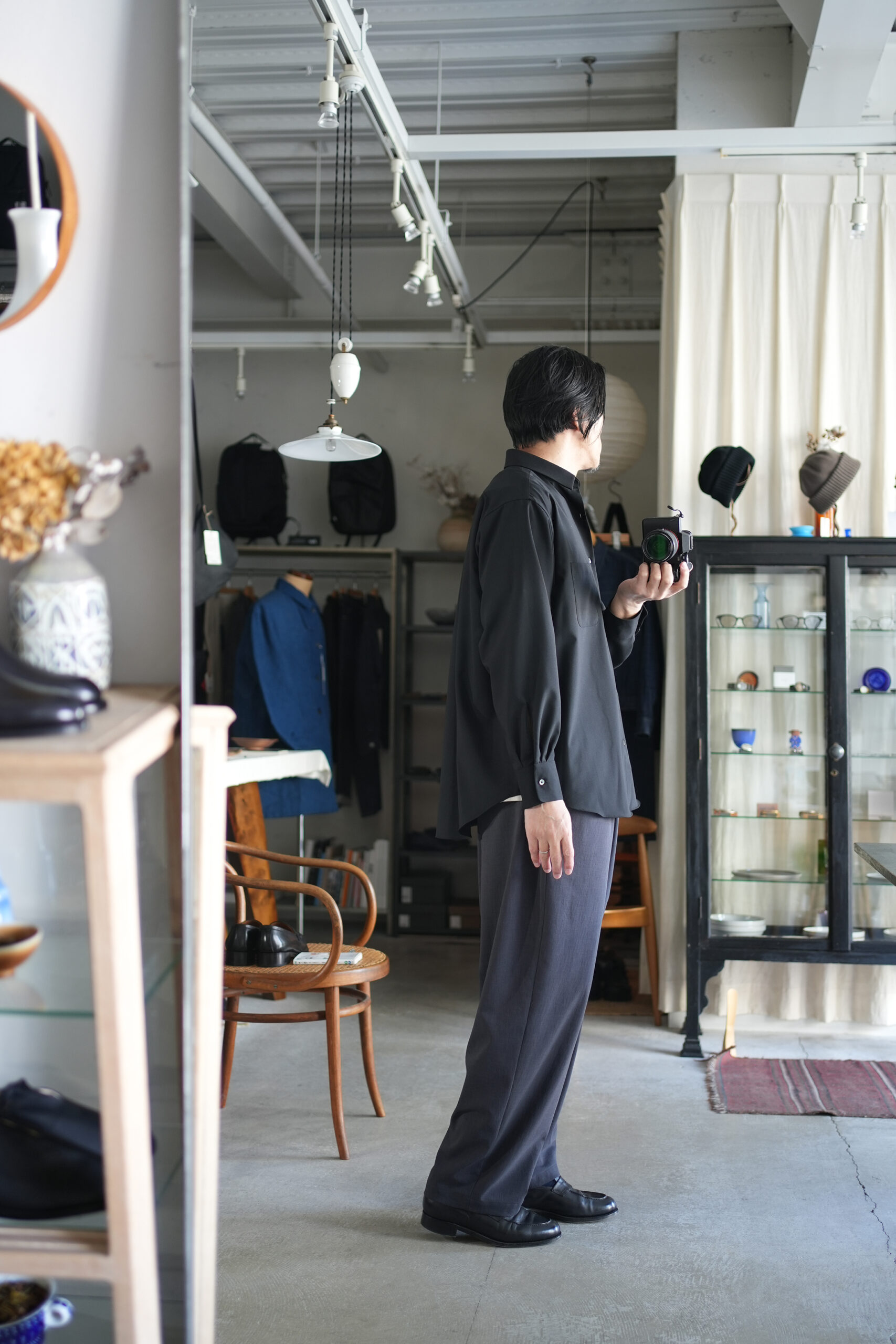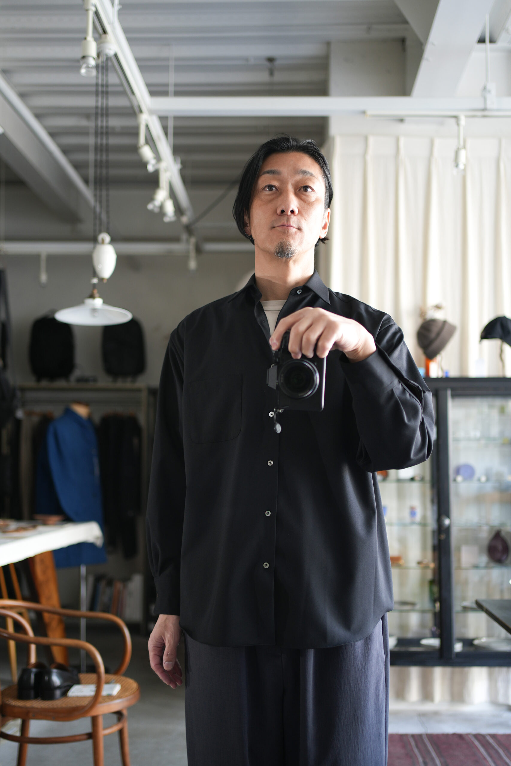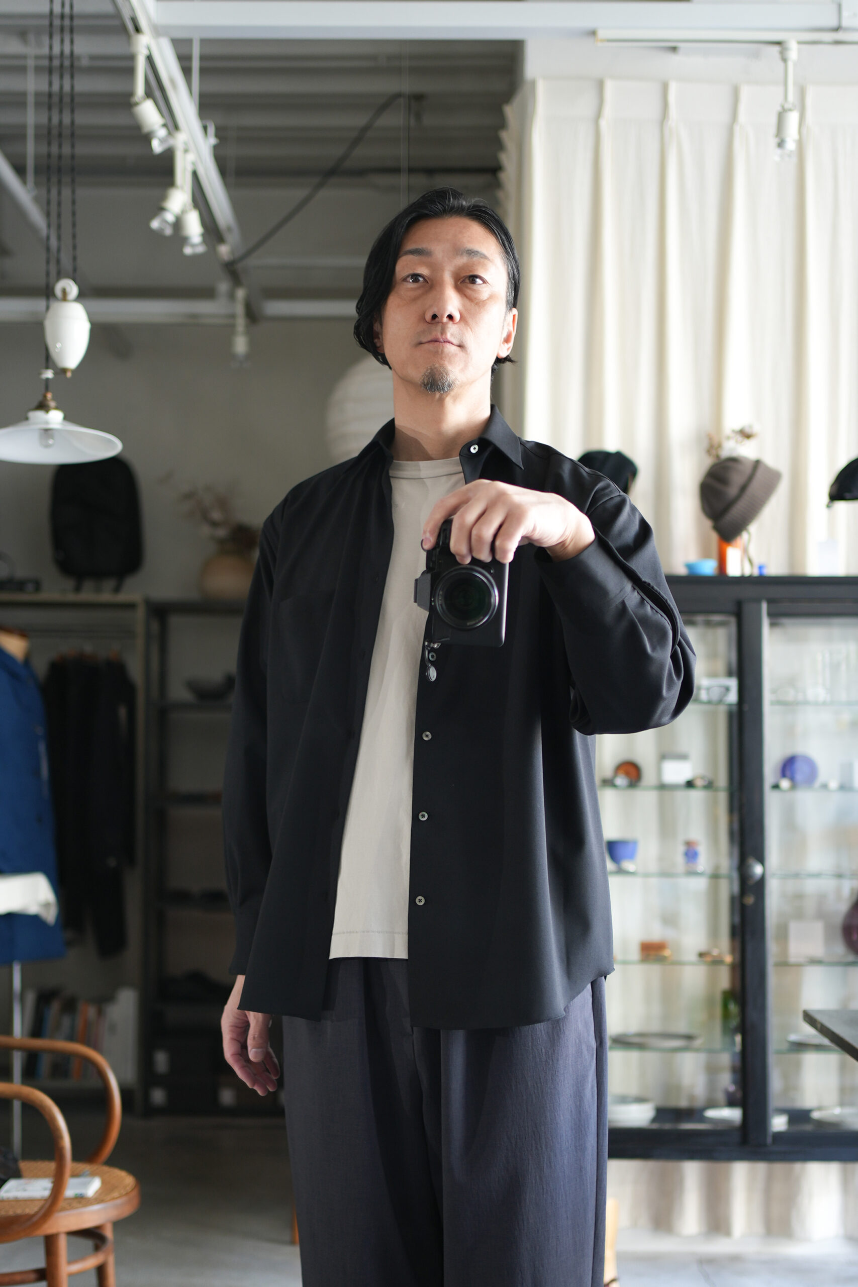 ブランド定番の「Comfort Fit Shirt」。ゆったりとしたサイズ感と、ドロップショルダーによる丸みのあるシルエットが特徴です。身幅と袖にゆとりを持たせつつ、着丈は長くなりすぎないバランスに設計されています。襟・前立て・カフス周りのステッチを極力省いたミニマルな仕様で、襟とカフスの芯地をしっかりとすることで、リラックスした着心地の中にもシャープな印象を加えました。また、袖の開き位置を前方に設定し、所作まで美しく見えるよう配慮。ウール特有の上品な光沢が、シンプルなデザインの中で確かな存在感を放ちます。ウール100%ならではの美しいドレープ感が最大の魅力。ゆったりとしたシルエットで羽織りとしても使いやすく、タックインしてブラウジングを楽しむスタイリングもおすすめです。素肌に着ても心地よい肌触りで、濃色であれば透け感も気にならず、真夏まで活躍する素材ならではの機能性を備えています。アルゼンチン産の上質なオーガニックウールを使用。MARKAWAREの定番素材として、徐々に温暖化が進む地球環境に合わせ、長年にわたり生地の軽量化と改良を重ねた素材です。原料には18マイクロンの極細糸を採用し、それを国内で80番双糸という、ウールの糸の中では比較的細い番手に引いて平織りに仕上げています。薄手でありながらウール特有のハリとコシをしっかりと感じられるのが特徴で、上品な光沢が際立ちます。見た目の高級感に加え、暑さの残る時期からでも快適に着用できる清涼感を備えた素材です。