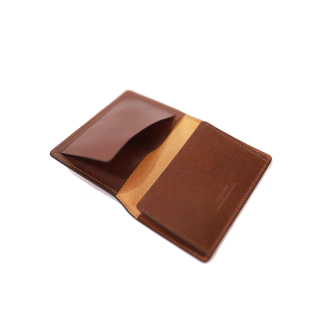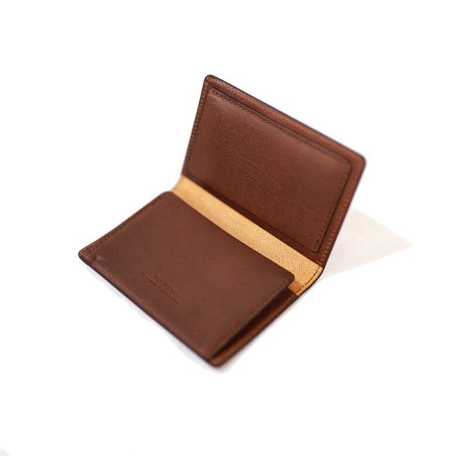 上質な牛側を用いたシンプルデザインの名刺入れ、様々な職種に似合うカードケース。HERBIE(ハービー)レザーは、1911年創業の歴史あるタンナー山陽社製のフルベジタブルタンニンレザー。同社は日露戦争後に、軍需向けの革靴やベルト等を生産していた、品質にはお墨付きのタンナーです。北米産のミモザから抽出されたタンニンを使い、じっくりと時間をかけてピット層にて鞣されたレザーで、ハリがあり軽量ながら耐久性を兼ね備えています。仕上げには蝋引きも施しており、マットでムラのある表情が自然な無骨さを出しています。使い続けるうちに艶が出てきて顕著な経年変化が味わえます。カードポケット1ケ、フリーポケット1ケ。