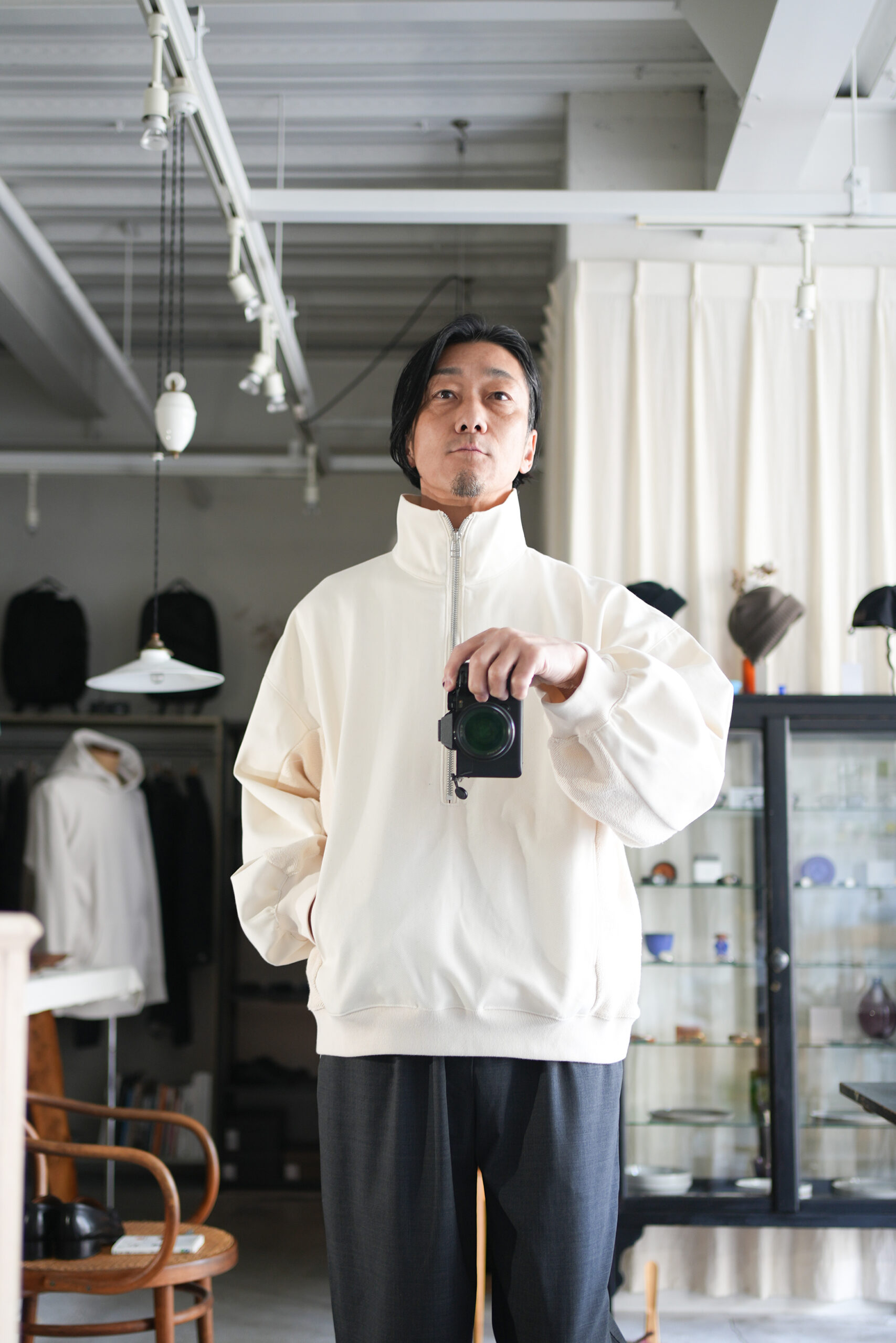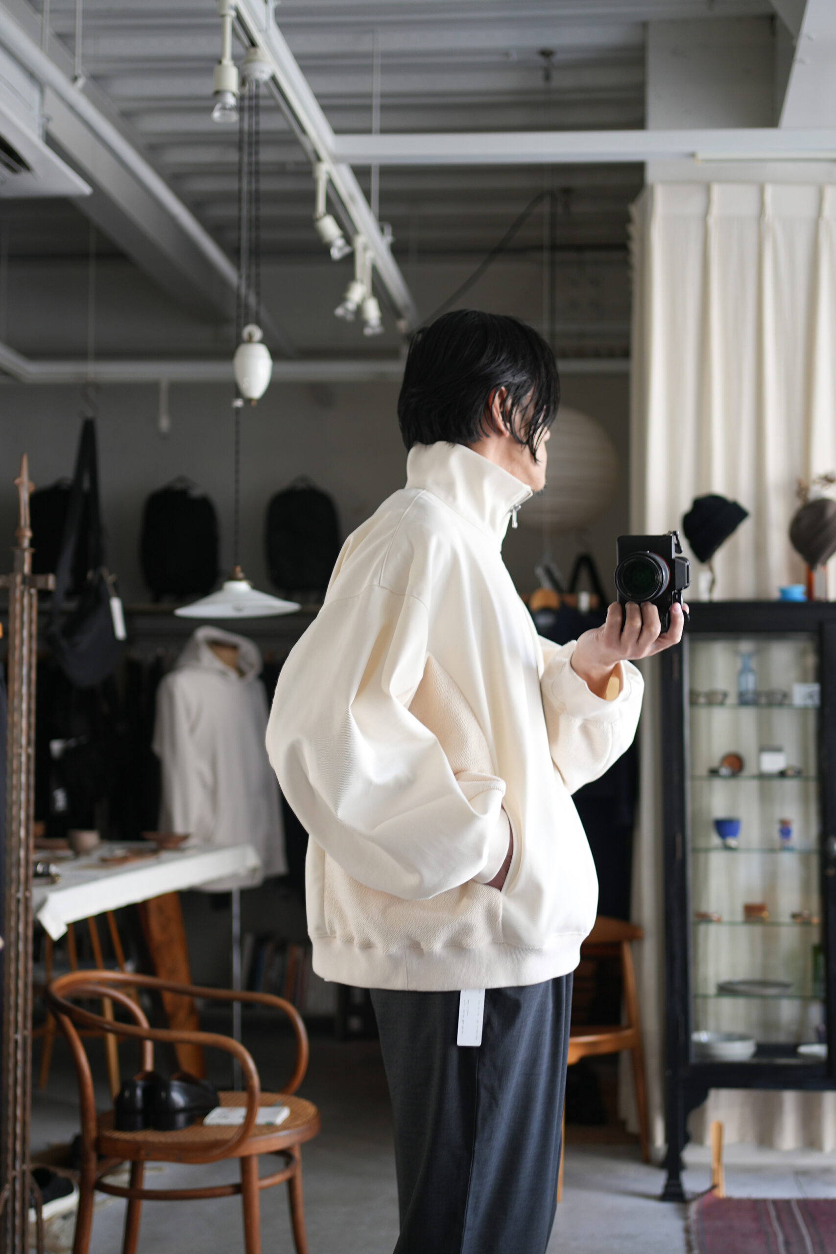 「my beautiful landlet」ORGANIC COTTON & RECYCLED POLYESTER SWEATSHIRT & 「EEL Products」COOK PANTS。