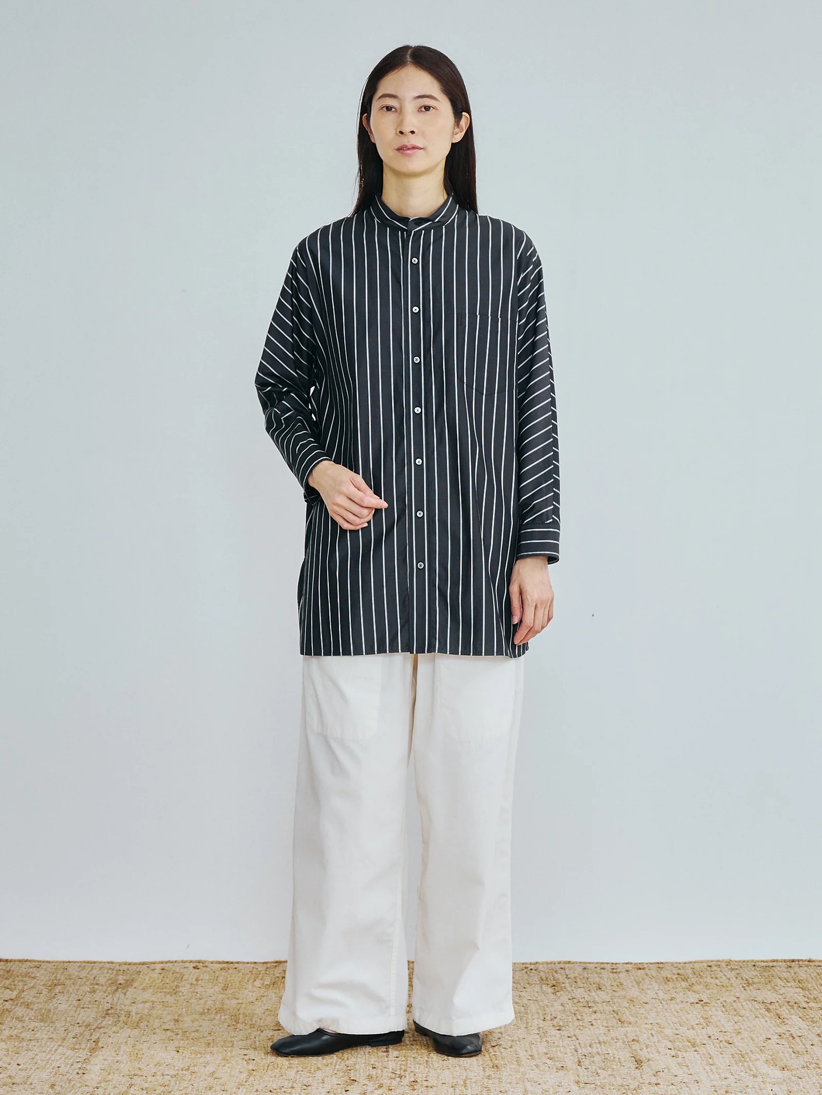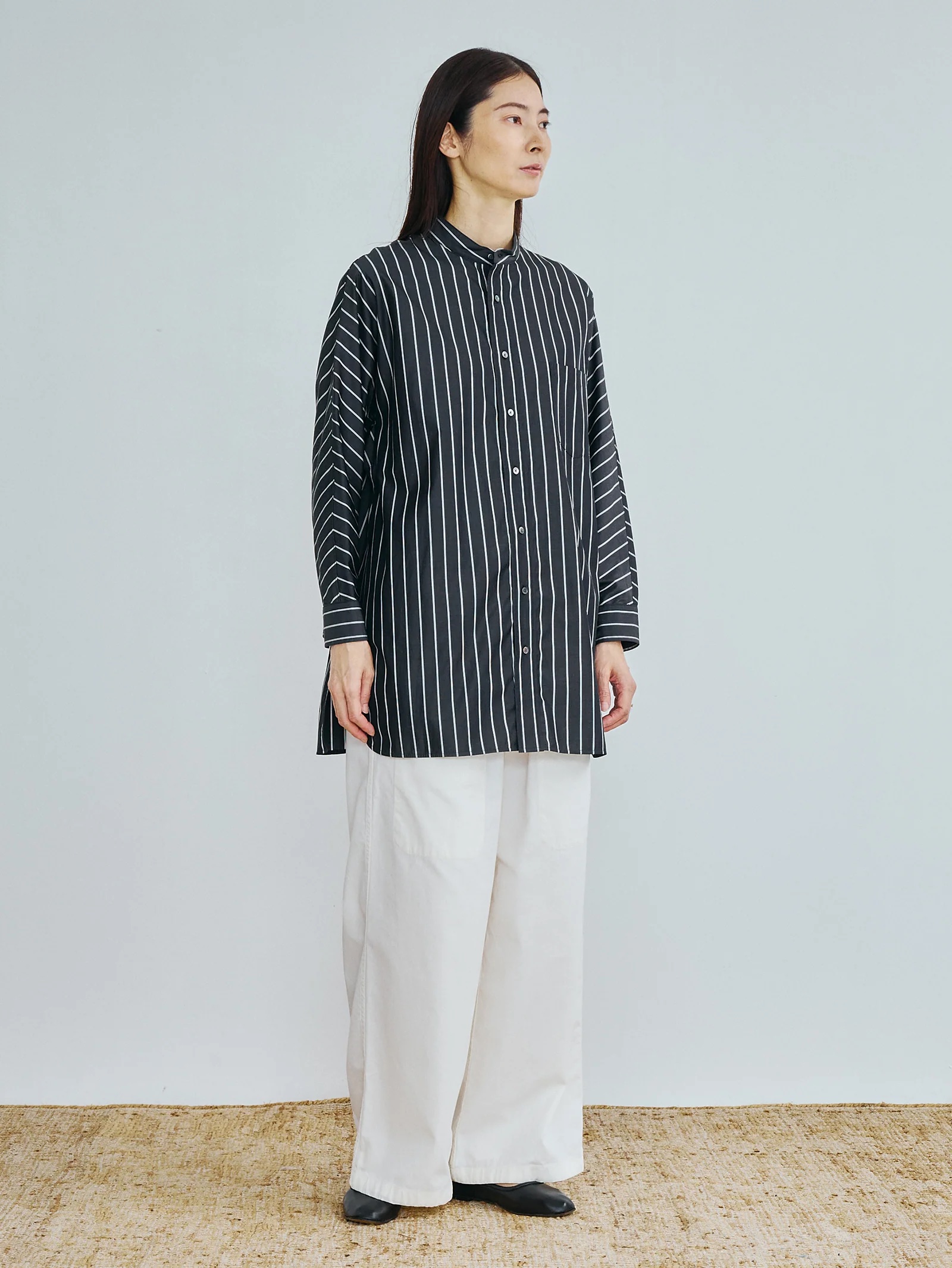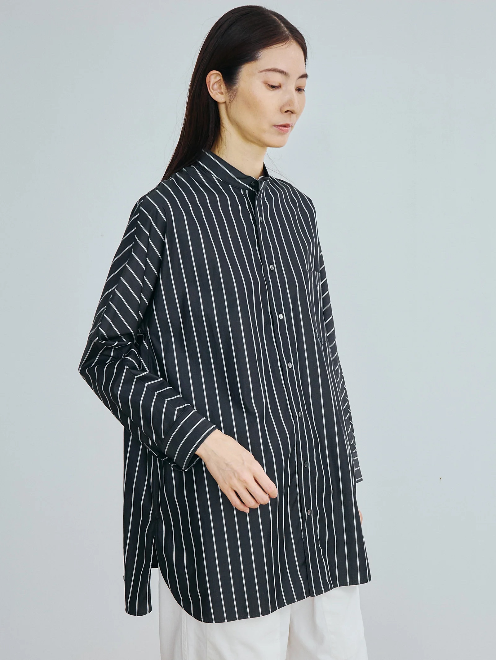体型に寄り添うチュニックシャツ、アームホールのハギを無くした、一枚仕立ての贅沢なチュニックシャツ。身頃を一枚布で構成することで、どんな体型にも自然に馴染む設計。ノーカラーのクリーンなネックラインが上品で洗練された印象に。しなやかで極上の肌触りと、透明感ある光沢が特徴のドレスシャツ素材。とても細い糸を使って織り上げた、上質なポプリン素材です。なめらかな肌触りと自然な艶、そして発色の美しさが大きな魅力。光を含んだような透明感のある表情は、仕立てることでさらに際立ち、存在感を放ちます。糸が細いため染色性にも優れ、色は深みと奥行きのある美しい仕上がりに。しなやかさの中に品の良さがあり、クリアで洗練された印象を楽しめます。着込むほどに風合いが増し、時間とともに育つ経年変化も魅力のひとつ。長く大切に着続けていただきたい、特別感のある素材です。シンプルでありながら、纏うだけで存在感を放つノーカラーテントシャツ。アームホールの継ぎ目をなくした大胆なパターンが、体を包み込むように自然なドレープを描き、動くたびに美しいラインを生み出します。細身のパンツやスリムデニムを合わせれば、シャツのボリュームが際立つバランスに。ワイドパンツとの組み合わせで、よりモードな空気感を演出できます。上品な素材感とリラックスしたシルエットが調和し、オンにもオフにも対応できる万能な1枚。洗いざらしでさらりと着るだけで絵になる、TICCAらしい“構築的なリラックス”の象徴。