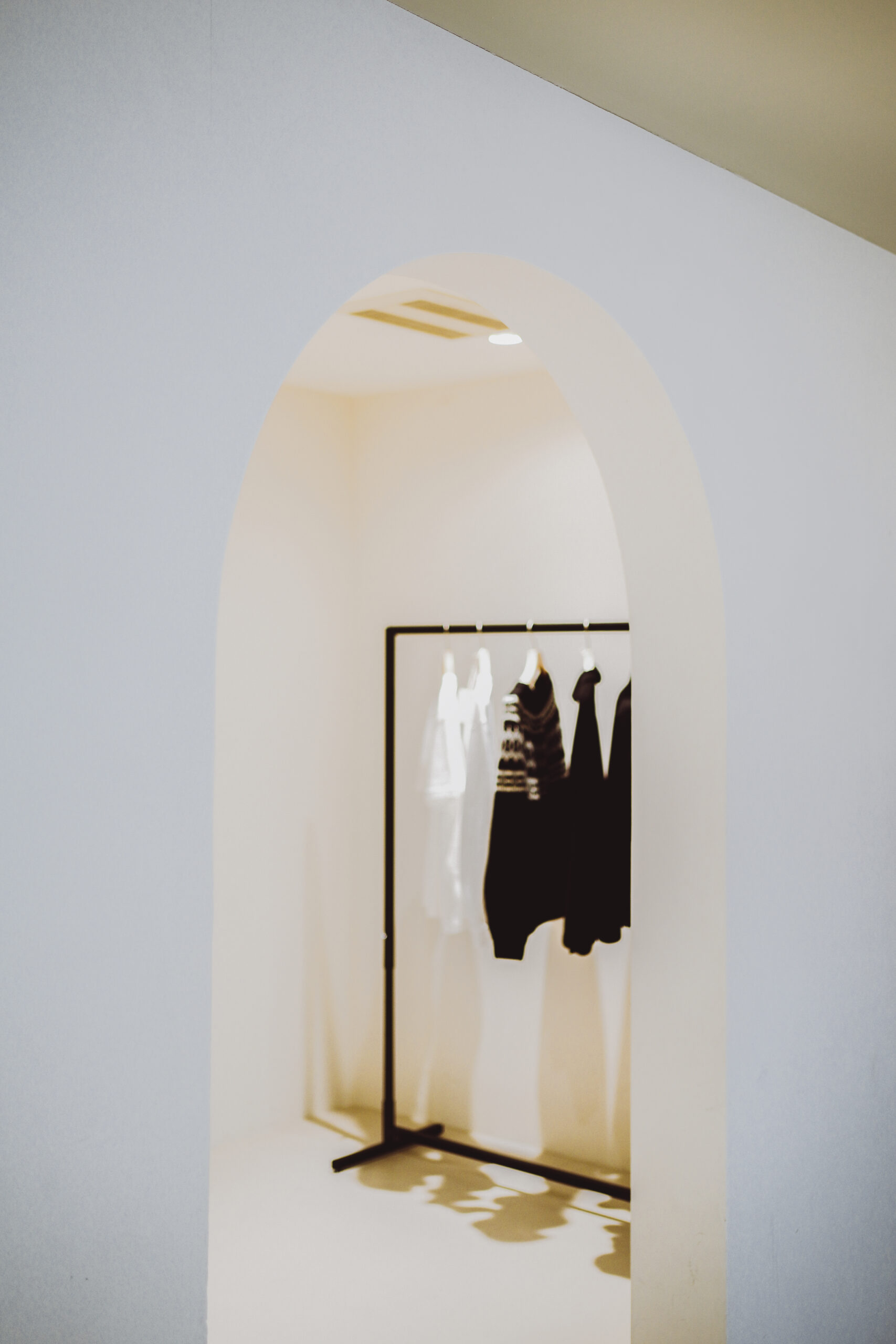 アールを多用した白い壁のシンプル空間にブラックのラック、所々木の壁を配し、窓にはカーテンが揺れる。