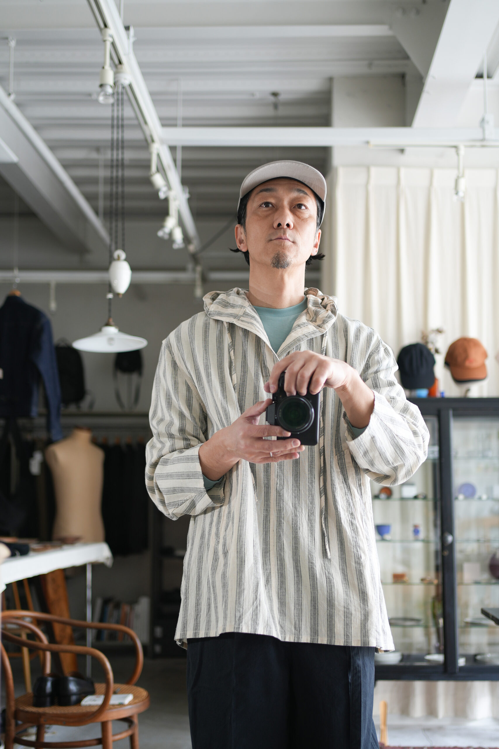 強撚糸と落ち綿糸を先染めして高密度に織ったコットンギャバジン 全体的に色ムラや表面の凹凸、ネップやフシが出るように仕上げています。生地をワッシャー天日仕上をし、生地をしっかり詰めて、ナチュラルなシワ感を出しています、製品でさらに洗いをかけシワ感やパッカリングを出しています。