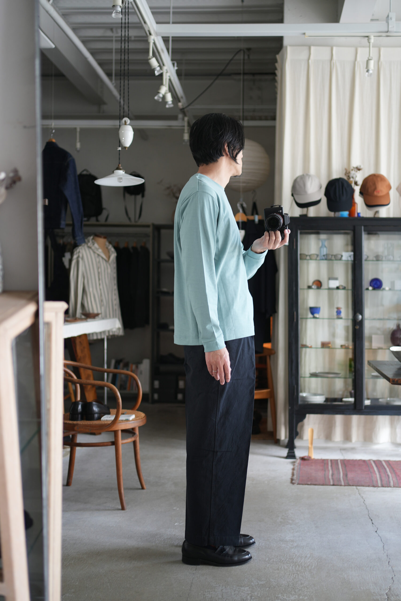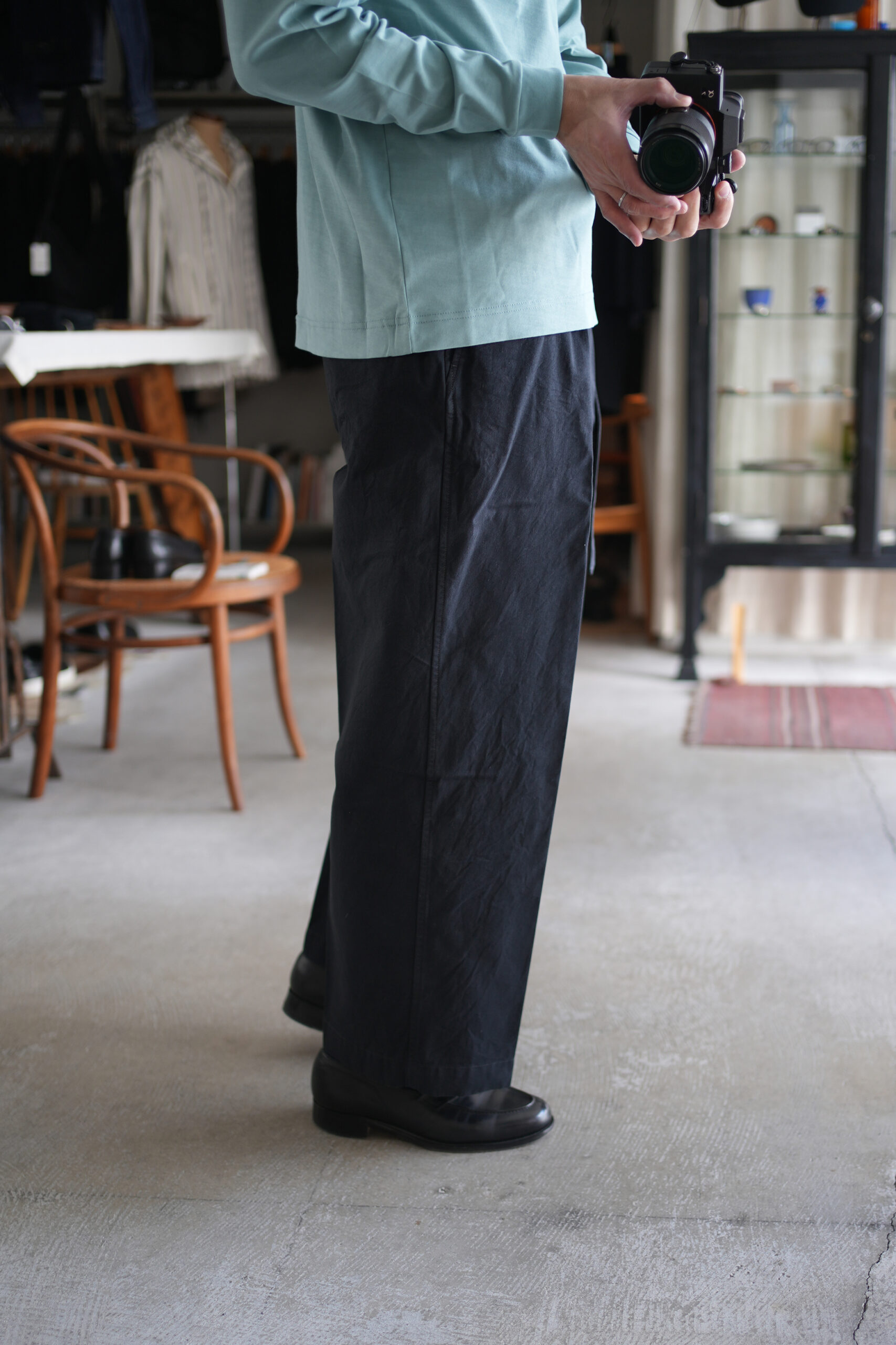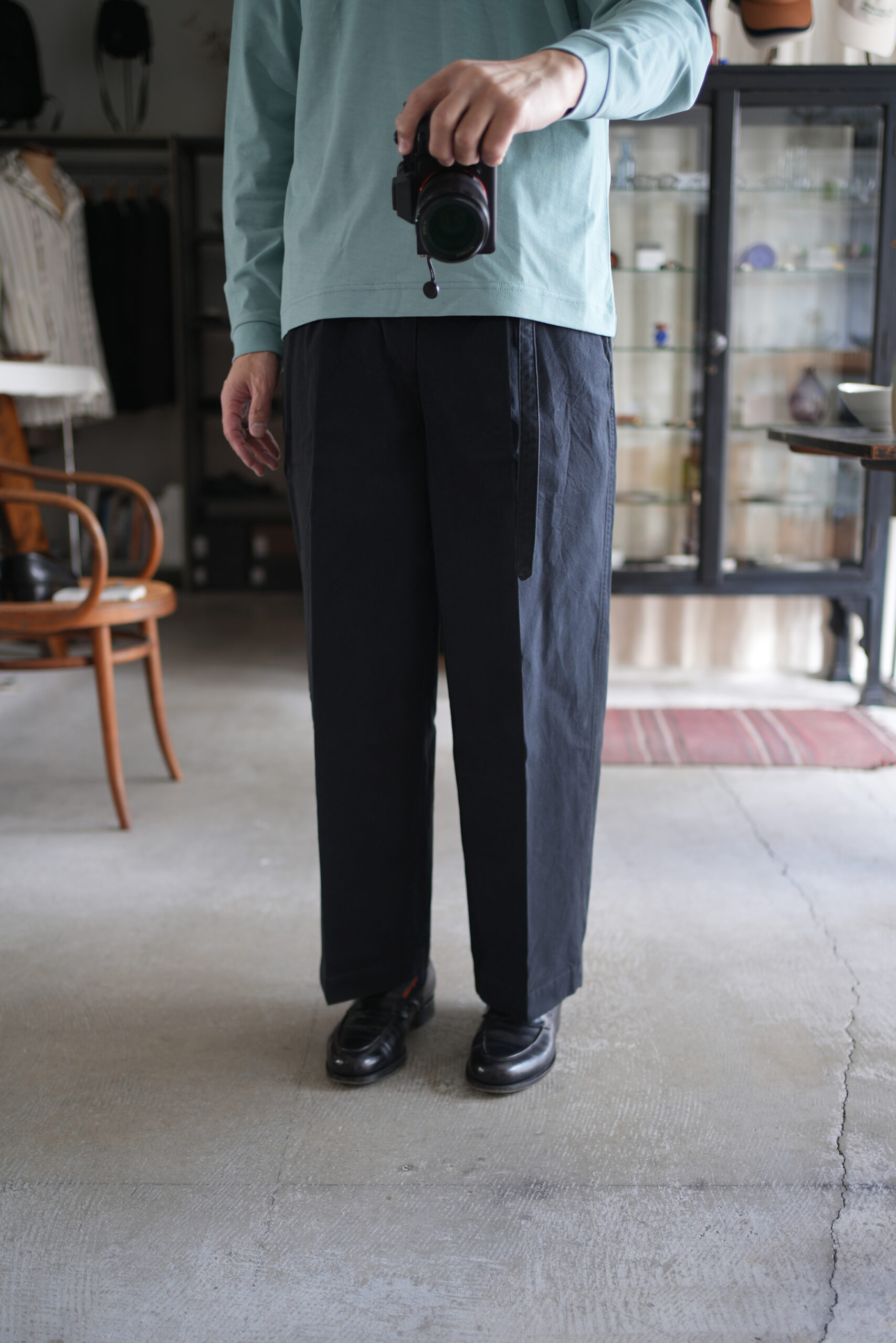 「KANEMASA PHIL.」36G High Twist LS Tee &「blurhms」Hard Twist Gabardine Belted Trousers。