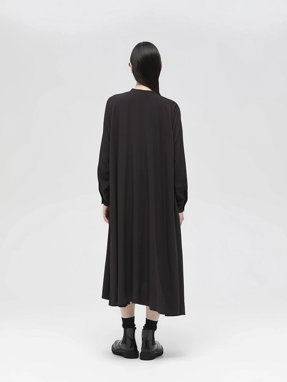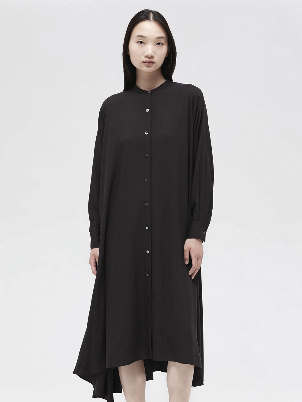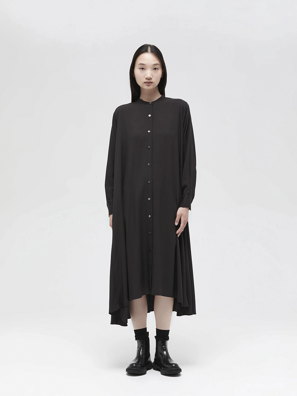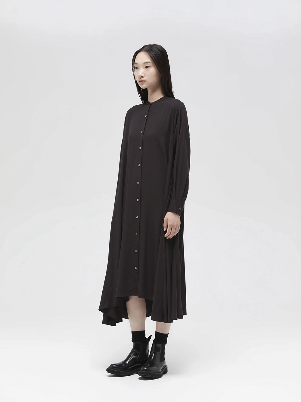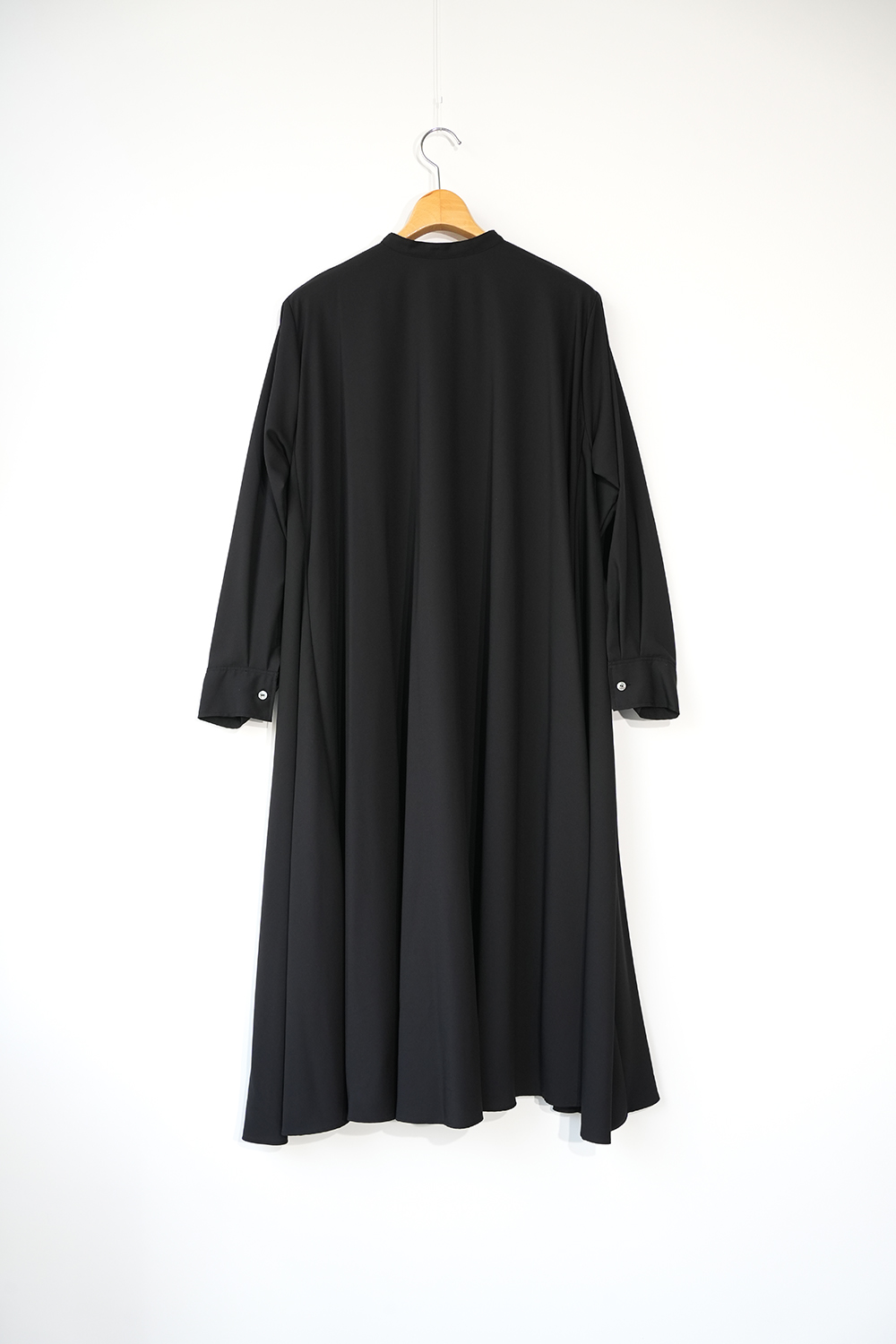 長く人気のフレアシャツワンピースが今季も登場。滑らかでしっとりとした落ち感のある素材がポイント。動くたびに綺麗に広がるフレアなドレープシルエットが上品で美しい1枚です。襟はスタンドカラーですっきりとしたデザイン。フロントボタンを外して羽織りとしても素敵です。滑らかで落ち感のあるT/R素材。シワになりにくく上品な素材感。オケージョンシーンでも活躍します。