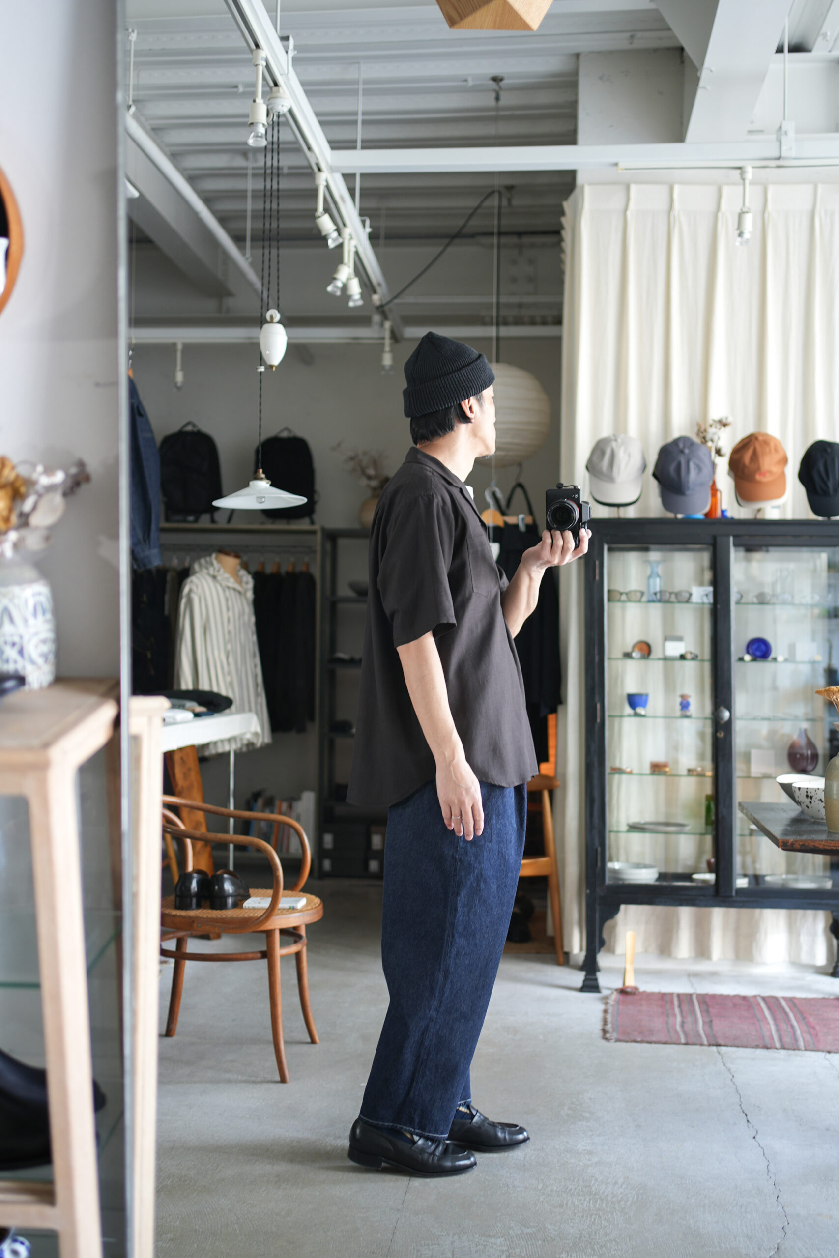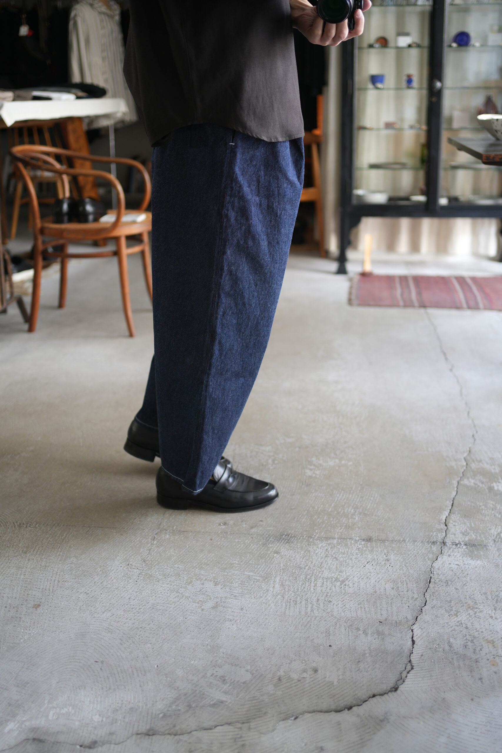 シャトル織機で織ったセルビッチインディゴデニム、なんて事のない気軽に穿けるデニム生地を目指して作った生地なので”コモン=一般的な”と名付けられた。織りによる自然な伸縮性と柔らかな仕上げで穿き心地良し、ワイドテーパードシルエット、9.5分丈、ウェストゴムと紐仕様。