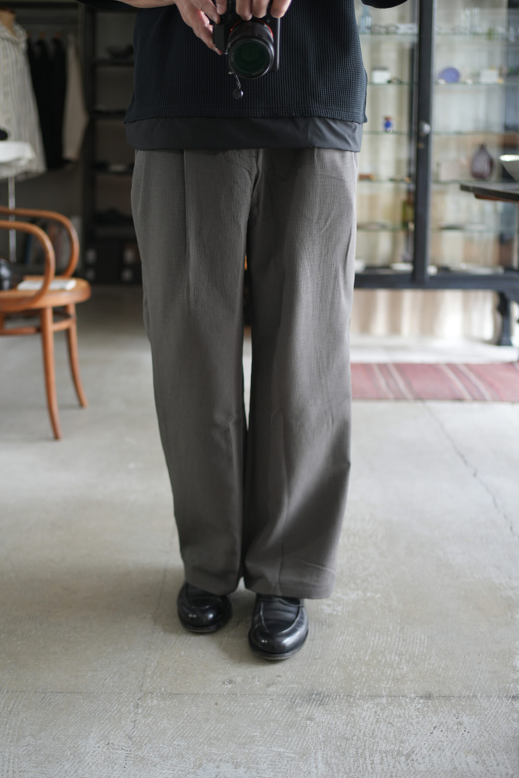 特殊技術により製造された通気孔のある多機能ポリエステル素材を使用したワイドパンツ。ワイドで縦に落ちる綺麗なシルエットが特徴。生地の特性により動きやすさを確保し履き着心地も良い。脇ポケット内側には左右に小物ポケットを、バックポケットは右のみファスナー開きのポケットをデザイン。脇にDカンを配置。微細な通気孔が体内の蒸れや湿気を放出しながら、軽い雨程度なら弾く撥水性能も持った多機能ポリエステル素材であるDot Airを採用。スポーツテイストの強いDot AirにSY加工というビンテージ加工を施す事で、天日干しをした様なふっくらとした柔らかさ、天然繊維の様な質感になる事で肌に馴染む快適さを追求した。