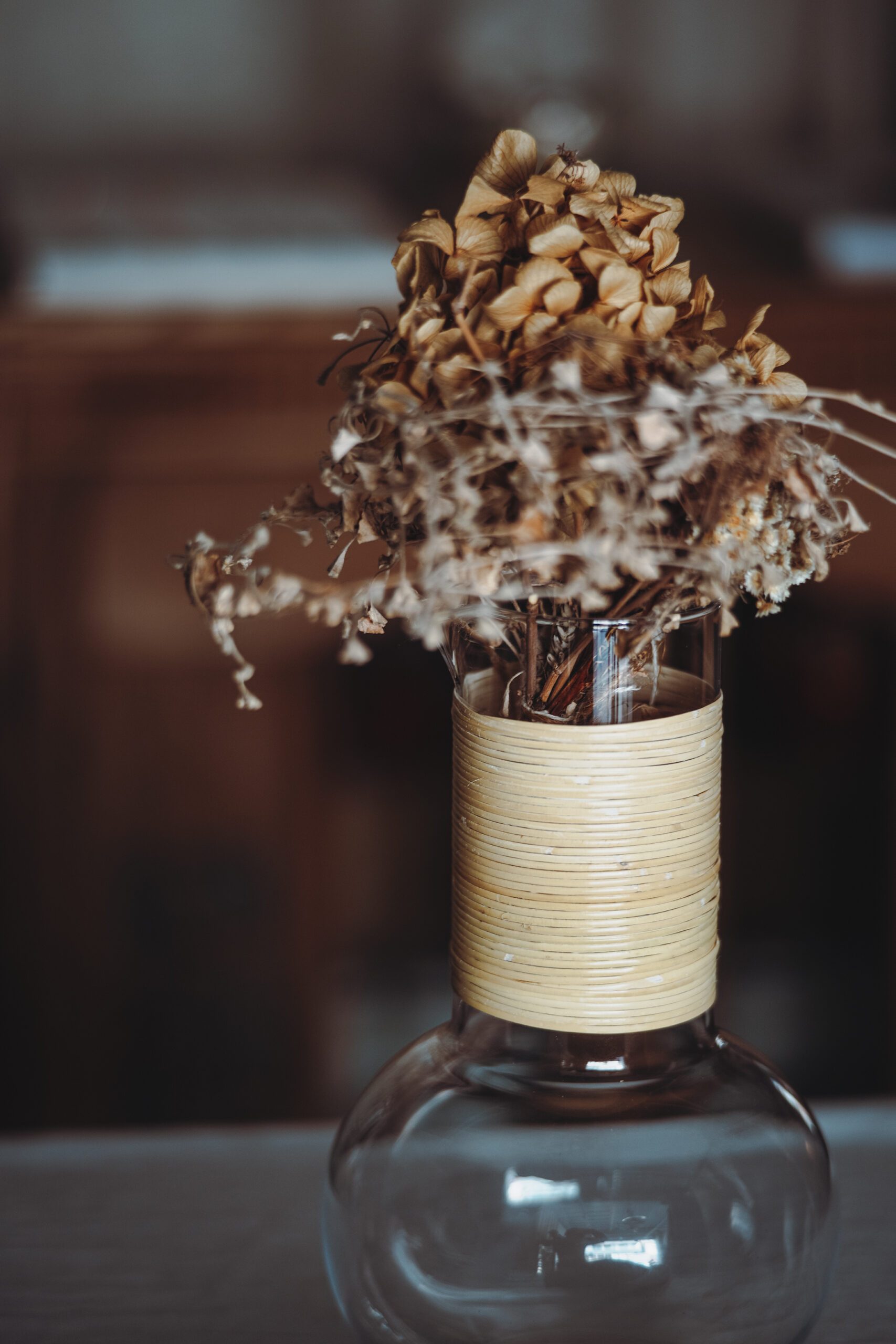 購入した時点では藤巻のないガラスだけの作品でしたが、ヴィンテージ市場で高額で取引されている藤巻モデルを再現しようと、Amazonで1,500円釣竿などに使われる籐2mm×9mを購入し見様見真似で巻いてみた。