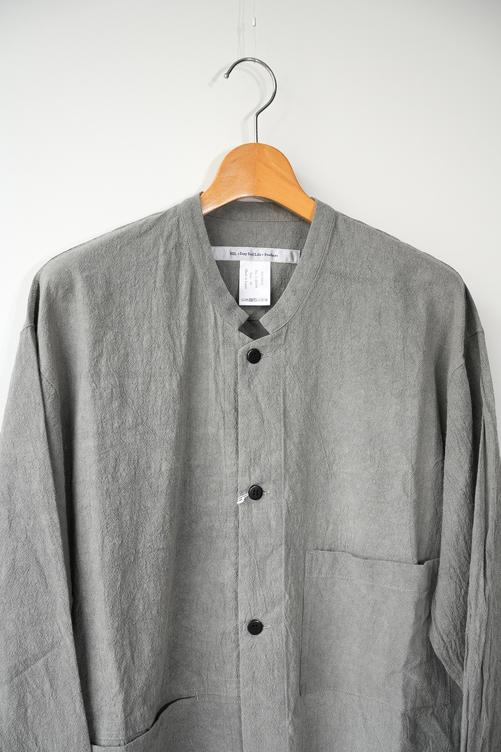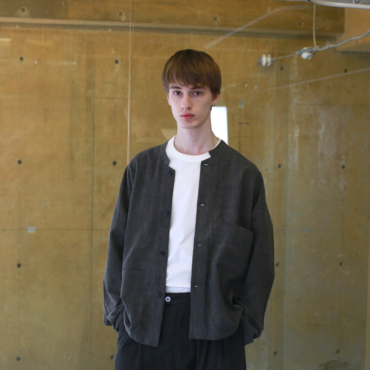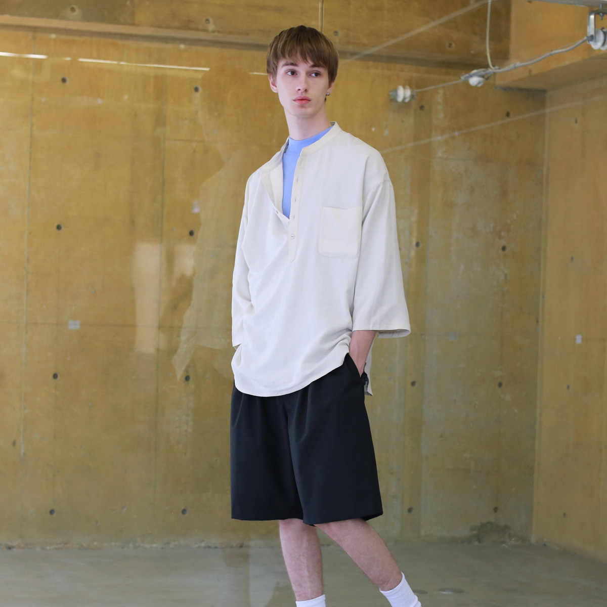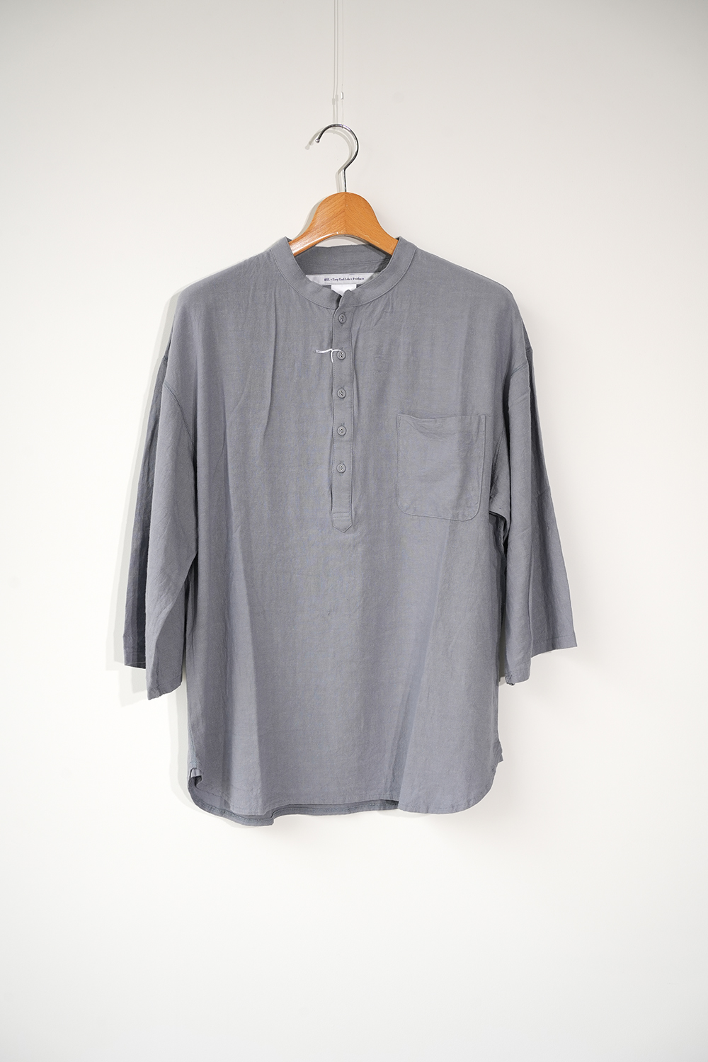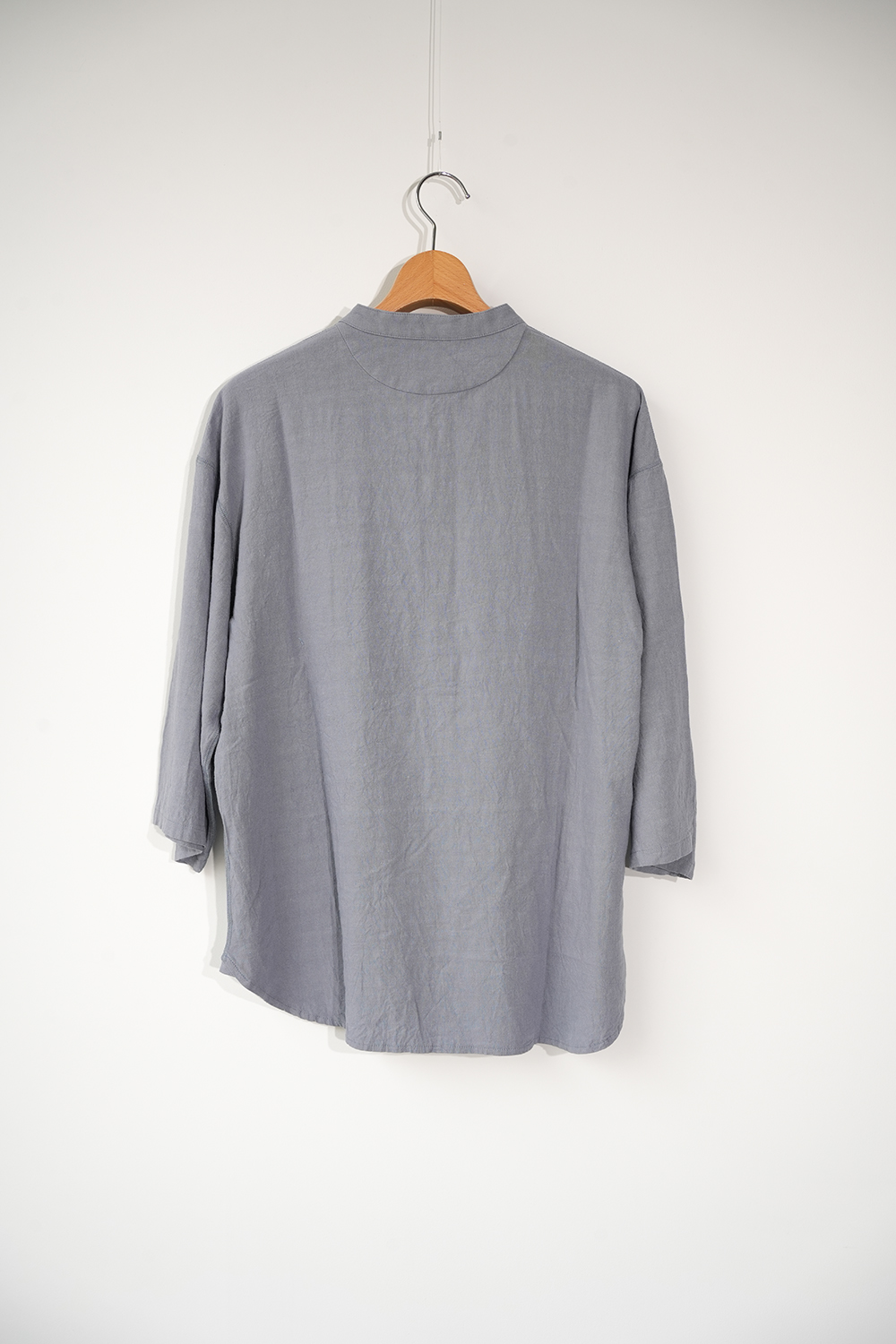 ヘンリーネックデザインのプルオーバーシャツ”チャコールヘンリー”、シャツ生地を用い、フラットシーマ縫製などカットソー縫製で仕上げたシャツとカットソーそれぞれの良さを組み合わせた一枚。ゆったりとしたゆとりのあるドロップショルダー、裾ラウンドカット、7分袖。