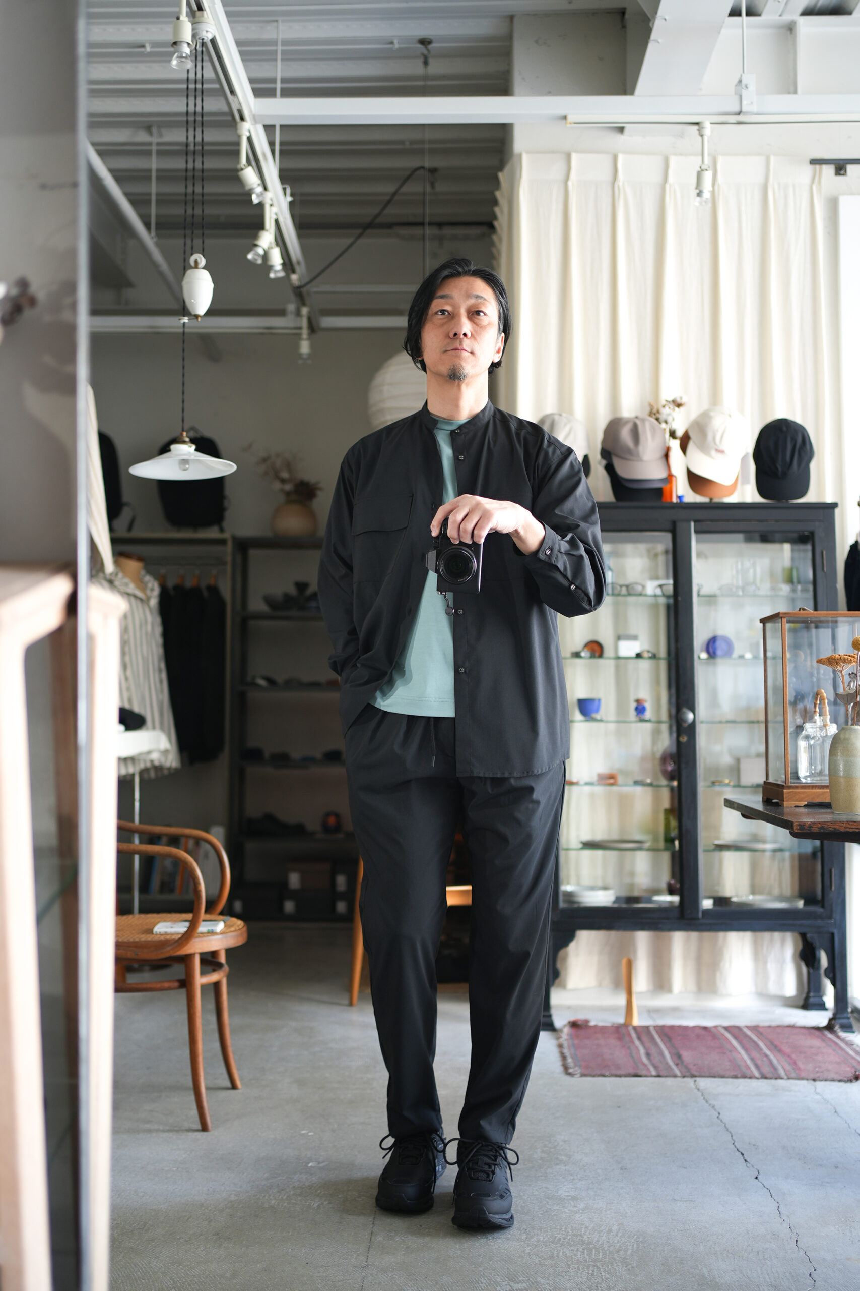 「White Mountaineering Repose Wear」バンドカラーシャツ & 3タックイージーテーパードパンツ。