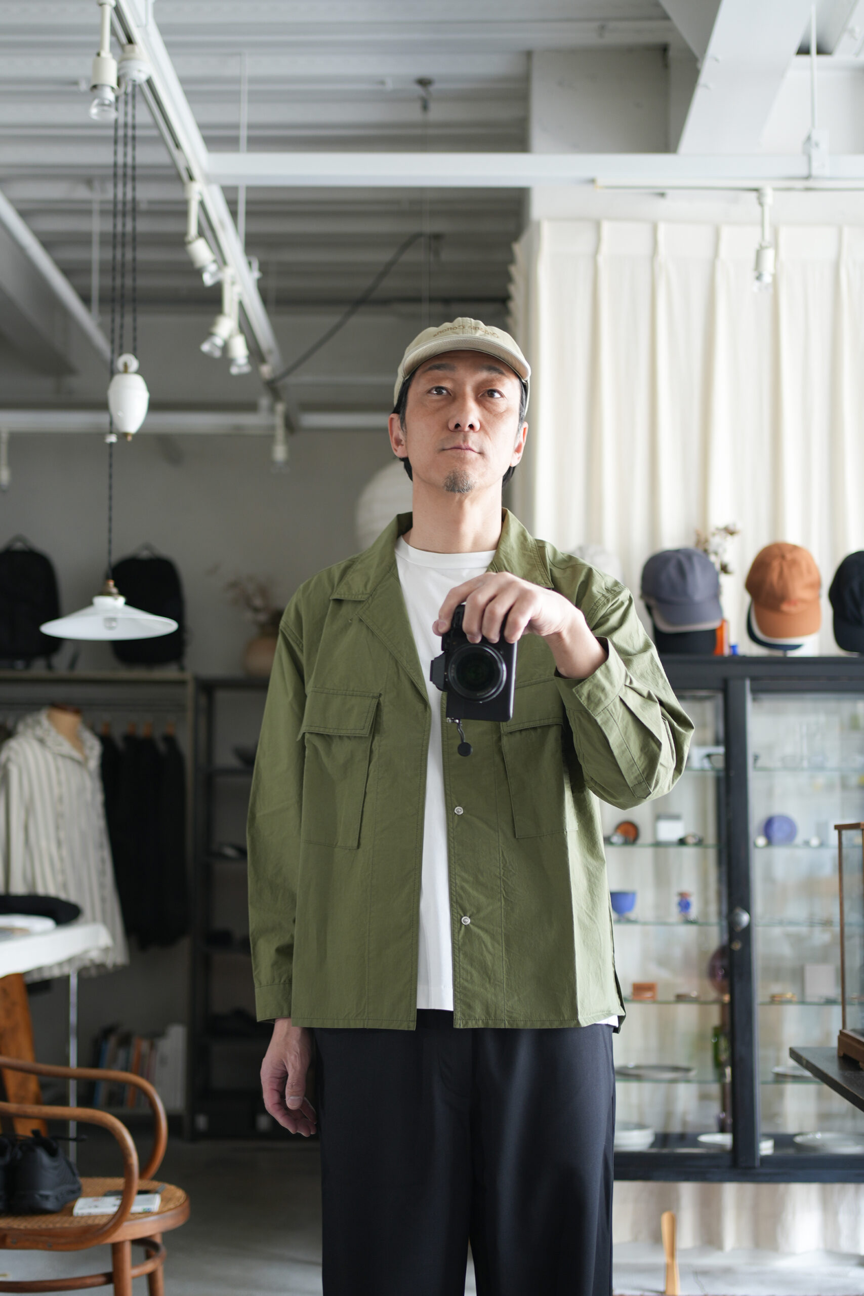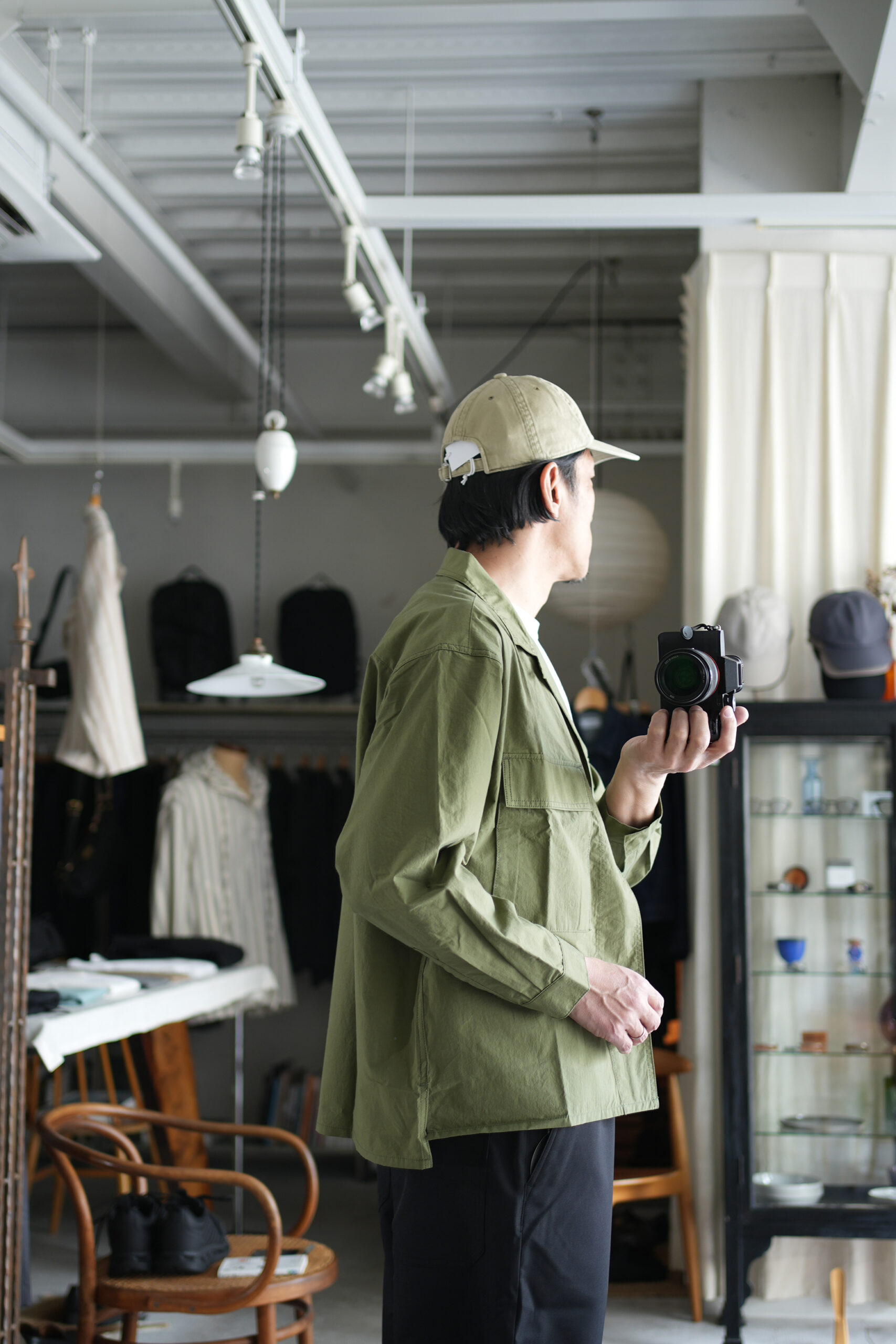 フロントボタンやカフス、ポケボタンをすべて隠しスナップボタンにすることにより、ボタンが一切見えないミニマルなデザイン。また高密度生地を樹脂と洗うことで表面が特別な張りが生まれている。シャツ生地ジャケットデザインの一枚。