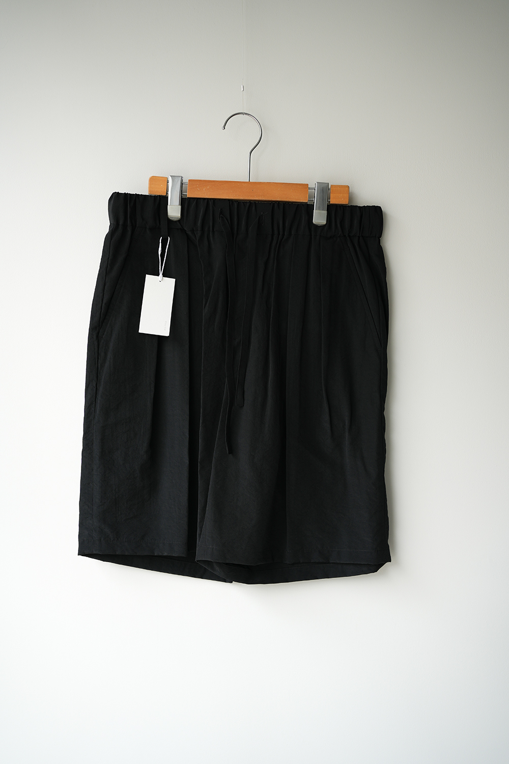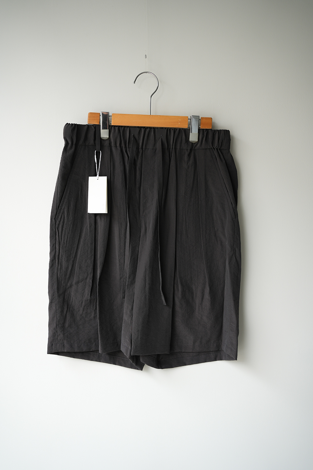 オーバーサイジングのワイドハーフパンツ。ウエストはイージー仕様の為、膝丈ほどのレングスと相まってリラックス感があります。股上はやや深めで全体的にやや A ラ気味のシルエットです。ウエストにはベルトループ風のキーループも御座います。肌との設置面も少なく夏場に重宝する1着です。北陸地方の老舗の機屋でおられた経糸キュプラ×緯糸リサイクルナイロンのタフタ素材。上品な光沢とドレープ性がありエレガントな印象ながら塩縮加工を施すことでヴィンテージの様なシュリンク感、柔らかな風合いに仕上げています。適度な照感と塩縮加工により、何処か90sのスポーツウェア感とモード感も同居します。