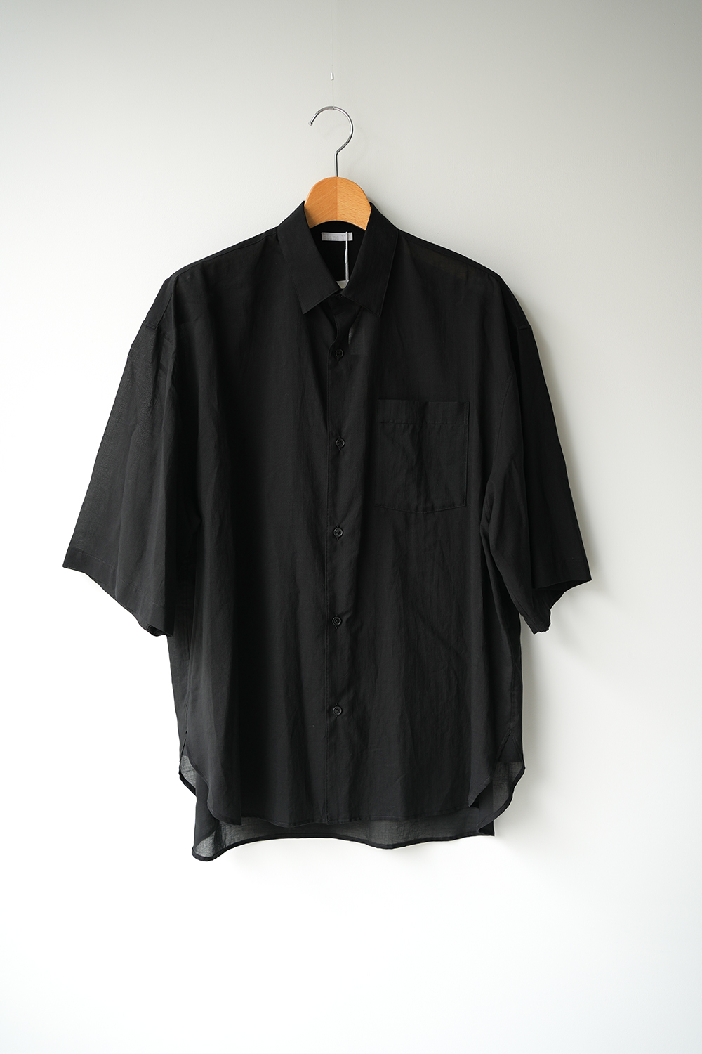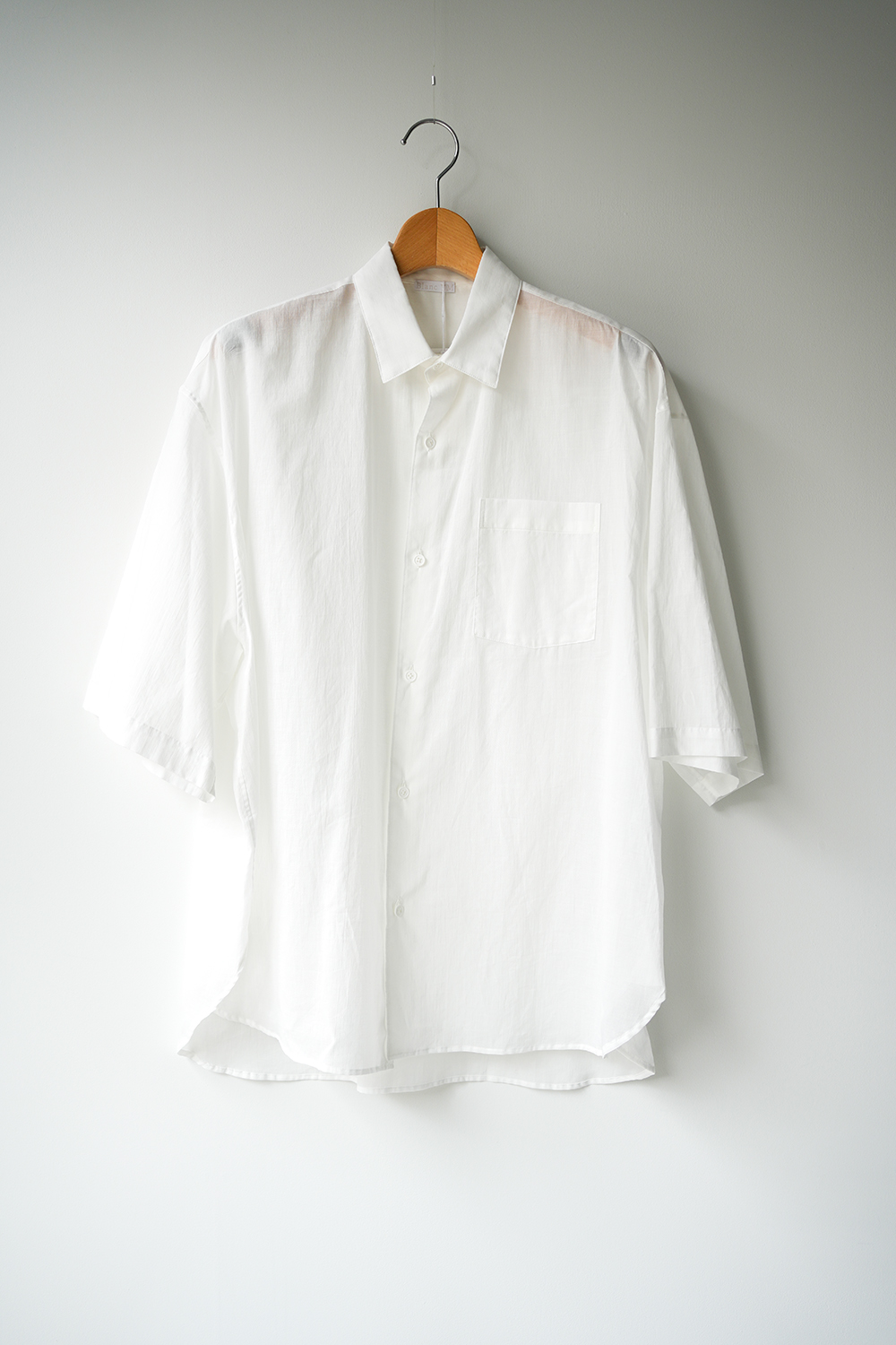 Blanc YMの定番のワイドシャツをハーフスリーブにてリリース。ゆったりとしたオーバーサイジングなシルエットを生かし袖筒幅も広く、肘丈程のゆったりとしたデザイン。また後ろ身頃は通常よりもやや大きめにとり、横、後ろ姿はシャツの範疇ながらライトアウターの 様な雰囲気もございます。静岡の遠州地方で織られた100%コットン生地を使用。糸はスーピマ超長綿。ほんの僅かに毛羽を残した柔らかな質感とスーピマコットン特有の光沢があり、光を通す様な適度な透け感があります。洗い晒しで着用しても馴染む程良いシワ感で着用できる素材です。またとても計量な素材でSSシーズンのレイヤードとしてはストレスフリーです。