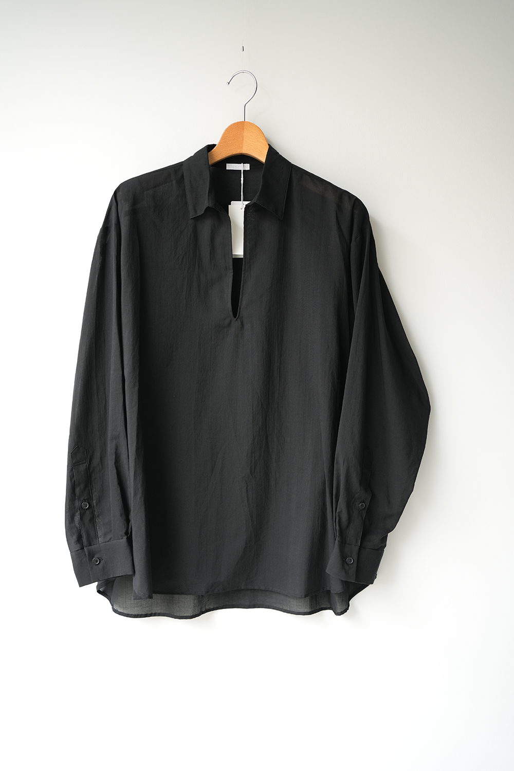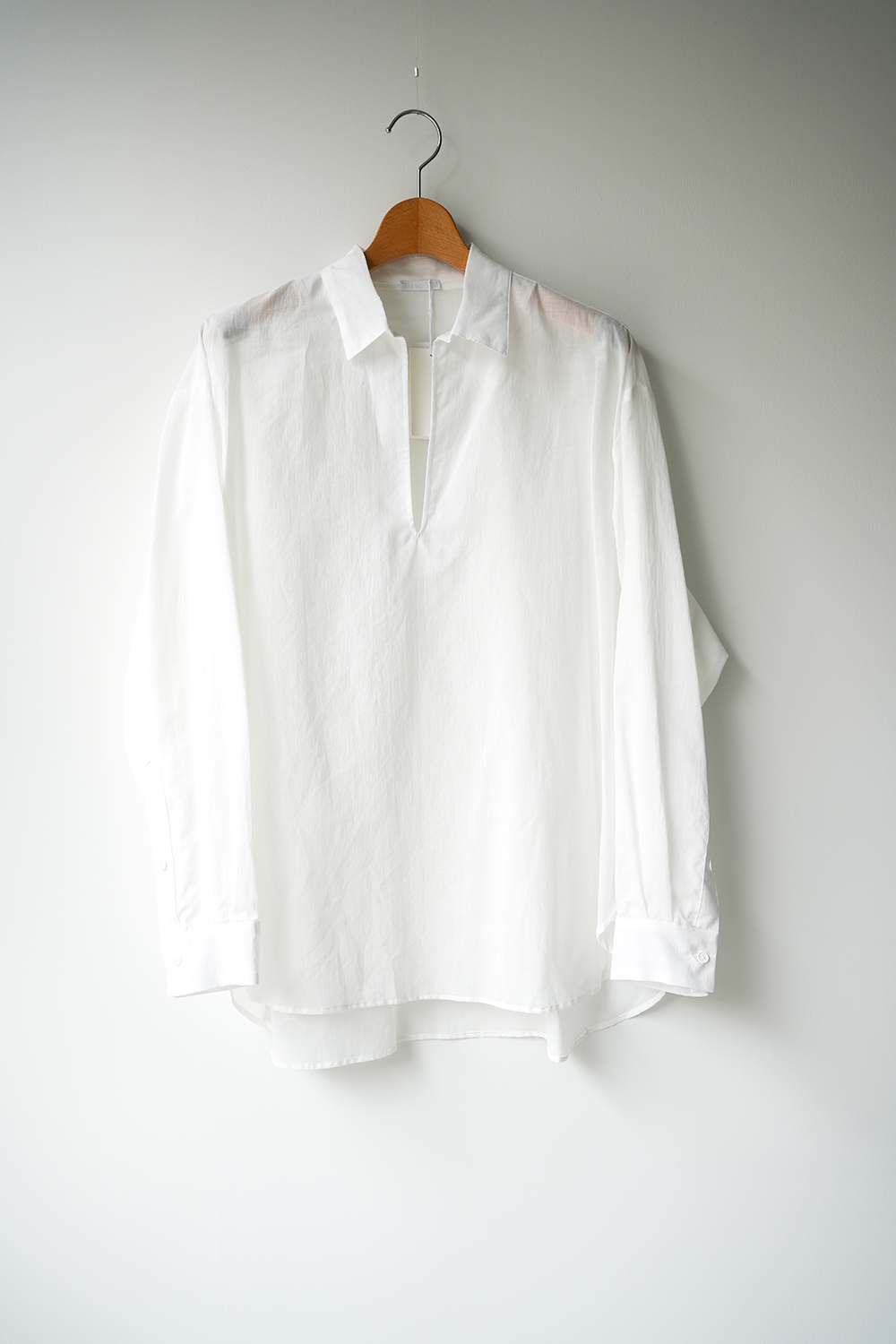 Blanc YM 定番のスキッパーシャツ。ワイドシャツ同様に後ろ身頃は通常よりもやや大きめにとり、横、後ろ姿はシャツの範疇ながらライトアウターの様な雰囲気もございます。襟元は程良い空き具合でインナー次第で見え方も変わる為スタイリングの幅があります。また切り替えも無く、ステッチも極力抑え、柔らかな生地がドレープする仕様が魅力です。静岡の遠州地方で織られた100%コットン生地を使用。糸はスーピマ超長綿。ほんの僅かに毛羽を残した柔らかな質感とスーピマコットン特有の光沢があり、光を通す様な適度な透け感があります。洗い晒しで着用しても馴染む程良いシワ感で着用できる素材です。またとても計量な素材でSSシーズンのレイヤードとしてはストレスフリーです。