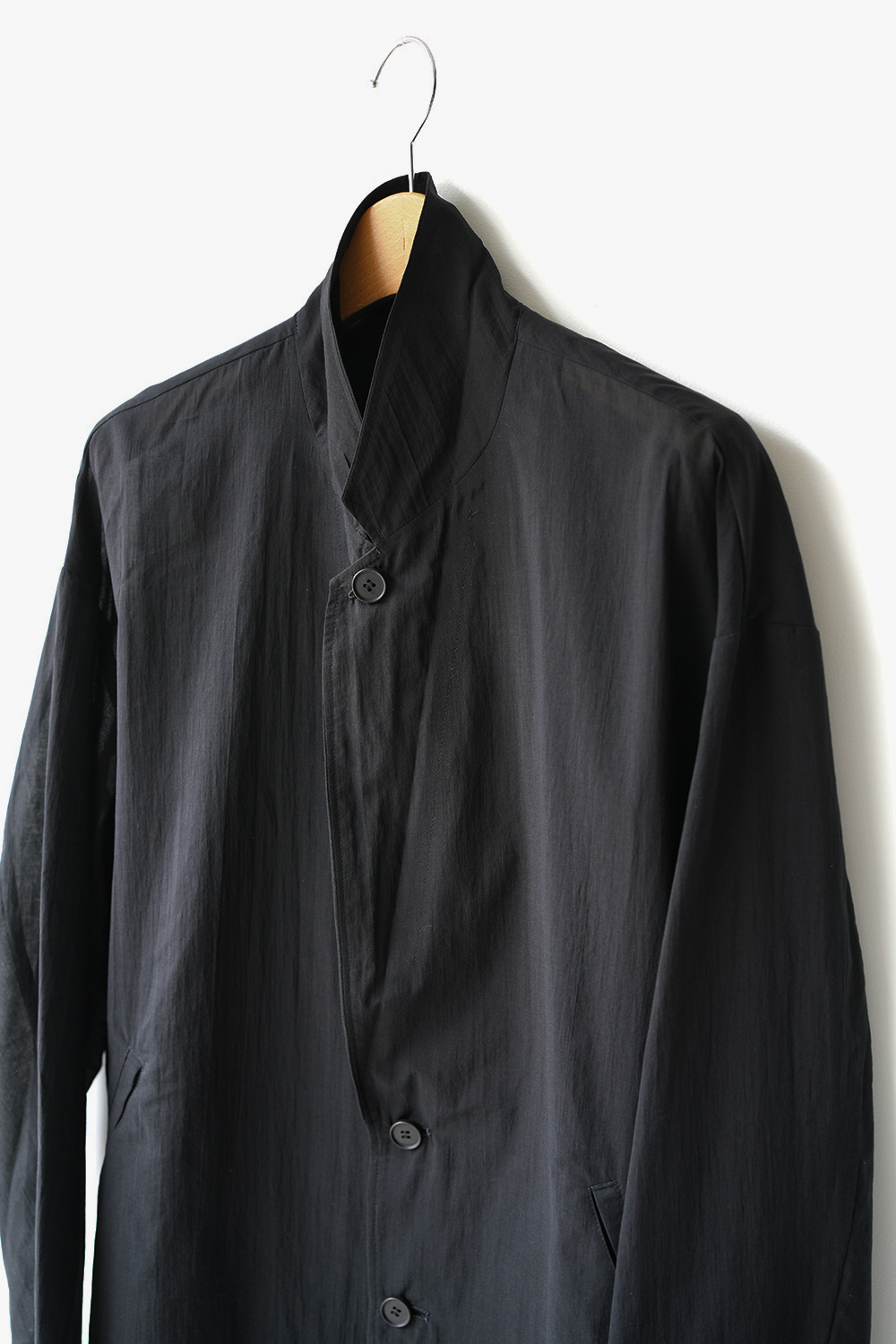 糸はスーピマ超長綿。ほんの僅かに毛羽を残した柔らかな質感とスーピマコットン特有の光沢があり、光を通す様な適度な透け感があります。洗い晒しで着用しても馴染む程良いシワ感で着用できる素材です。またとても計量な素材でSS シーズンのレイヤードとしてはストレスフリーです。
