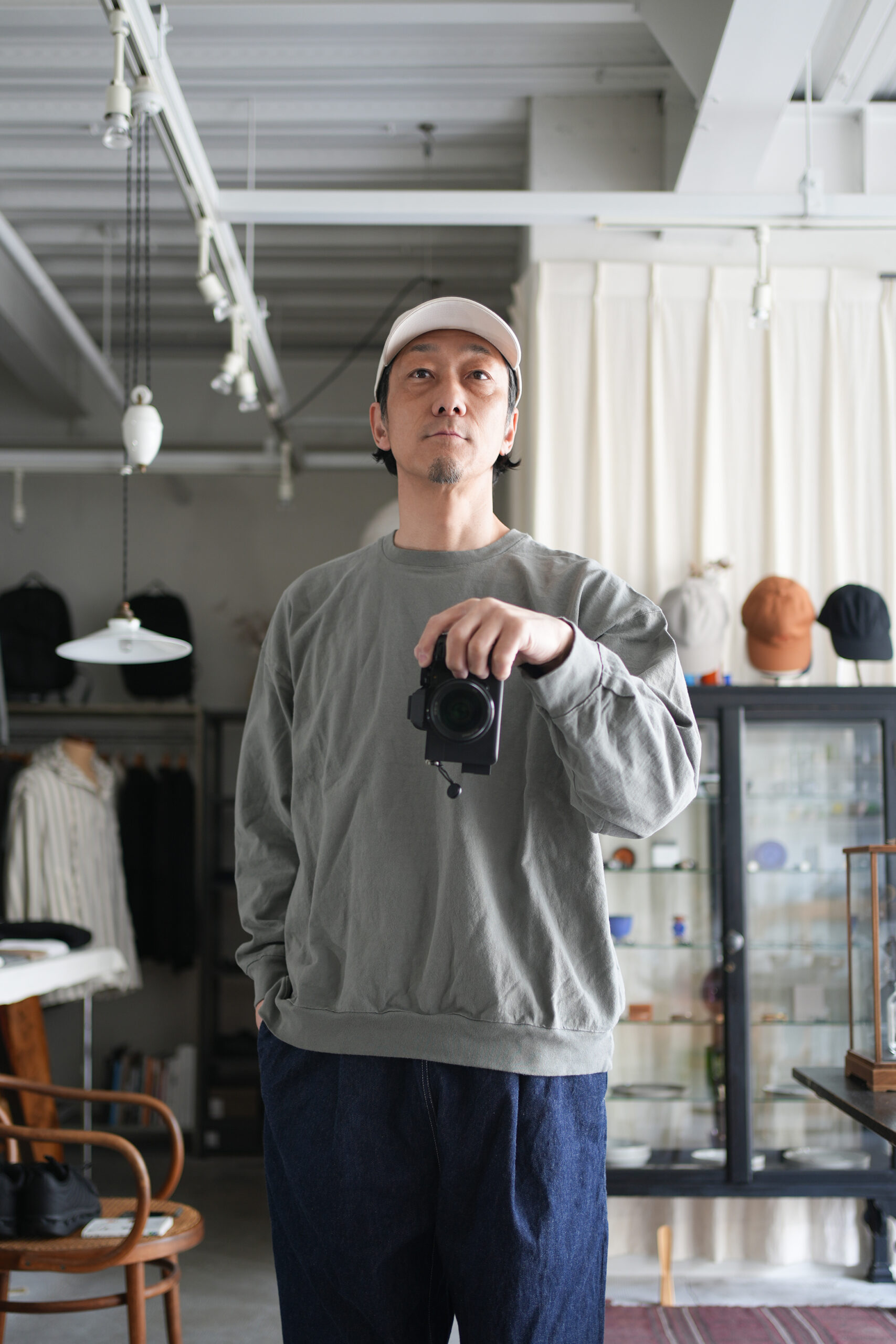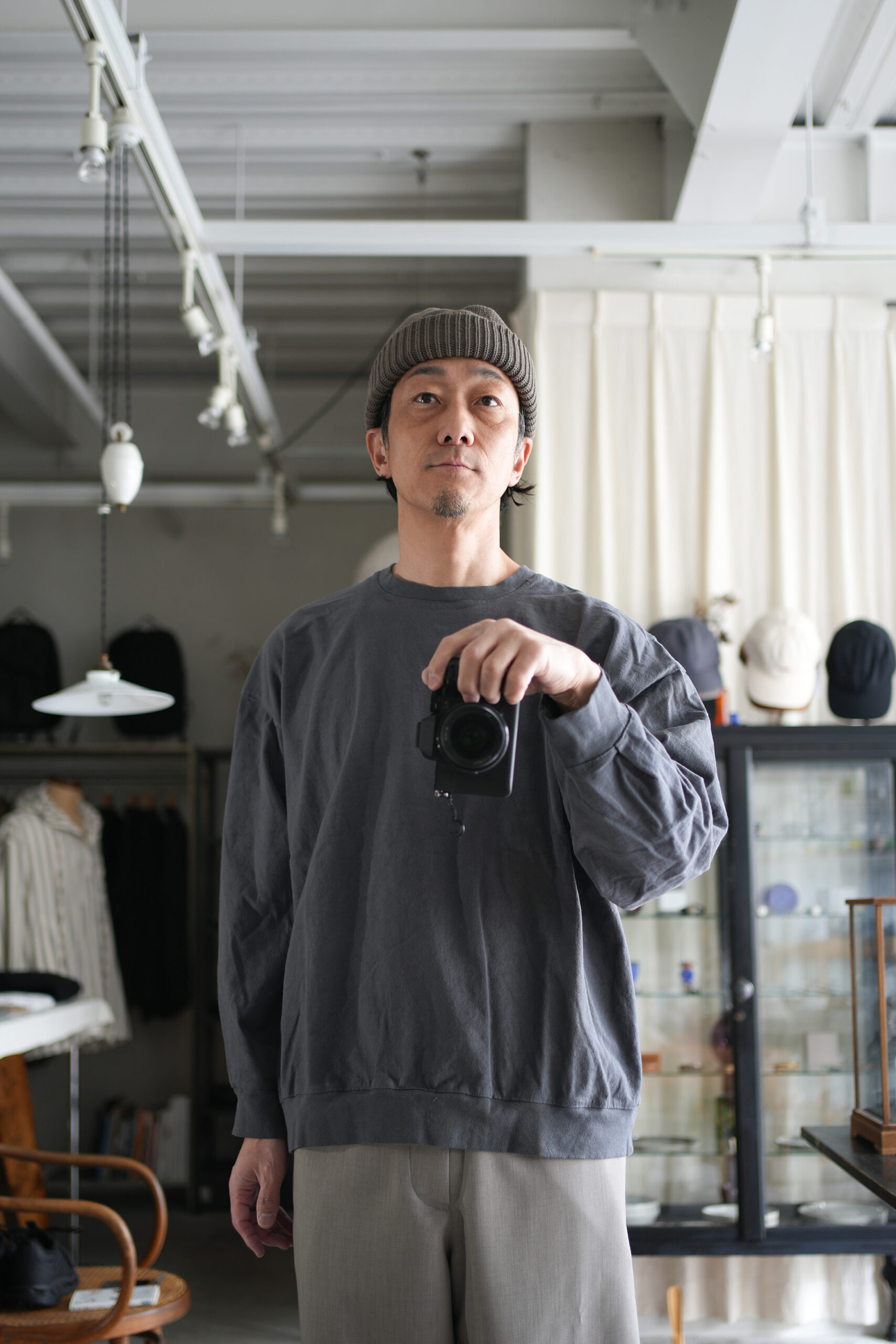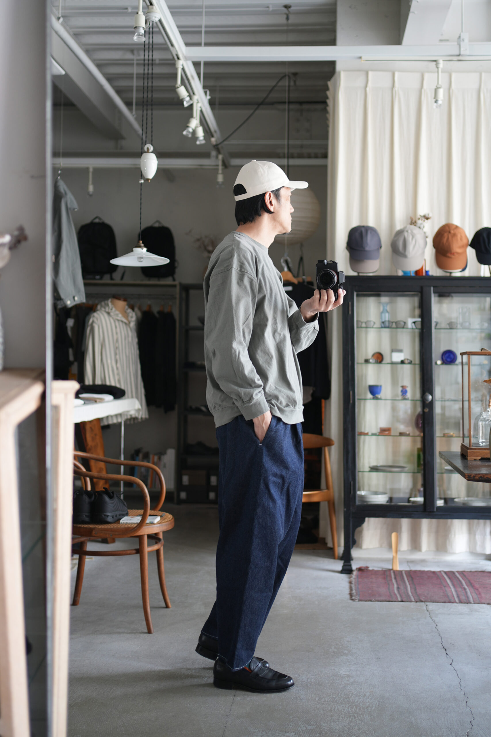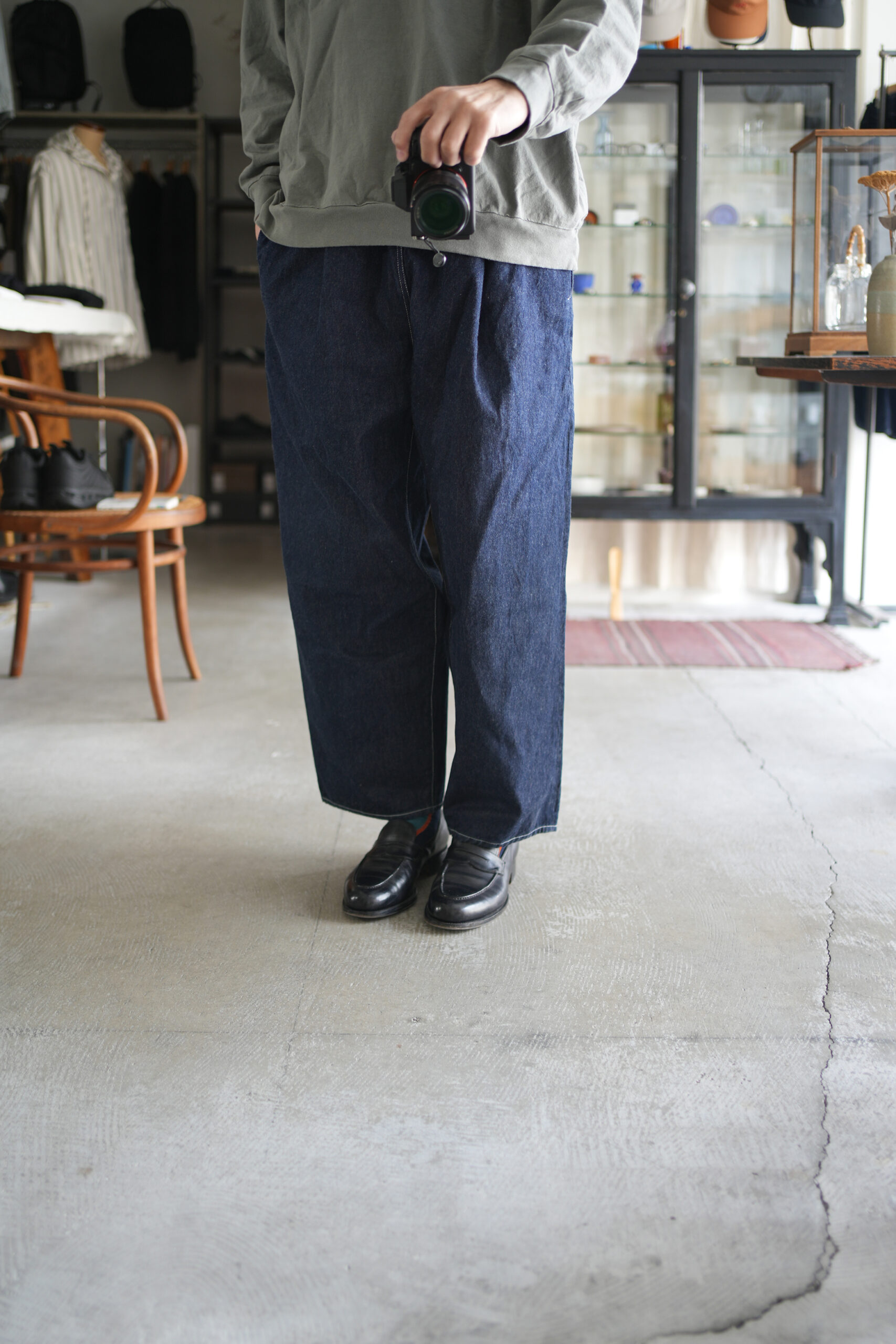 シャトル織機で織ったセルビッチインディゴデニム、なんて事のない気軽に穿けるデニム生地を目指して作った生地なので”コモン=一般的な”と名付けられた。織りによる自然な伸縮性と柔らかな仕上げで穿き心地良し、ワイドテーパードシルエット、9.5分丈、ウェストゴムと紐仕様。