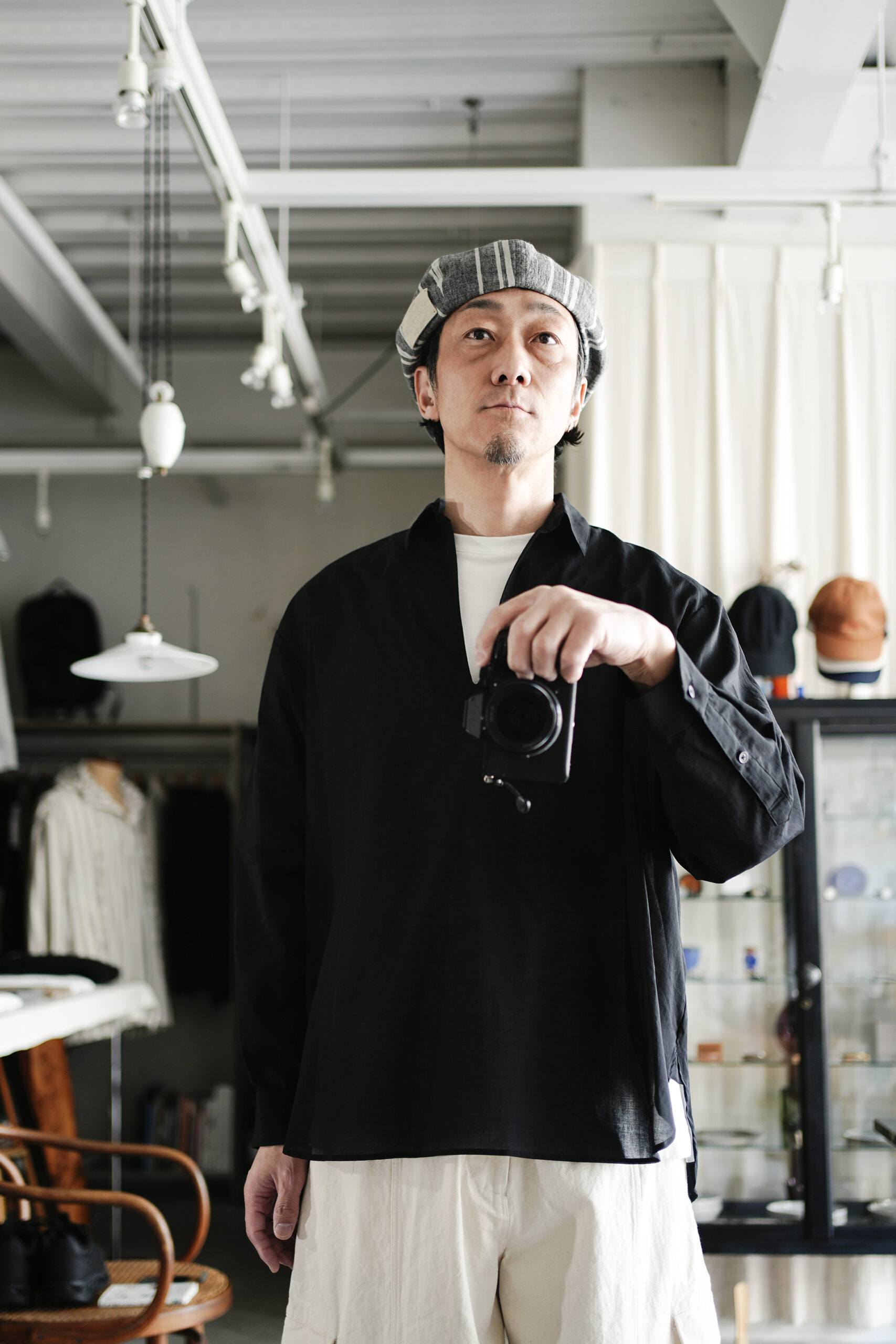 Blanc YM 定番のスキッパーシャツ。ワイドシャツ同様に後ろ身頃は通常よりもやや大きめにとり、横、後ろ姿はシャツの範疇ながらライトアウターの様な雰囲気もございます。襟元は程良い空き具合でインナー次第で見え方も変わる為スタイリングの幅があります。また切り替えも無く、ステッチも極力抑え、柔らかな生地がドレープする仕様が魅力です。静岡の遠州地方で織られた100%コットン生地を使用。糸はスーピマ超長綿。ほんの僅かに毛羽を残した柔らかな質感とスーピマコットン特有の光沢があり、光を通す様な適度な透け感があります。洗い晒しで着用しても馴染む程良いシワ感で着用できる素材です。またとても計量な素材でSSシーズンのレイヤードとしてはストレスフリーです。