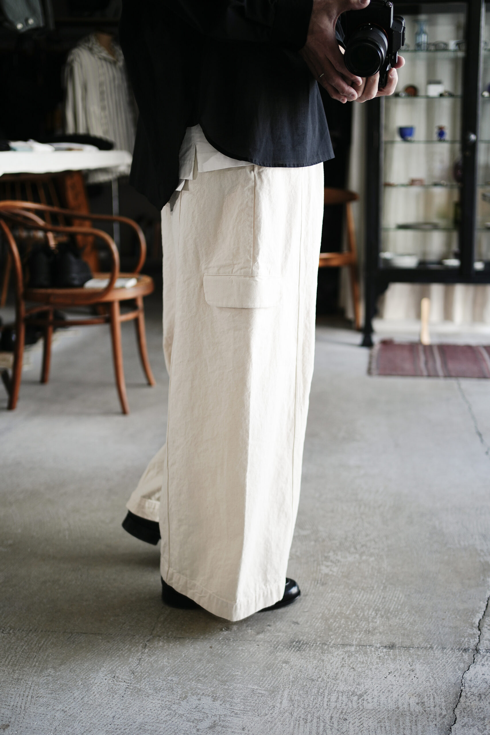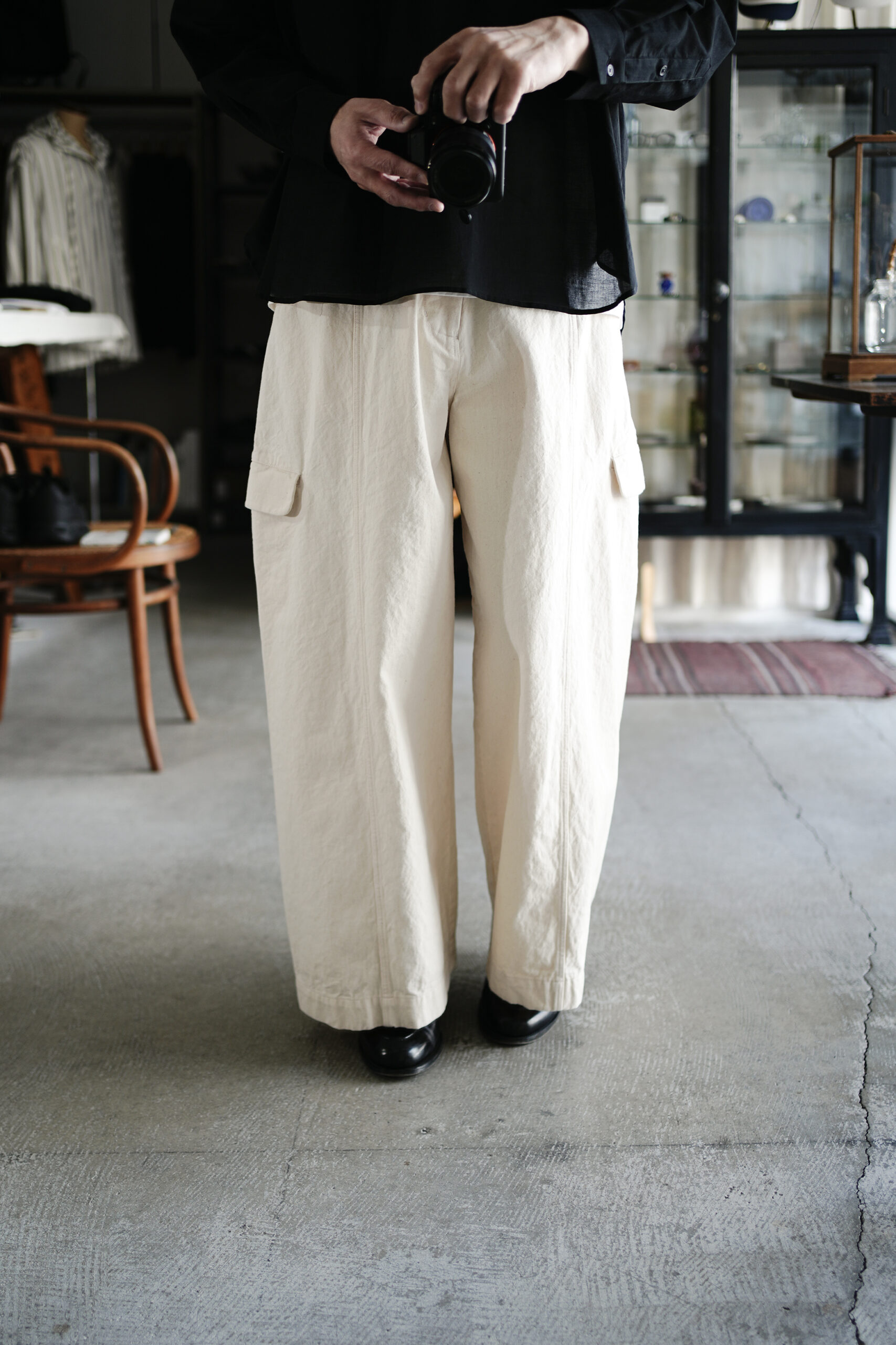 10ozのデ二ム生地を使用したジャケット感覚のカーゴワイドデニムパンツ。顔料プリントを施し縫製後に洗いをかけることによる独特の風合い。