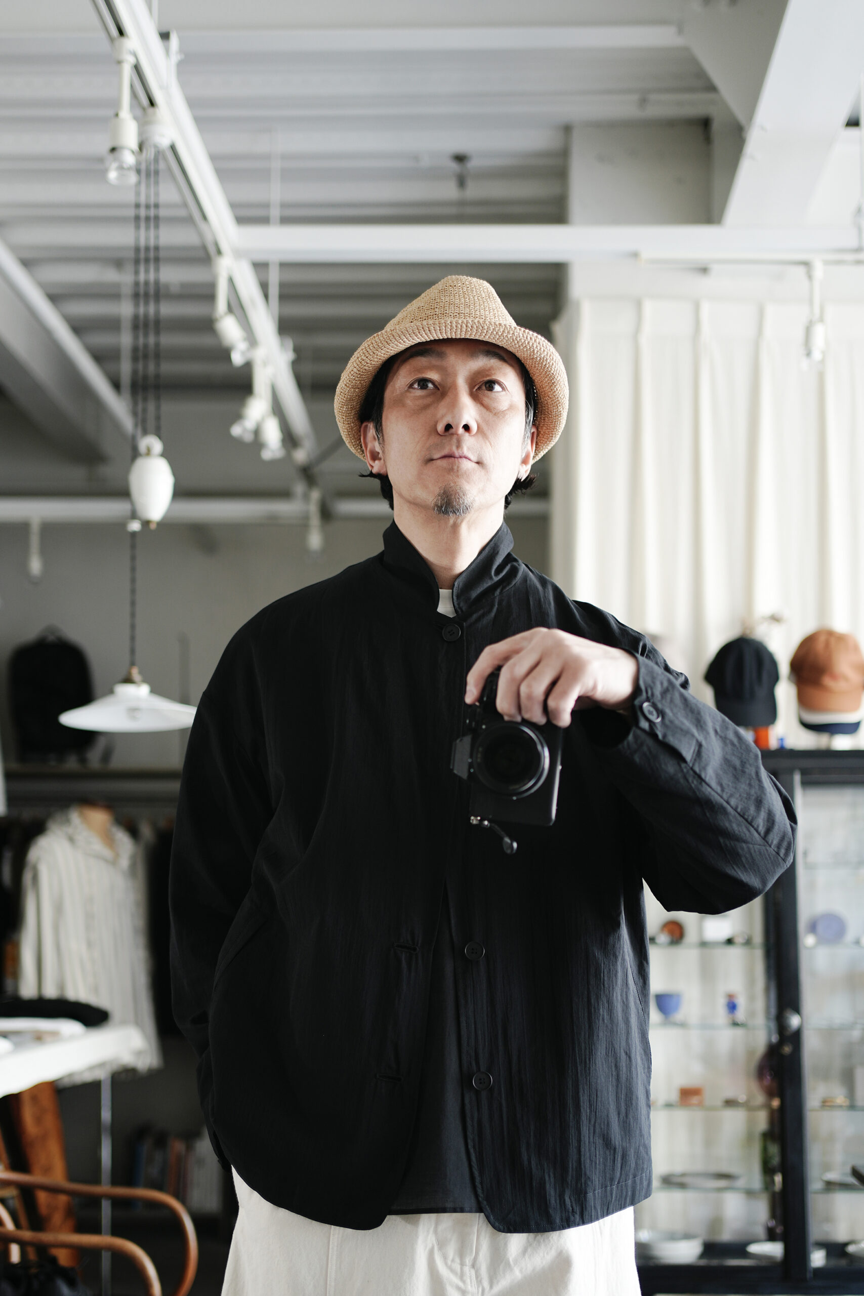 Blanc YM 定番のスキッパーシャツ。ワイドシャツ同様に後ろ身頃は通常よりもやや大きめにとり、横、後ろ姿はシャツの範疇ながらライトアウターの様な雰囲気もございます。襟元は程良い空き具合でインナー次第で見え方も変わる為スタイリングの幅があります。また切り替えも無く、ステッチも極力抑え、柔らかな生地がドレープする仕様が魅力です。静岡の遠州地方で織られた100%コットン生地を使用。糸はスーピマ超長綿。ほんの僅かに毛羽を残した柔らかな質感とスーピマコットン特有の光沢があり、光を通す様な適度な透け感があります。洗い晒しで着用しても馴染む程良いシワ感で着用できる素材です。またとても計量な素材でSSシーズンのレイヤードとしてはストレスフリーです。