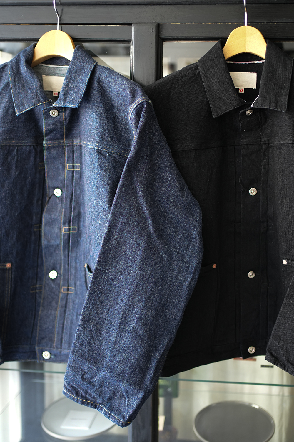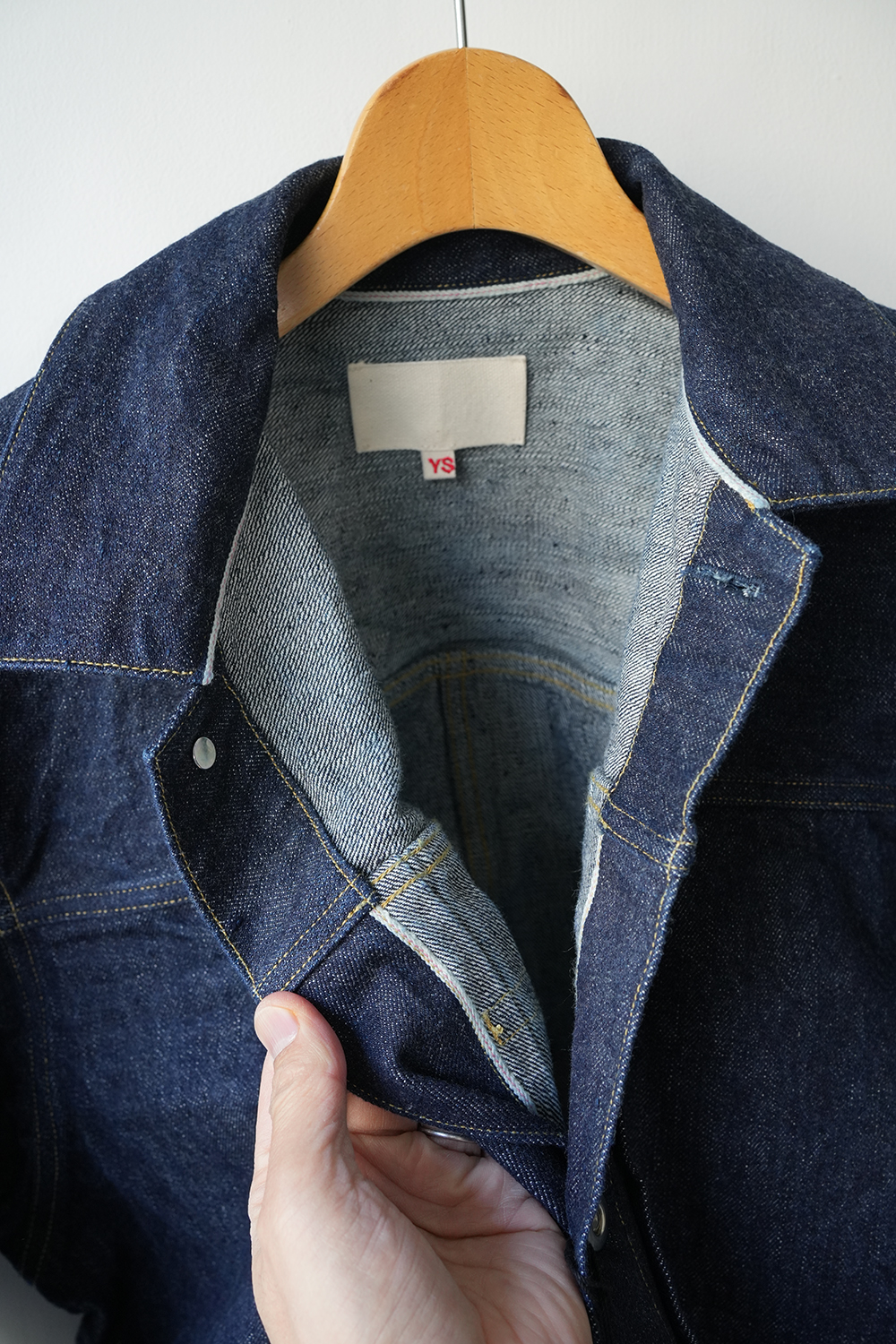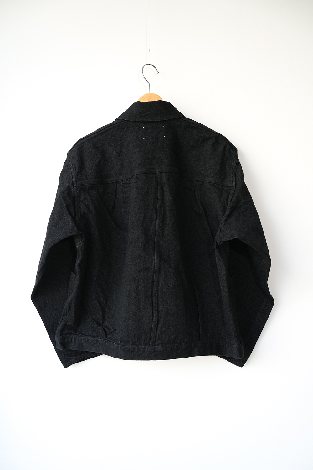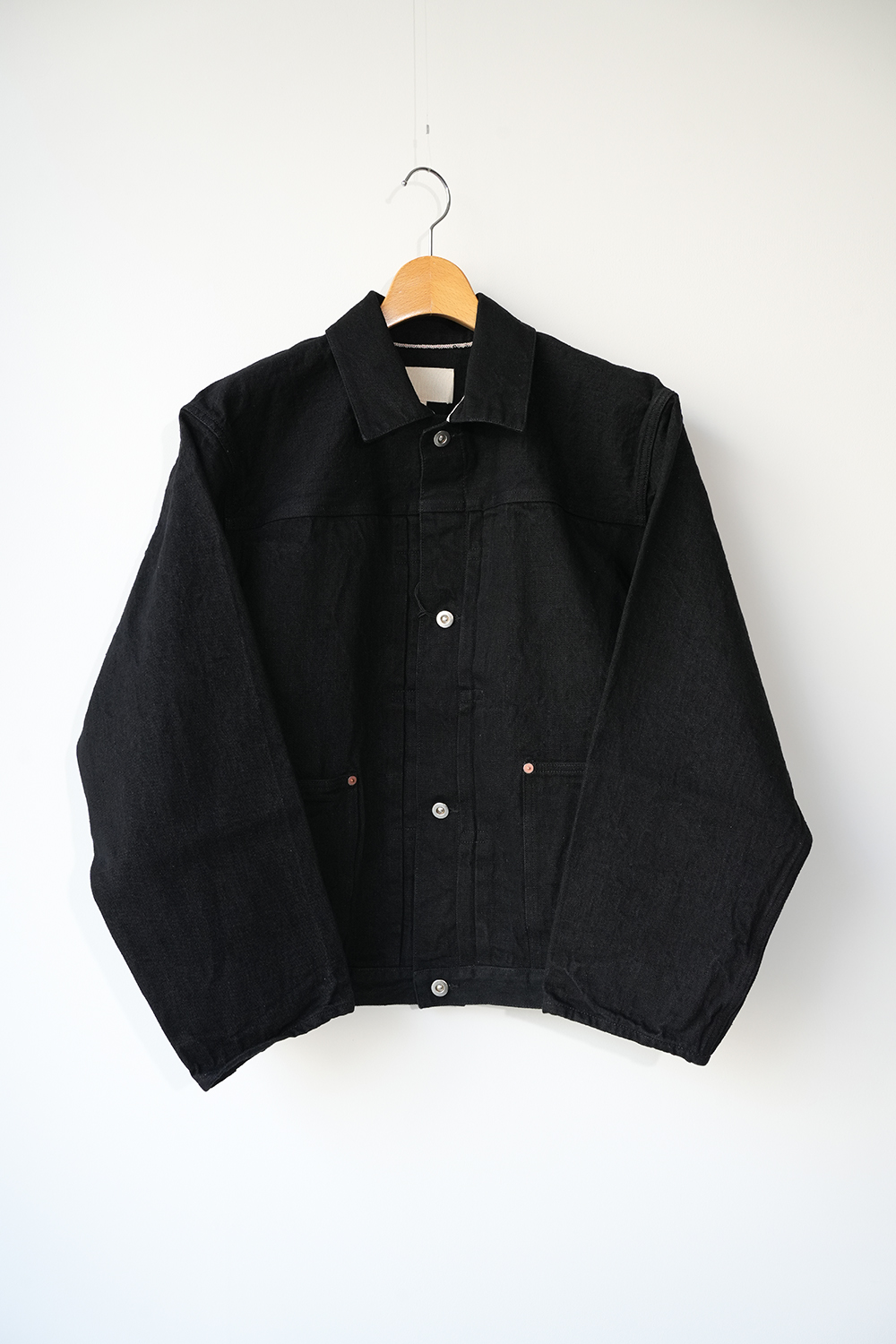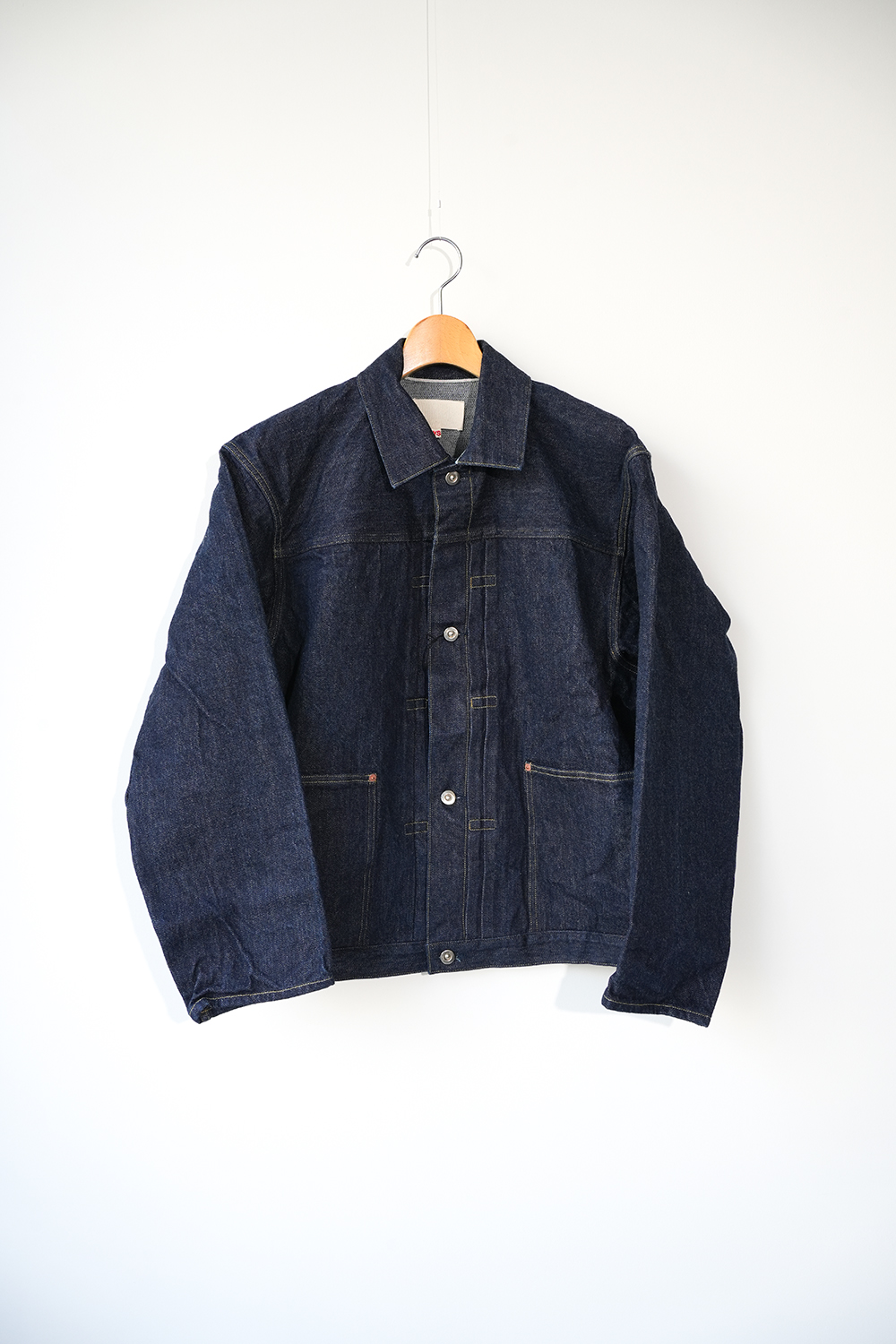 岡山県の機屋にて 、ゆっくりと丁寧に織り上げた、独自の風合いが特徴のセルビッチデニム。製織後、水洗いや防縮加工を含めた仕上げ加工が一切施されていない生機デニムを使用しております。旧式織機を用いる為、生産効率は非常に低く、1時間にわずか数メートルしか織る事が出来ません。しかし、この丁寧な 製法により、経糸に無理な張力を掛ける事無く、シャリ感と膨らみを併せ持つ、他には無い風合いの生地に仕上がりました。厳選した綿花を使用し、繊維の質感や長さを吟味。さらにシャリ感のある手触りを実現する為、撚り回数や形状にも細部まで 拘っています。柔らかく軽めで着心地の良い生地感、ワンウォッシュ仕上げ。ゆとりのあるシルエット、袖先にボタンディテールない筒デザイン、腹部左右にポケットあり。