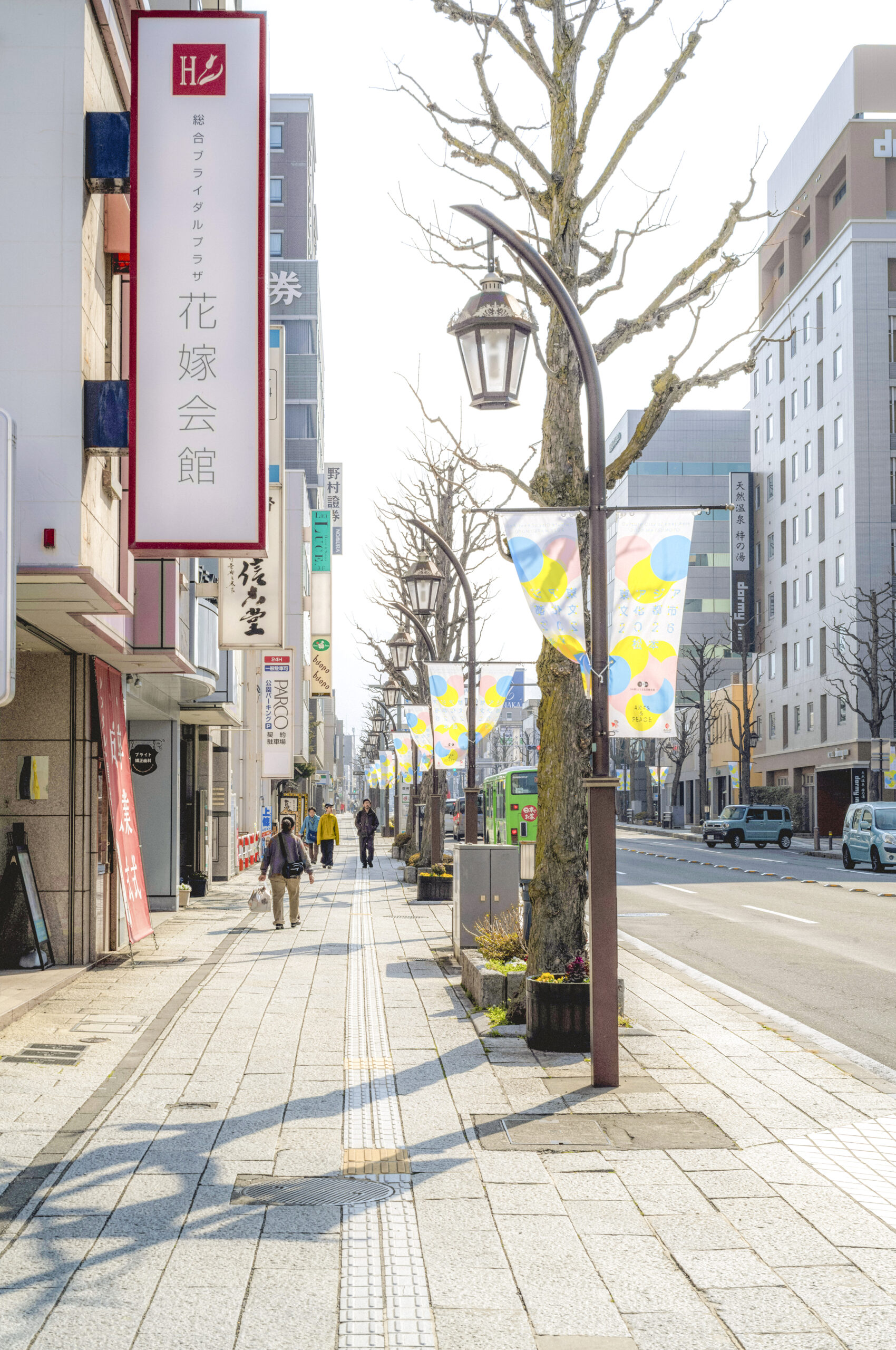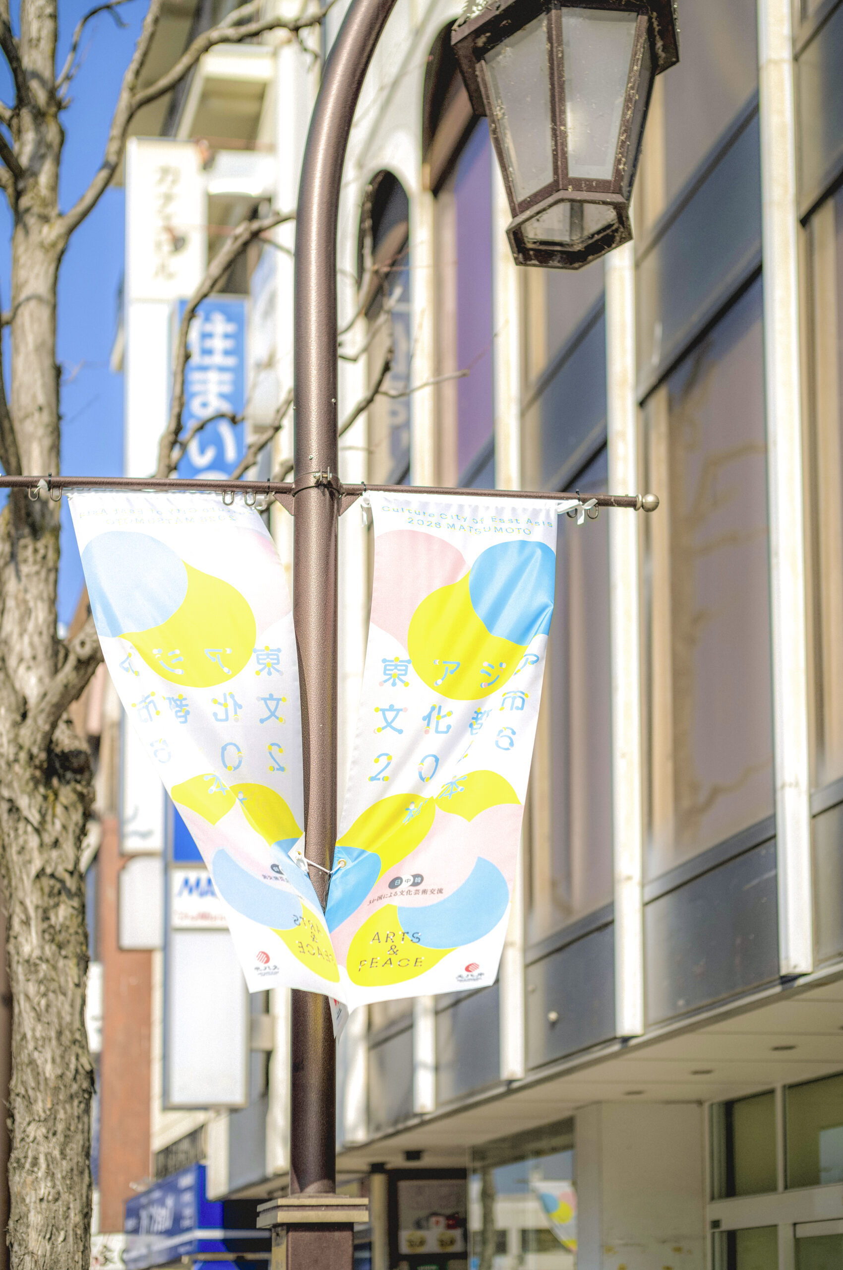 春めきと共に街にたなびき始めた「東アジア文化都市2026松本」の旗。
