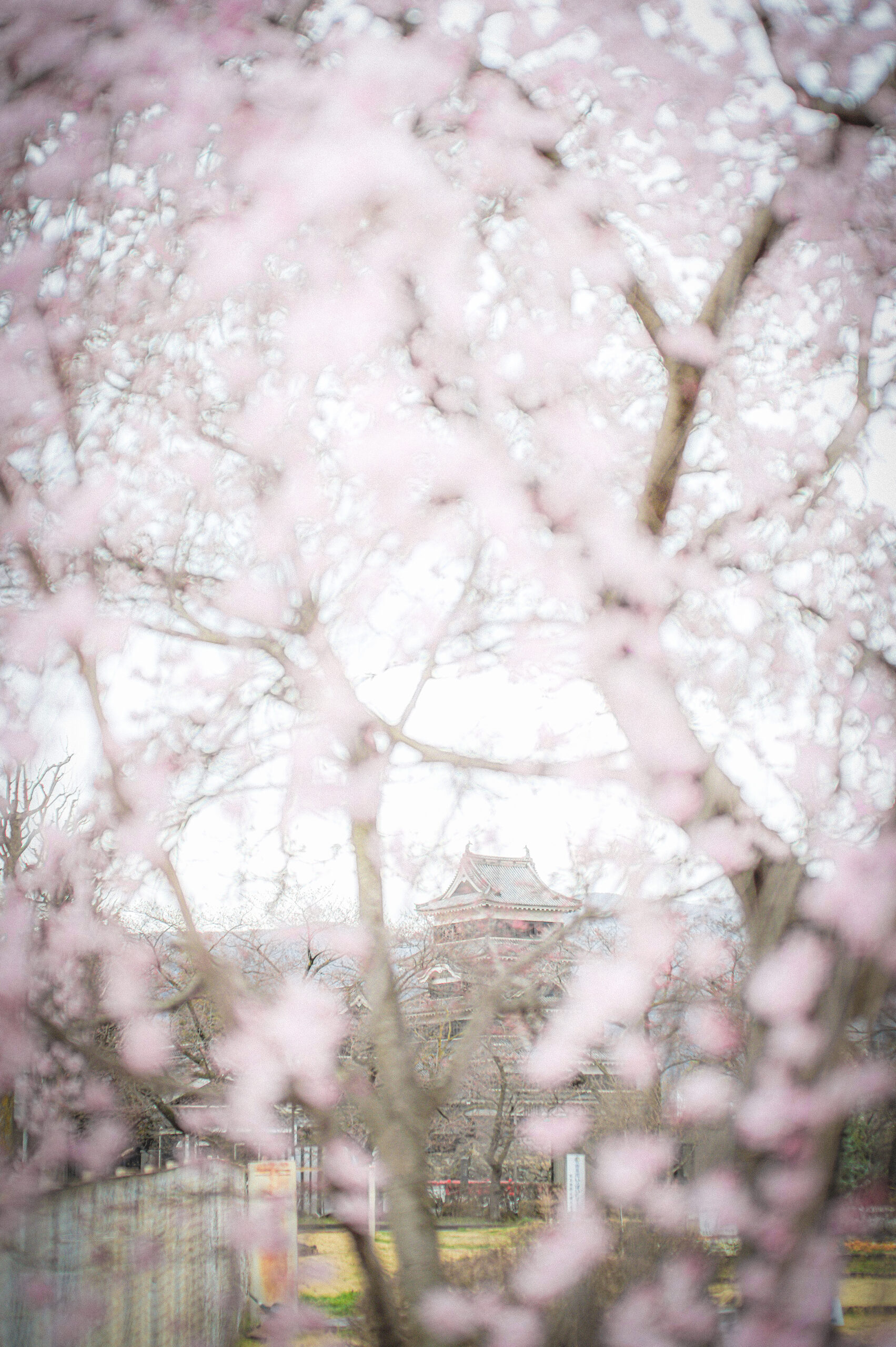 お堀の桜はまだまだ蕾ですが、品種分からぬ早咲きの桜花越しに雨にけぶる松本城を収める。
