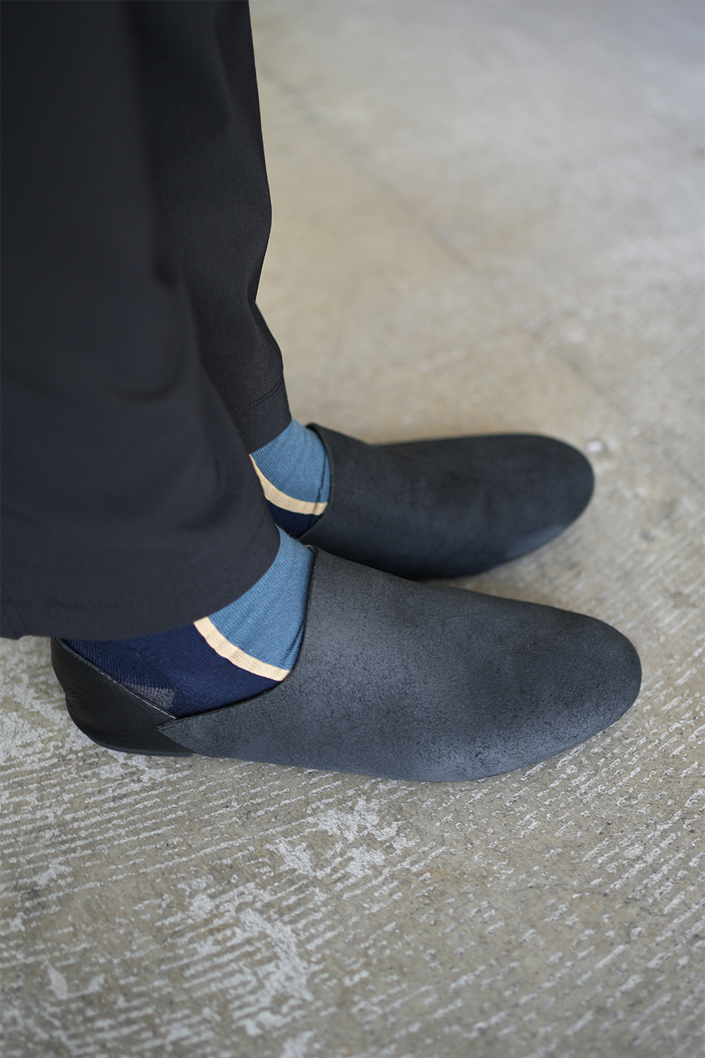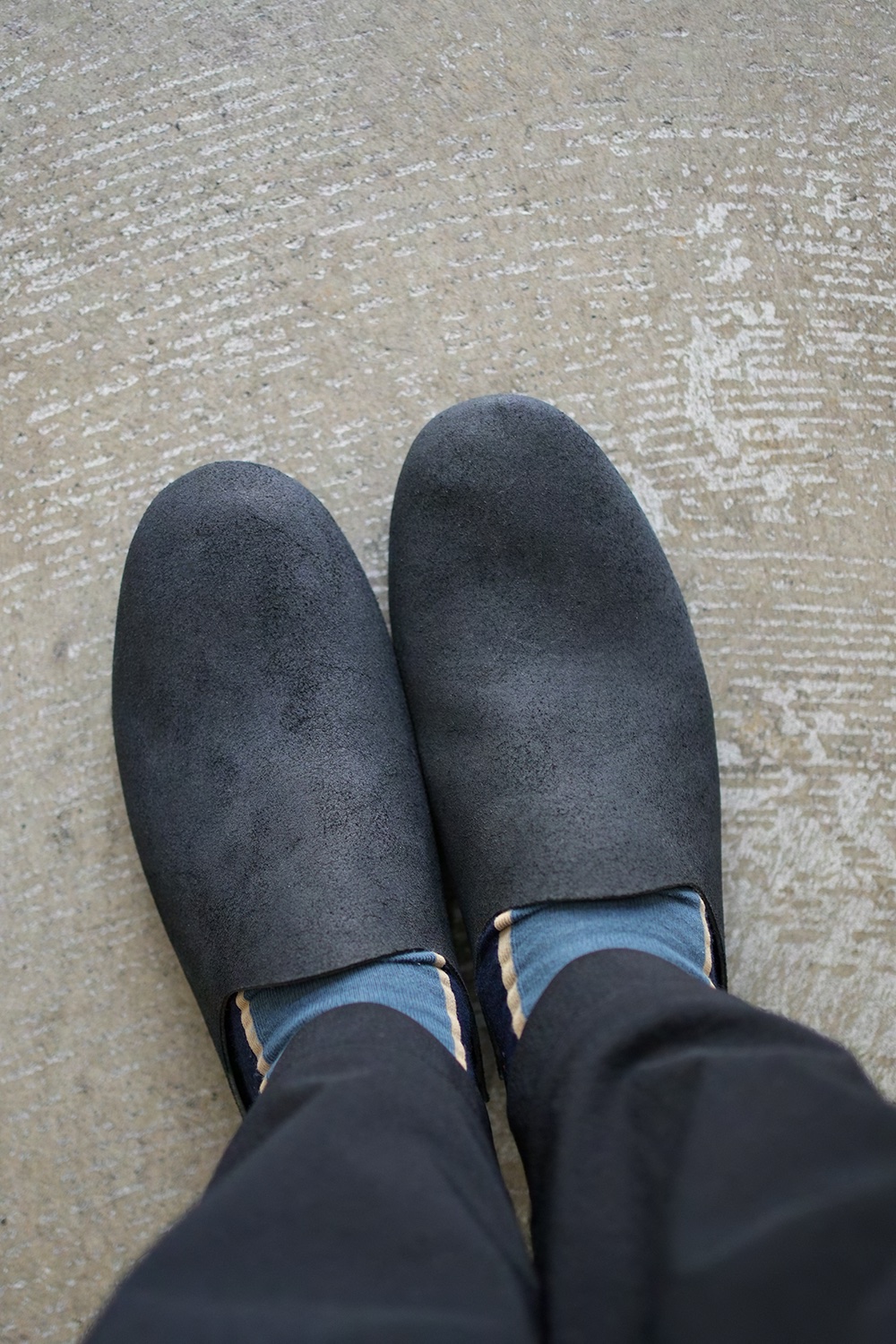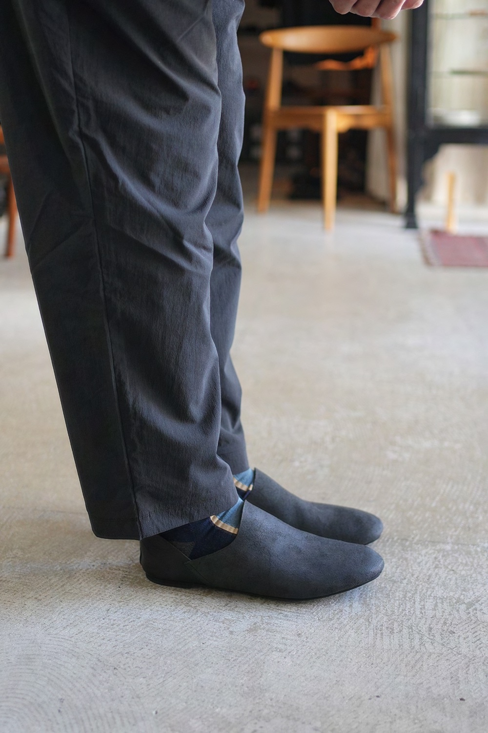 1枚革で仕立てられたバブーシュの様なルームシューズ、ラバーソール+マッケイ製法により外での着用が可能な仕様となっております。かかとはあえて折りたたんでいるデザインとなります。その為上げて履くことを推奨しておりません。PiPPO leatherは、イタリアンオイルスエード。革の裏面をわざと加工した、他にはない独特な表情でとても雰囲気が良いです。特性上クラッキング(革の割れやヒビ)がところどころ見受けられます。