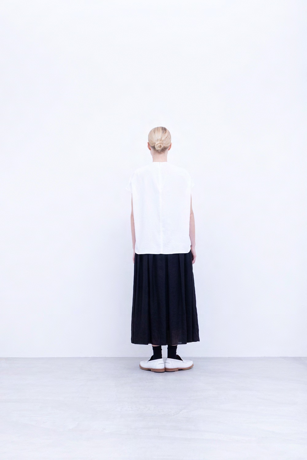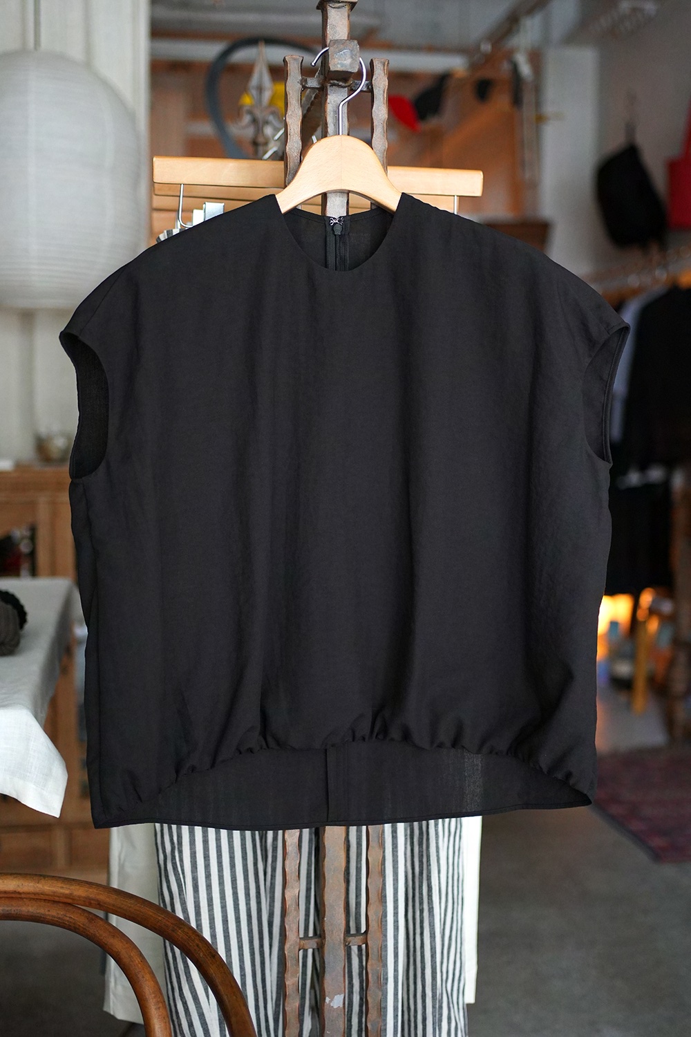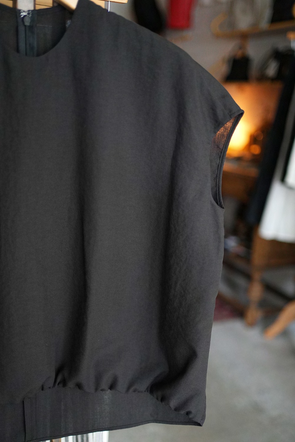 ポリエステル平織ローン生地、光沢なく透け感もない、とても柔らかく着心地良い生地です。フレンチスリーブに近しい肩周りのノースリーブプルオーバー。前裾ギャザーデザイン、後襟部ファスナー仕様。