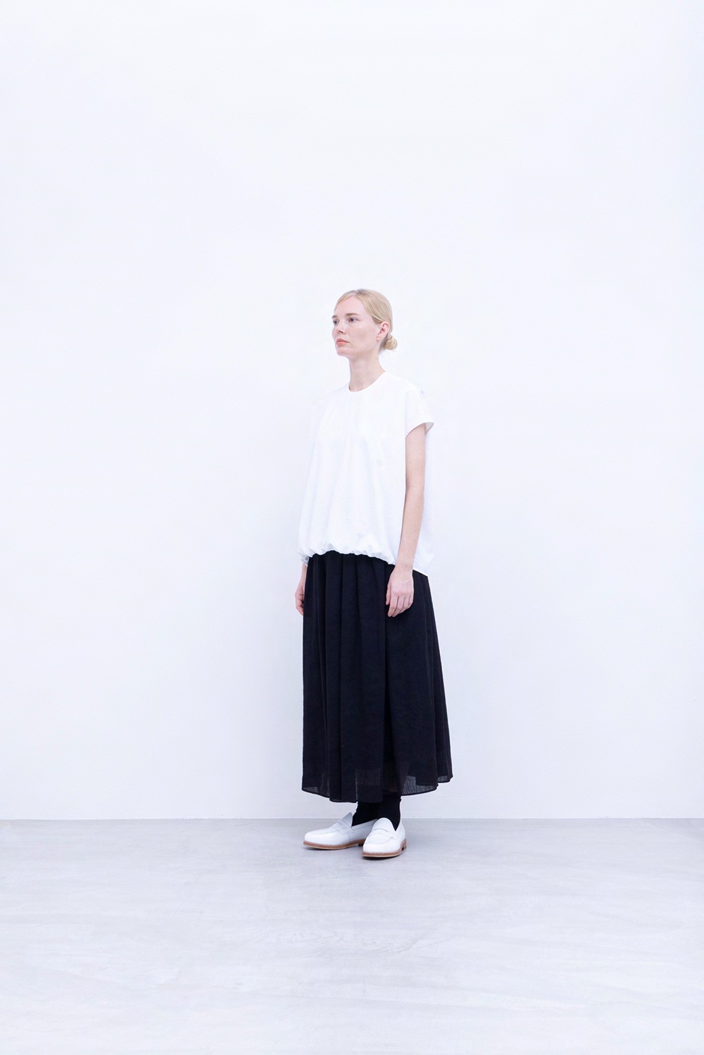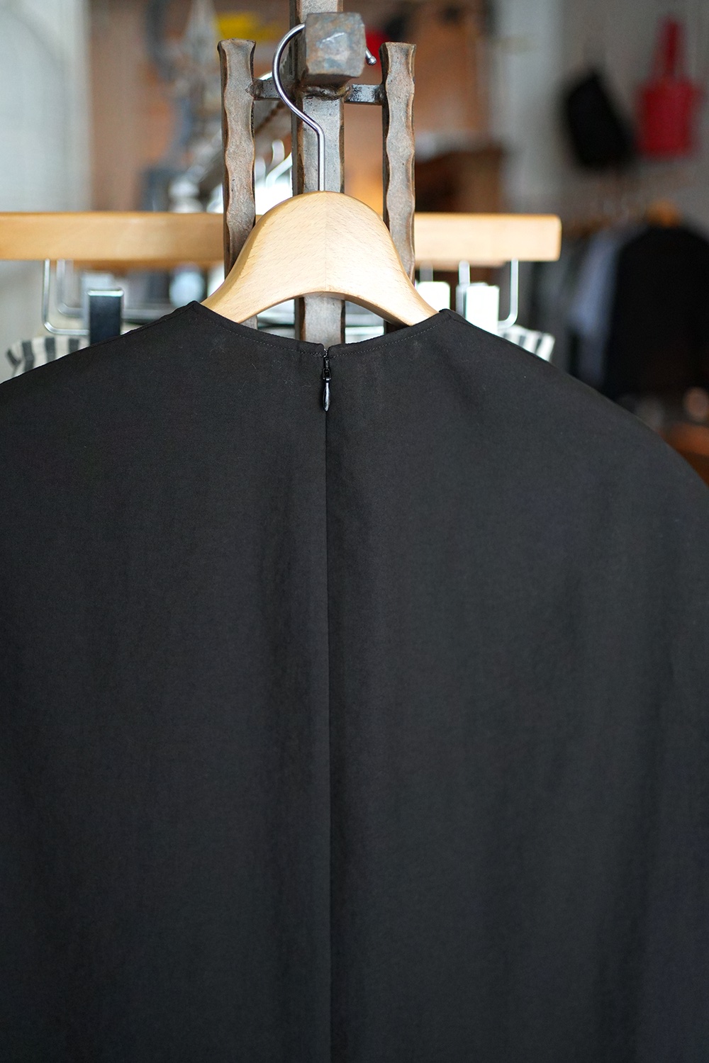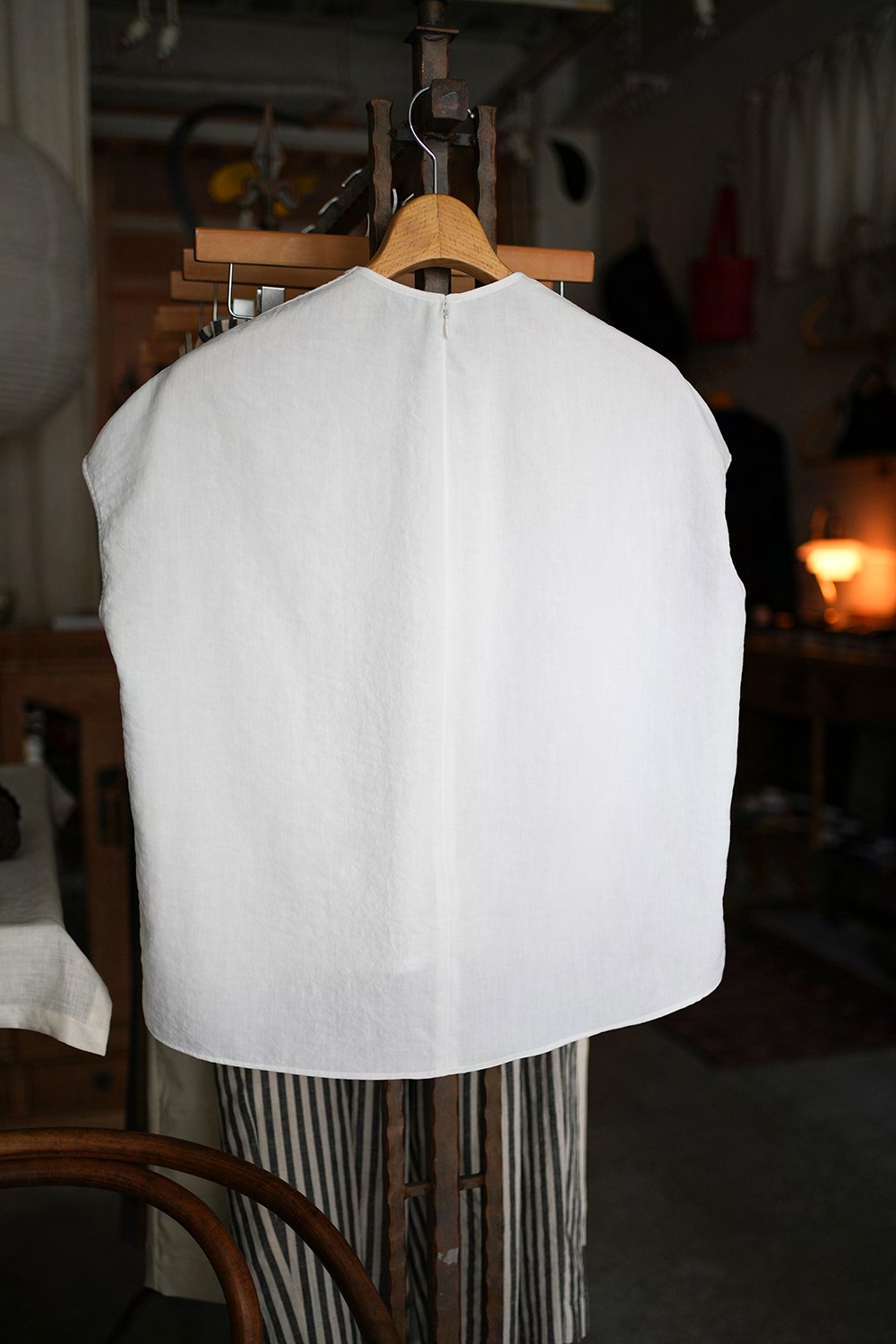 ポリエステル平織ローン生地、光沢なく透け感もない、とても柔らかく着心地良い生地です。フレンチスリーブに近しい肩周りのノースリーブプルオーバー。前裾ギャザーデザイン、後襟部ファスナー仕様。