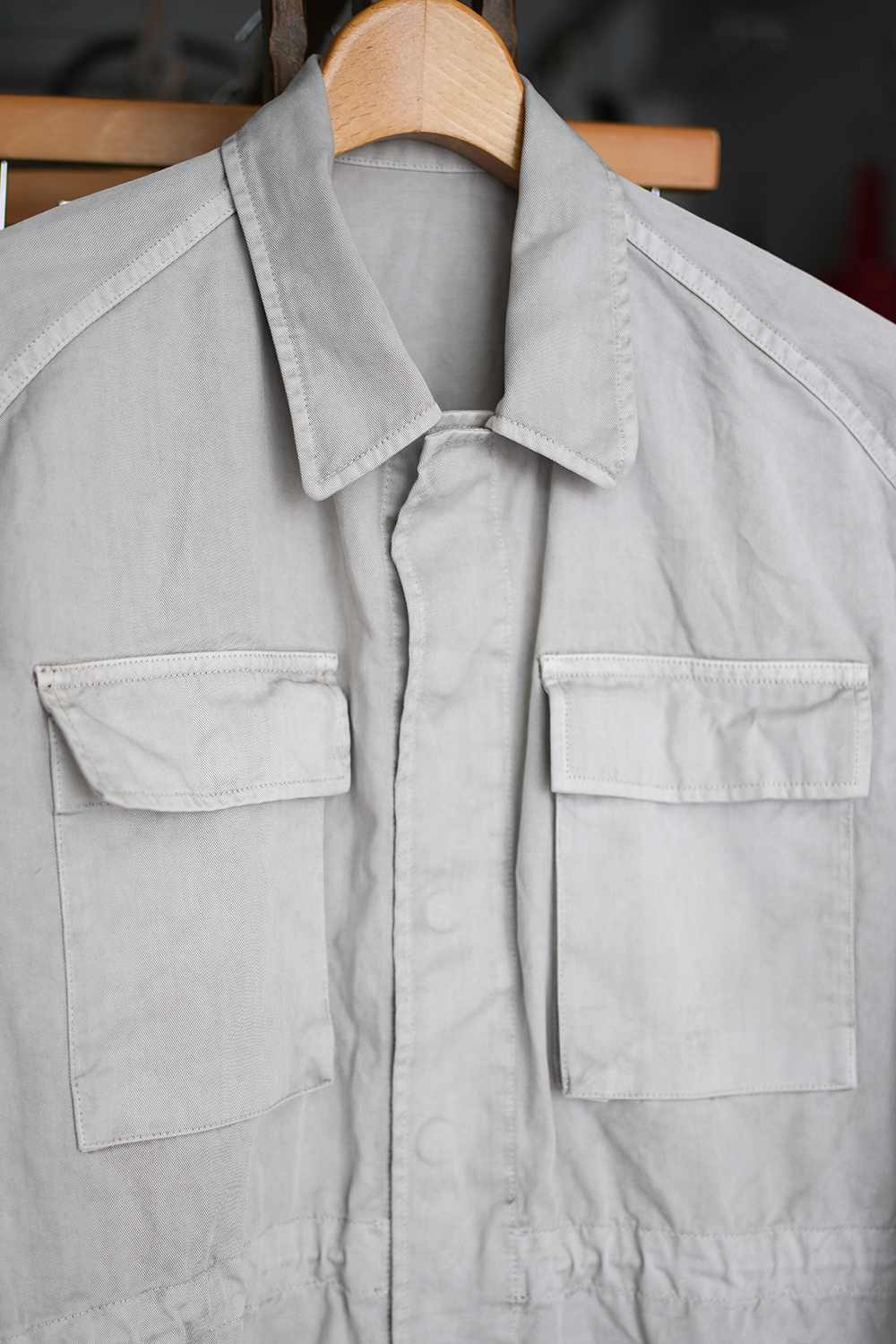 顔料染料で染め上げしっかりとユーズド加工を施したオーガニックコットン生地のミリタリーシャツ。インにもアウトにもレイヤード出来るライトアウターです。ミニマルなデザインかつ上品さ感じる同ブランドらしいユーズドミリタリーアイテム。